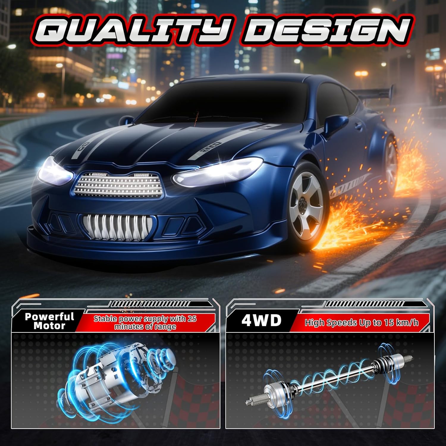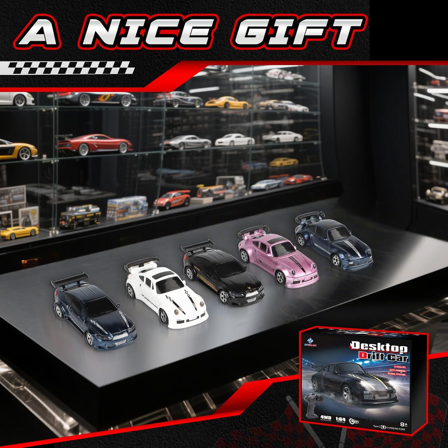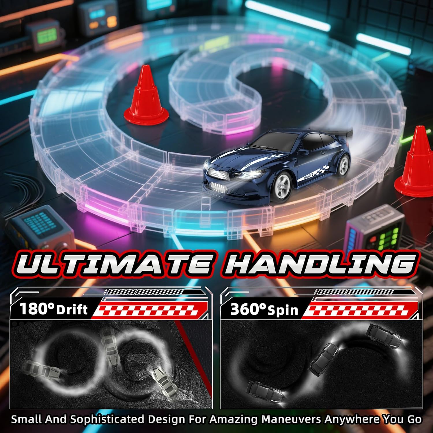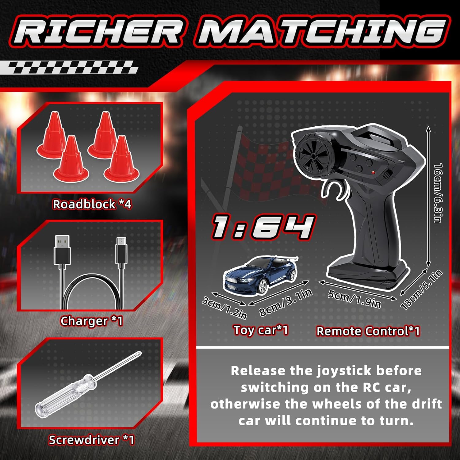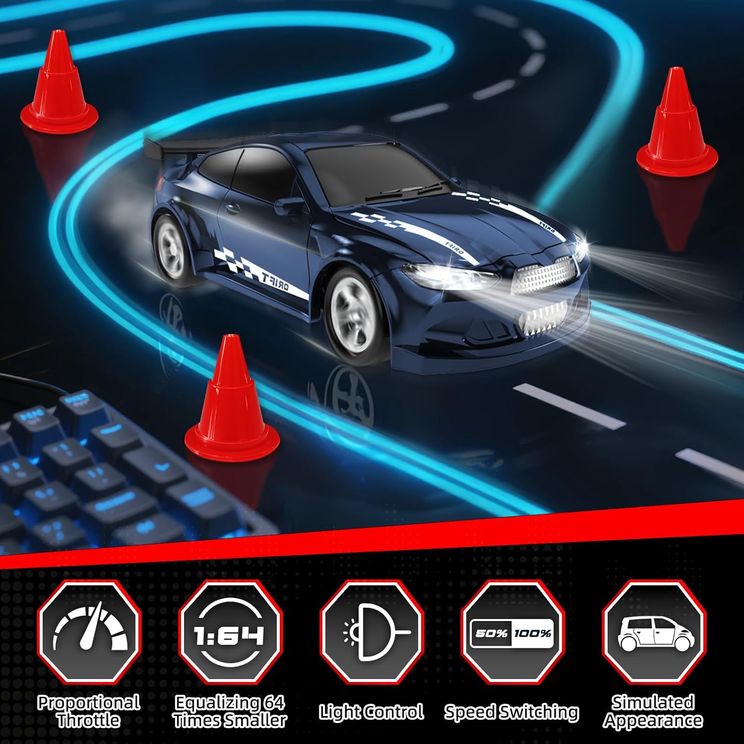 🔥【Stile Cool】 Questa Mini Auto Telecomandata Drift è stata progettata con una simulazione in scala 1:64, replicando perfettamente l'aspetto e i dettagli di una vera auto da corsa. La scocca è realizzata in materiale PVC di alta qualità con eccellente flessibilità e resistenza agli urti. L'auto da drift è dotata di luci che consentono di posizionarla facilmente anche al buio, per un divertimento sia visivo che di controllo! 🔥【Regolazione Lineare della Velocità】 Questa rc drift car 4WD utilizza un design a regolazione lineare della velocità. È sufficiente spingere e tirare la leva del telecomando per regolare con precisione la velocità per un cambio lineare. È inoltre possibile regolare lo sterzo destro e sinistro dell'auto da drifting controllando il telecomando. La regolazione lineare della velocità consente di vivere un'esperienza di drifting più realistica! 🔥【Sistema di Controllo Remoto a 2.4 GHz】 Adotta la tecnologia di controllo remoto ad alta frequenza a 2.4 GHz, controllo a distanza ultra-lunga di 25 metri senza pressione, trasmissione stabile del segnale senza ritardi. L'impugnatura a pistola è facile da afferrare, adatta alle piccole mani dei bambini. Il telecomando supporta la guida in avanti, indietro e a destra/sinistra. Più giocatori possono gareggiare contemporaneamente senza interferire l'uno con l'altro. Il telecomando deve essere abbinato a 2 batterie AA (non incluse). 🔥【Compatto e Portatile】 Questa Micro RC Car misura circa 7.8 x 3.5 x 2.5 cm (3.07 x 1.38 x 0.98 pollici), molto compatta e facile da trasportare. Sia che la si metta in tasca o in borsa, non occuperà troppo spazio. Ciò significa che è possibile iniziare un'avvincente competizione con i propri amici in qualsiasi momento e in qualsiasi luogo, e persino eseguire drifting su un tavolo. L'auto da drift viene fornita con un cavo di ricarica USB Type-C, che può durare fino a 20 minuti con una carica di 25 minuti. 🔥【Il Miglior Regalo】 Questa Mini Auto Telecomandata Drift è un regalo ideale per i compleanni, la festa dei bambini o il Natale, ed è adatta ai bambini dagli 8 anni in su e agli appassionati di auto da drifting. Per rendere l'esperienza del drifting ancora più divertente, l'auto da drift viene fornita con 4 mini barricate per costruire una pista facile. Venite a provare il divertimento delle gare di drifting con la vostra famiglia e i vostri amici!
