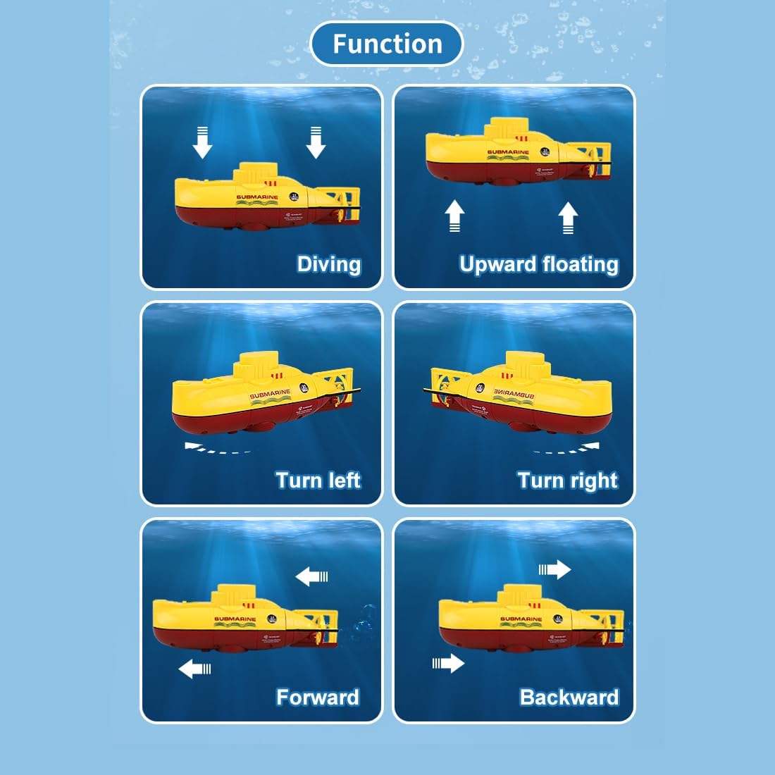 Design subacqueo unico: simula un vero sottomarino con una forma compatta in giallo o blu, perfetto per giocare in acqua estiva e divertirsi esplorazione subacquea in piscine o acquari Controllo flessibile a sei vie: supporta sei direzioni: su, giù, avanti, indietro, sinistra e destra, offrendo manovre stabili e sensibili per una vera esperienza di mini immersioni Galleggiante senza energia: l'innovativa camera di drenaggio consente al sottomarino di galleggiare sull'acqua in modo naturale senza energia, ricreando il vero sistema di galleggiamento sottomarino per un gioco realistico Sicuro e impermeabile: dotato di telecomando impermeabile con antenna facile da installare, elica nascosta per un funzionamento sicuro e spegnimento automatico quando fuori dall'acqua per una maggiore sicurezza Ricaricabile tramite USB: include cavo di ricarica USB per una facile ricarica, supporta più porte, garantendo un tempo di riproduzione più lungo; set completo con telecomando, antenna e presa morbida inclusa