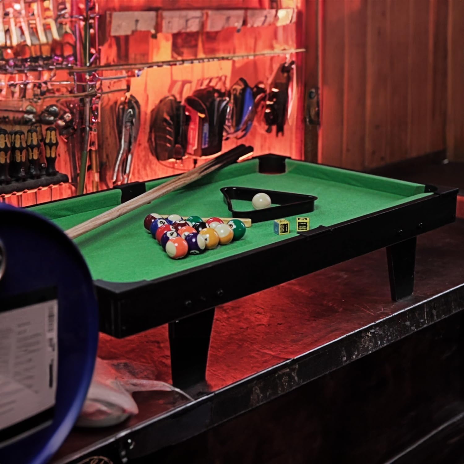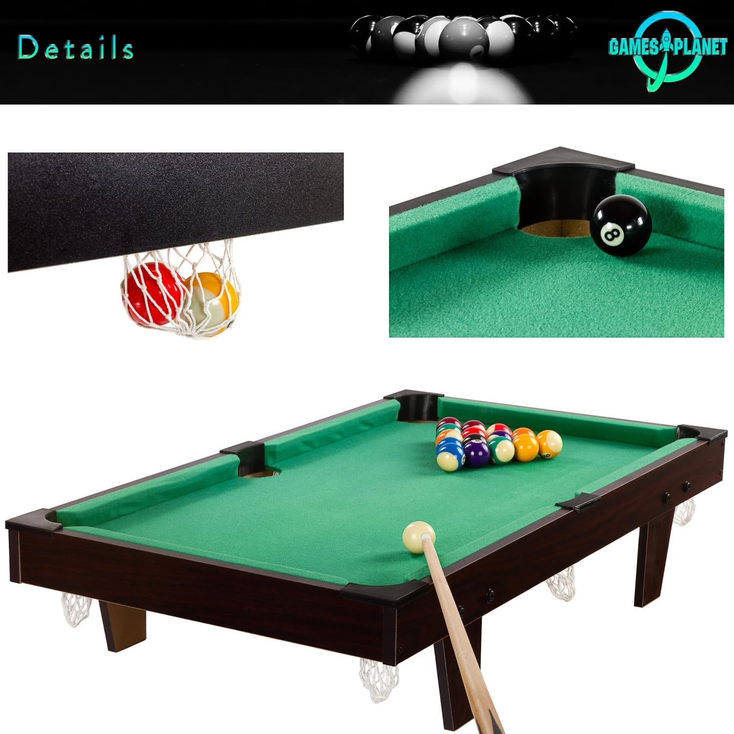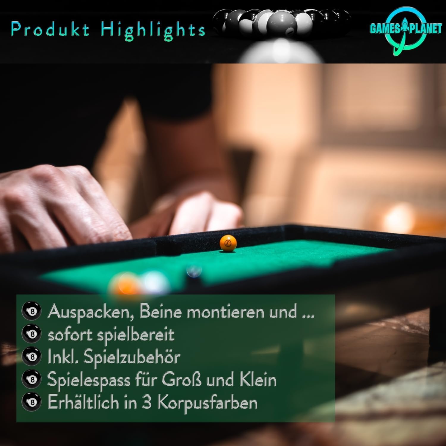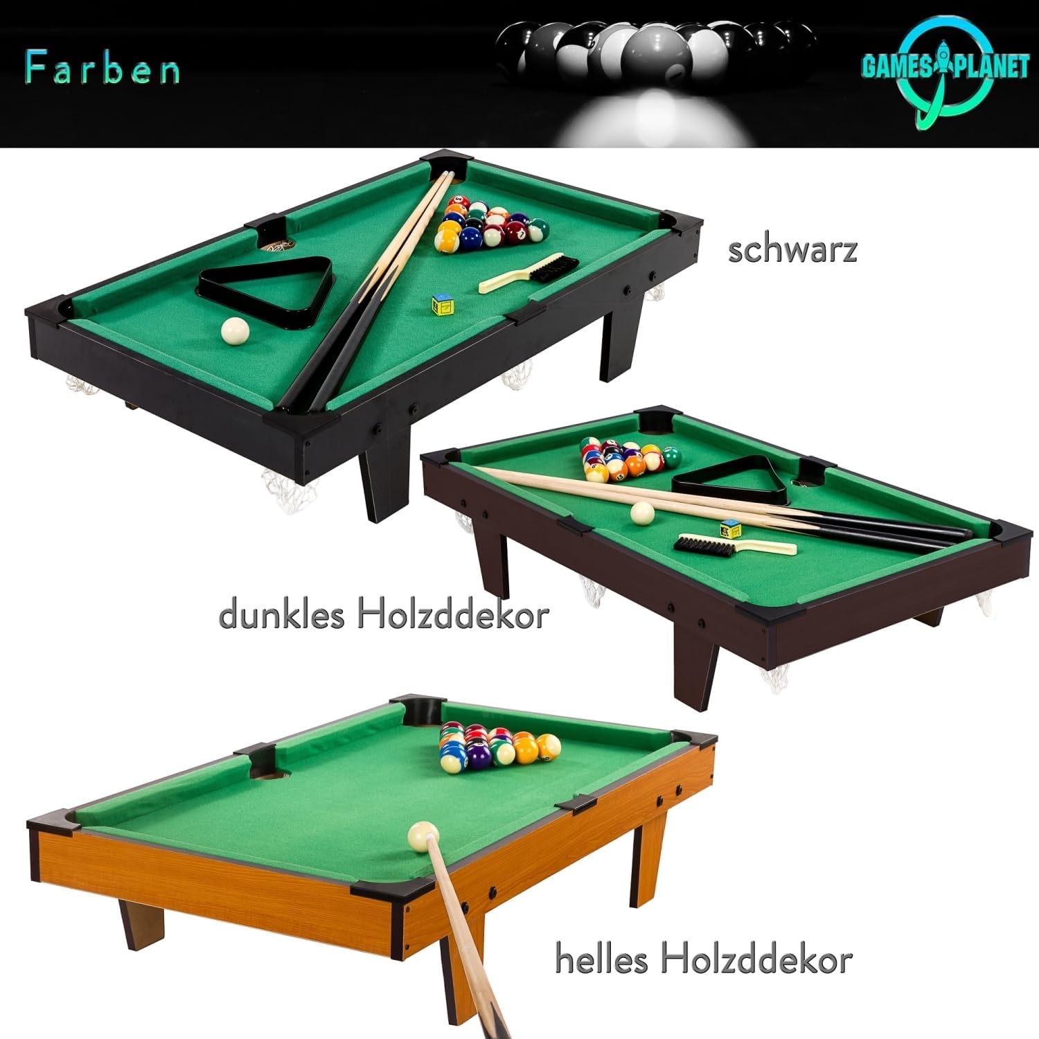 Dimensioni del tavolo da biliardo: ca. 92 cm (L) x 52 cm (L) x 19 cm (A), peso: ca. 8 kg, materiale del corpo: MDF Scelta del colore del corpo: nero / decoro legno chiaro / decoro legno scuro, colore del tessuto: verde Testato per sostanze nocive 6 tasche porta palline Incl. 2 stecche da biliardo, set di bilie, gesso, triangolo, pennello