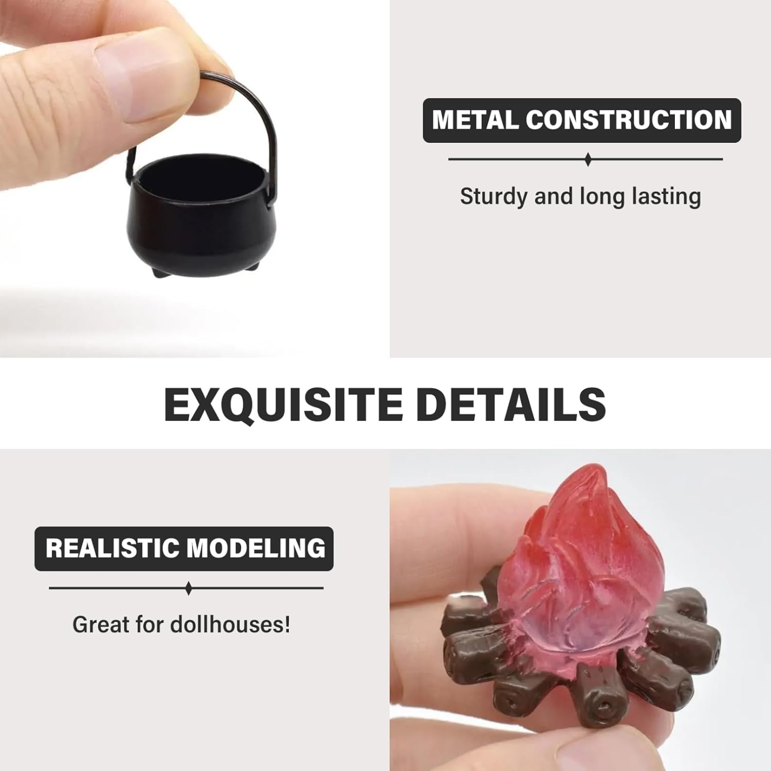 Perfetto per gli amanti della miniatura: una scelta eccellente per gli appassionati di bambole, gli hobbisti o quelli che adorano l'arredamento fantasy, questo mini calderone arricchisce collezioni in miniatura e decorazioni stagionali con la sua parte affascinante e unica. Costruzione di plastica stabile: realizzato in plastica di lunga durata, il calderone mantiene una costruzione leggera ma robusta, garantendo l'uso duraturo in varie impostazioni del display senza la fragilità dei materiali metallici. Autentico design in miniatura: questo mini cauldron in scala 1:12 replica la classica strega e l'estetica di Halloween con caratteristiche dettagliate di falò e tappeto erboso, migliorando l'autenticità della tua scena fata o delle case delle bambole..Perfetto per collezionisti e hobbisti. Conveniente manico e bastoncini di supporto: dotato di una maniglia funzionale e aste di supporto, il calderone è facile da posizionare e aggiunge stabilità, rendendo la configurazione semplice e migliorata la versatilità del display nelle configurazioni in miniatura. Accessorio tematico versatile: ideale per decorazioni di Halloween, accessori per case a tema strega o case fate fantasy, questo calderone nero di stregone serve molteplici usi, scatenando creatività con narrazione in miniatura.