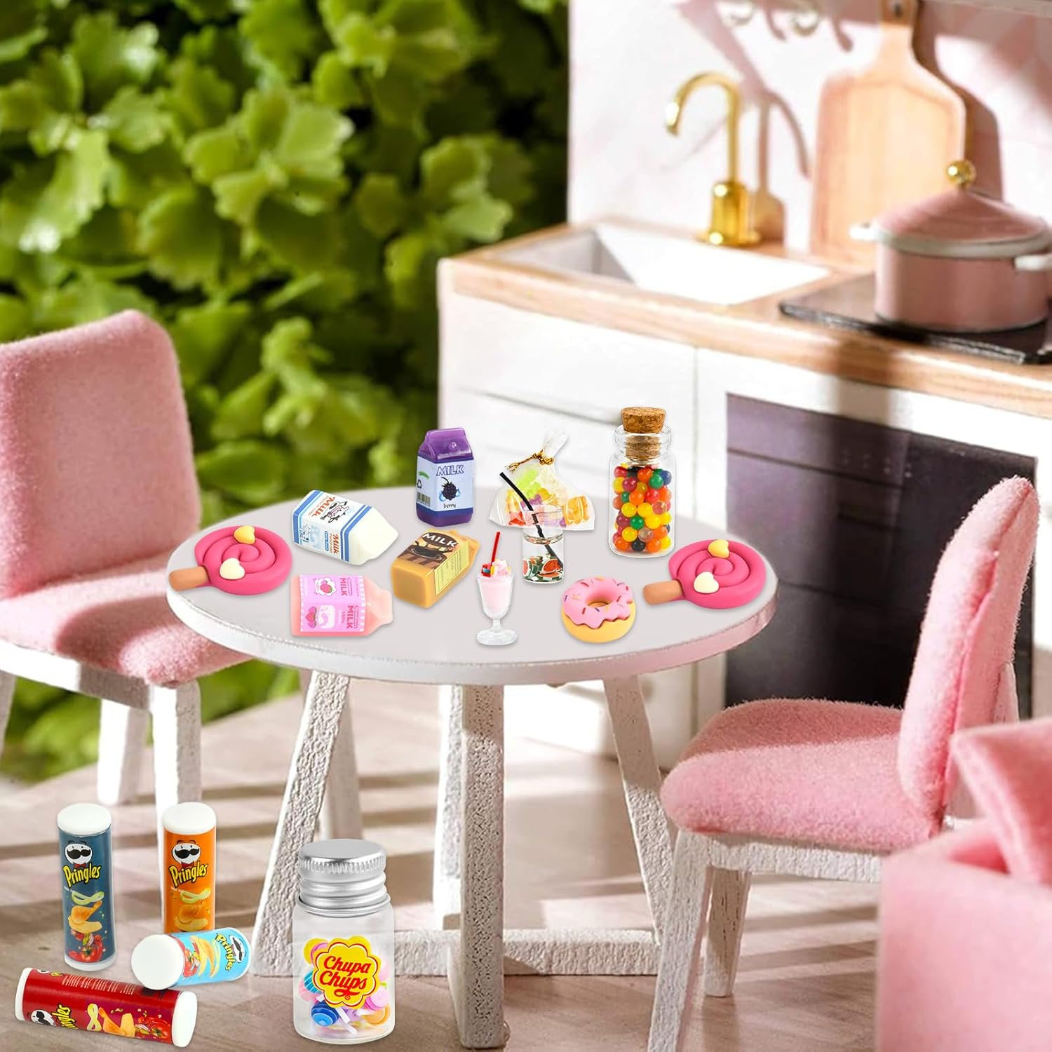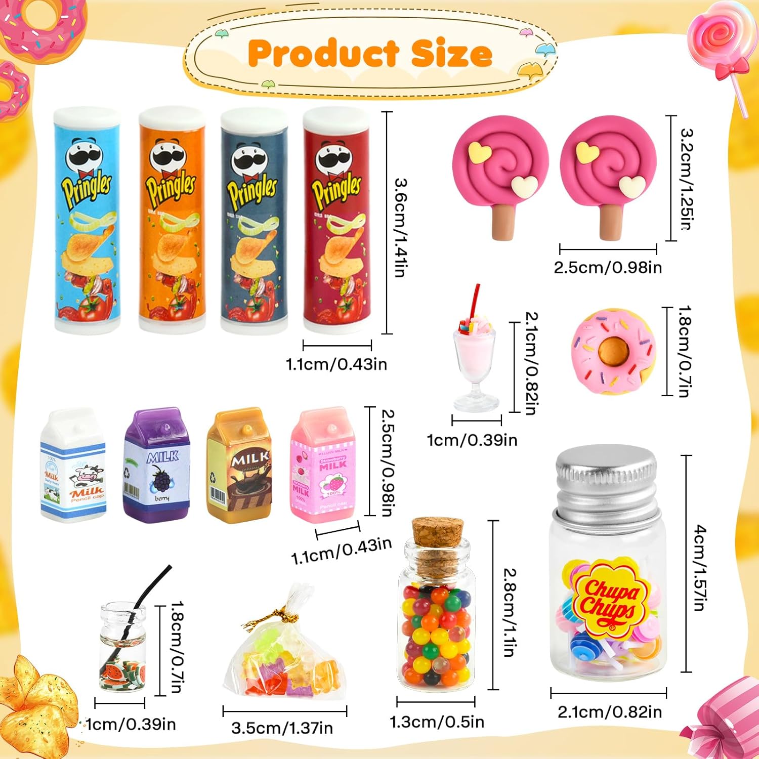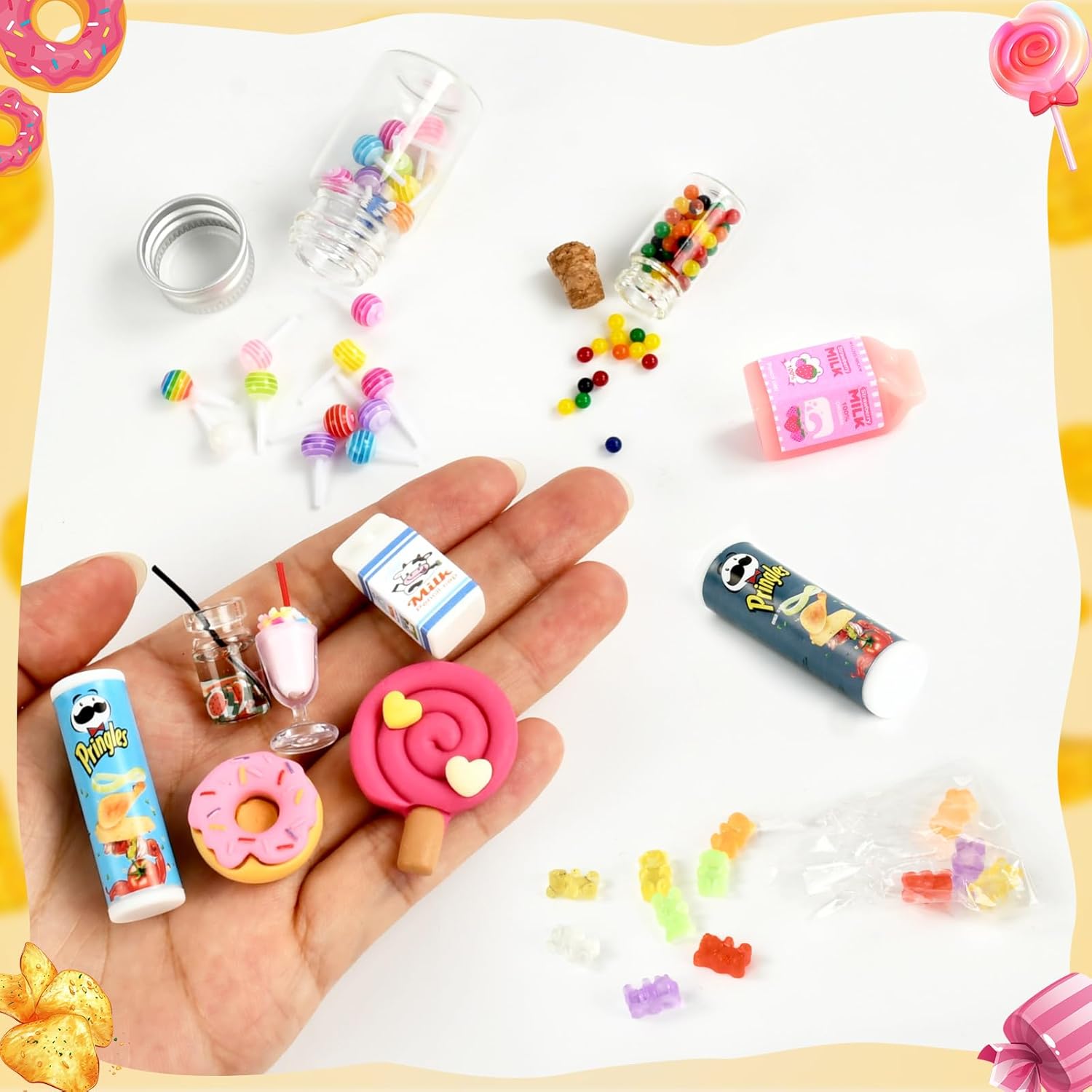 🥫【Set Mini Cibo】Riceverete 4 mini barattoli di patatine, 4 mini latti, 2 mini bevande, 2 mini lecca-lecca in resina, 1 mini barattolo di lecca-lecca (contenente 20 lecca-lecca), 1 mini ciambella, 1 confezione di fudge e 1 bottiglia di chicchi di cioccolato. 🍭【Tanti Mini Alimenti】Tanti mini accessori cibi possono essere utilizzati come accessori per gnomi, accessori per case delle bambole per immergere i giocatori in un gioco di ruolo e stimolare l'immaginazione e le abilità artigianali. 🥛【Materiali Alta Qualità】I mini accessori cibo simulano il design del cibo reale, con dettagli e texture chiare, resistenti all'usura e all'acqua, non facili da danneggiare, offrendo ai giocatori un'esperienza di gioco realistica. 🍬【Ampia Gamma Utilizzi】Il mini cibo è squisito e naturalmente realistico, e può essere collocato anche su scrivanie, banconi, vetrine, piani d'appoggio, piante in vaso e altri luoghi. 🍹【Regali Ideali】Il cibo in miniatura è il regalo ideale per Natale, compleanni e Capodanno per creare il proprio piccolo mondo in una casa delle bambole con le amiche.