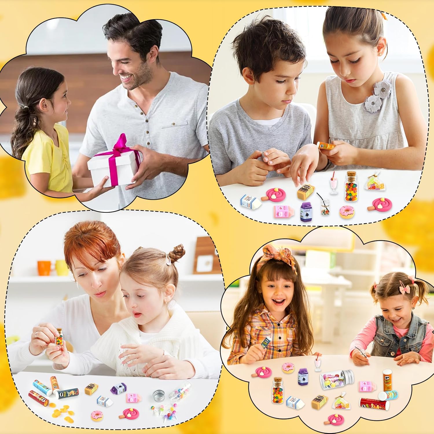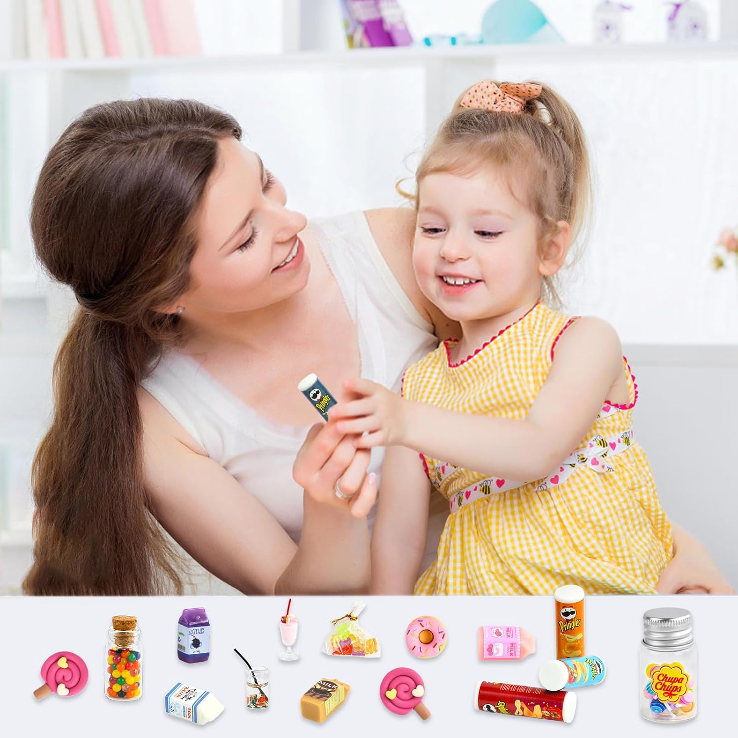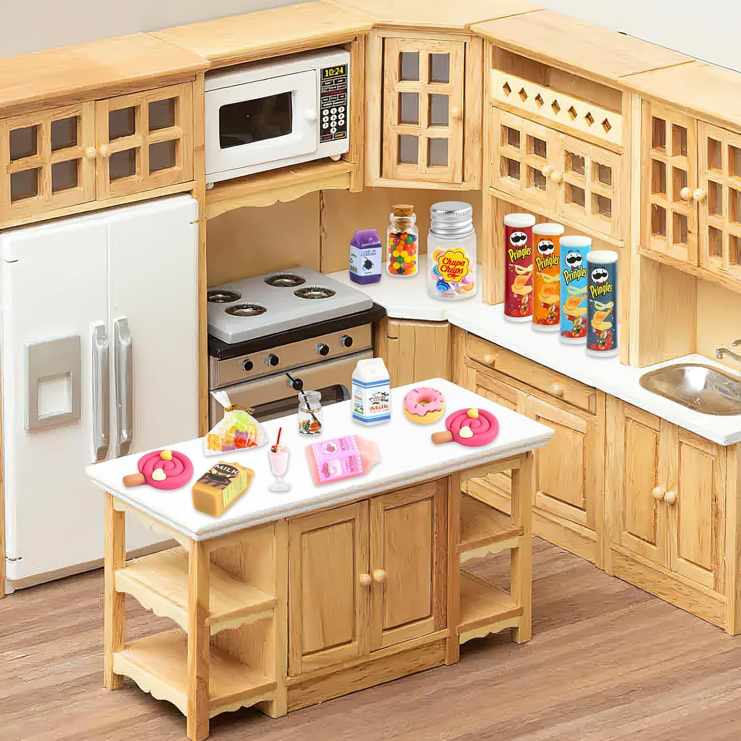 🥫【Set Mini Cibo】Riceverete 4 mini barattoli di patatine, 4 mini latti, 2 mini bevande, 2 mini lecca-lecca in resina, 1 mini barattolo di lecca-lecca (contenente 20 lecca-lecca), 1 mini ciambella, 1 confezione di fudge e 1 bottiglia di chicchi di cioccolato. 🍭【Tanti Mini Alimenti】Tanti mini accessori cibi possono essere utilizzati come accessori per gnomi, accessori per case delle bambole per immergere i giocatori in un gioco di ruolo e stimolare l'immaginazione e le abilità artigianali. 🥛【Materiali Alta Qualità】I mini accessori cibo simulano il design del cibo reale, con dettagli e texture chiare, resistenti all'usura e all'acqua, non facili da danneggiare, offrendo ai giocatori un'esperienza di gioco realistica. 🍬【Ampia Gamma Utilizzi】Il mini cibo è squisito e naturalmente realistico, e può essere collocato anche su scrivanie, banconi, vetrine, piani d'appoggio, piante in vaso e altri luoghi. 🍹【Regali Ideali】Il cibo in miniatura è il regalo ideale per Natale, compleanni e Capodanno per creare il proprio piccolo mondo in una casa delle bambole con le amiche.