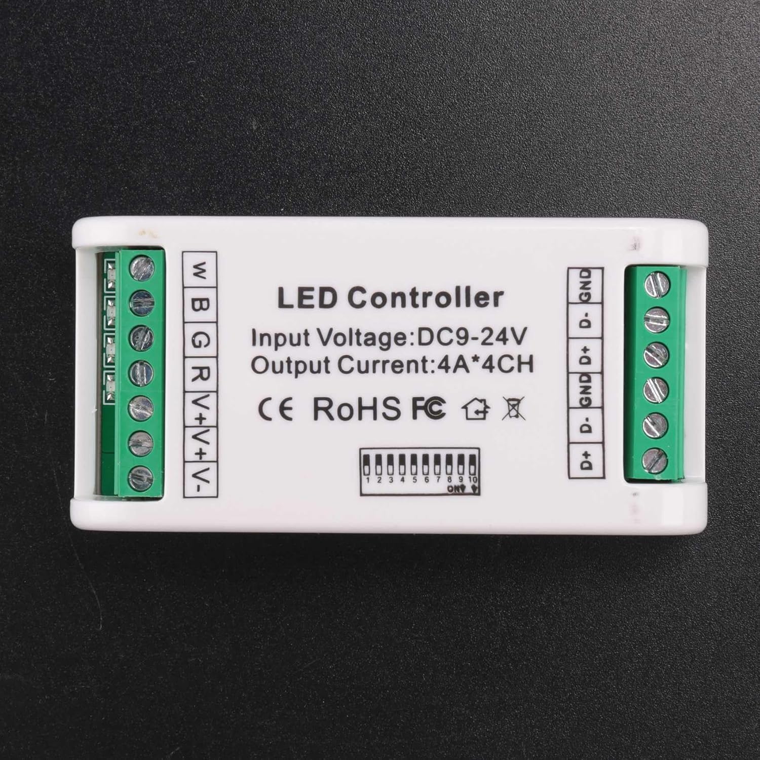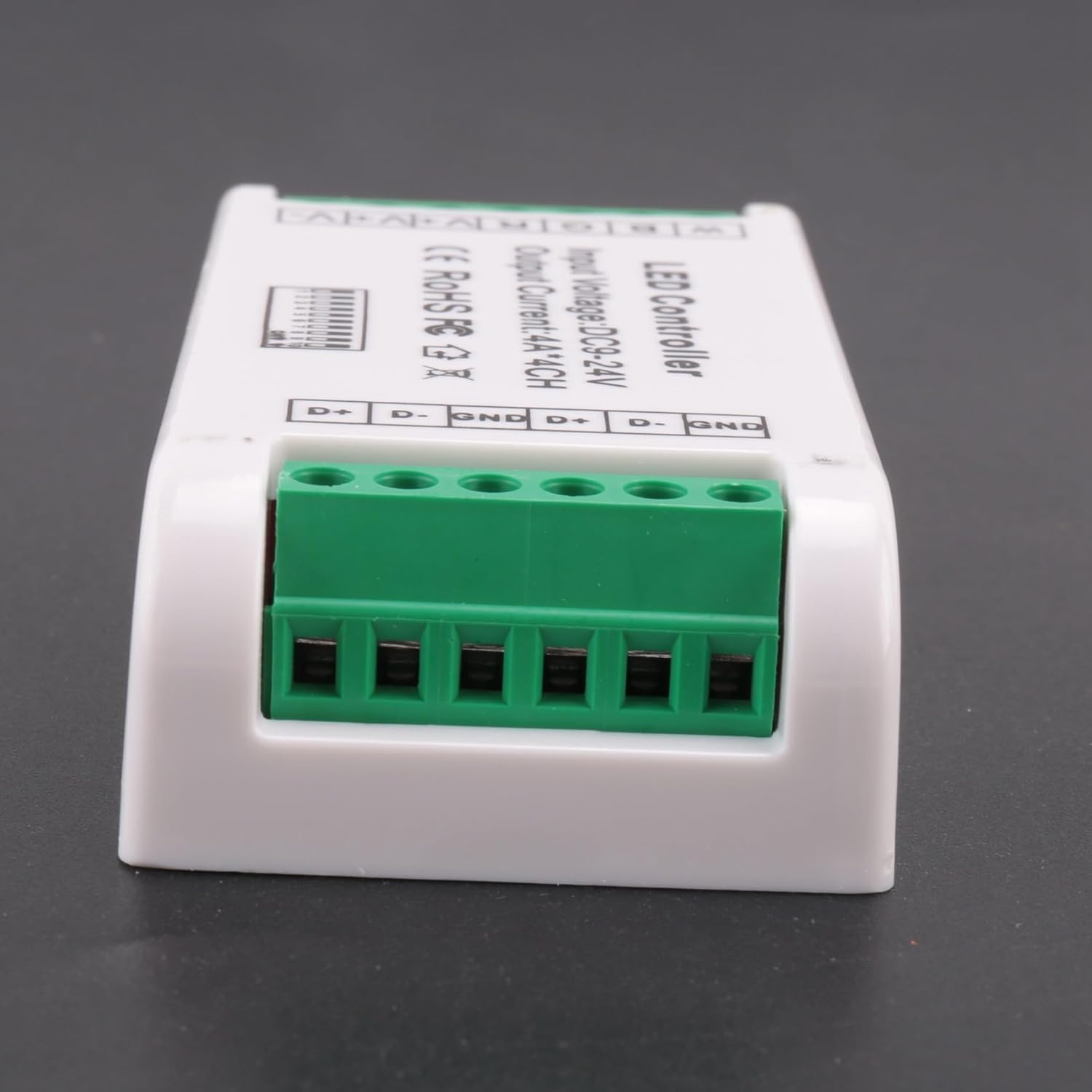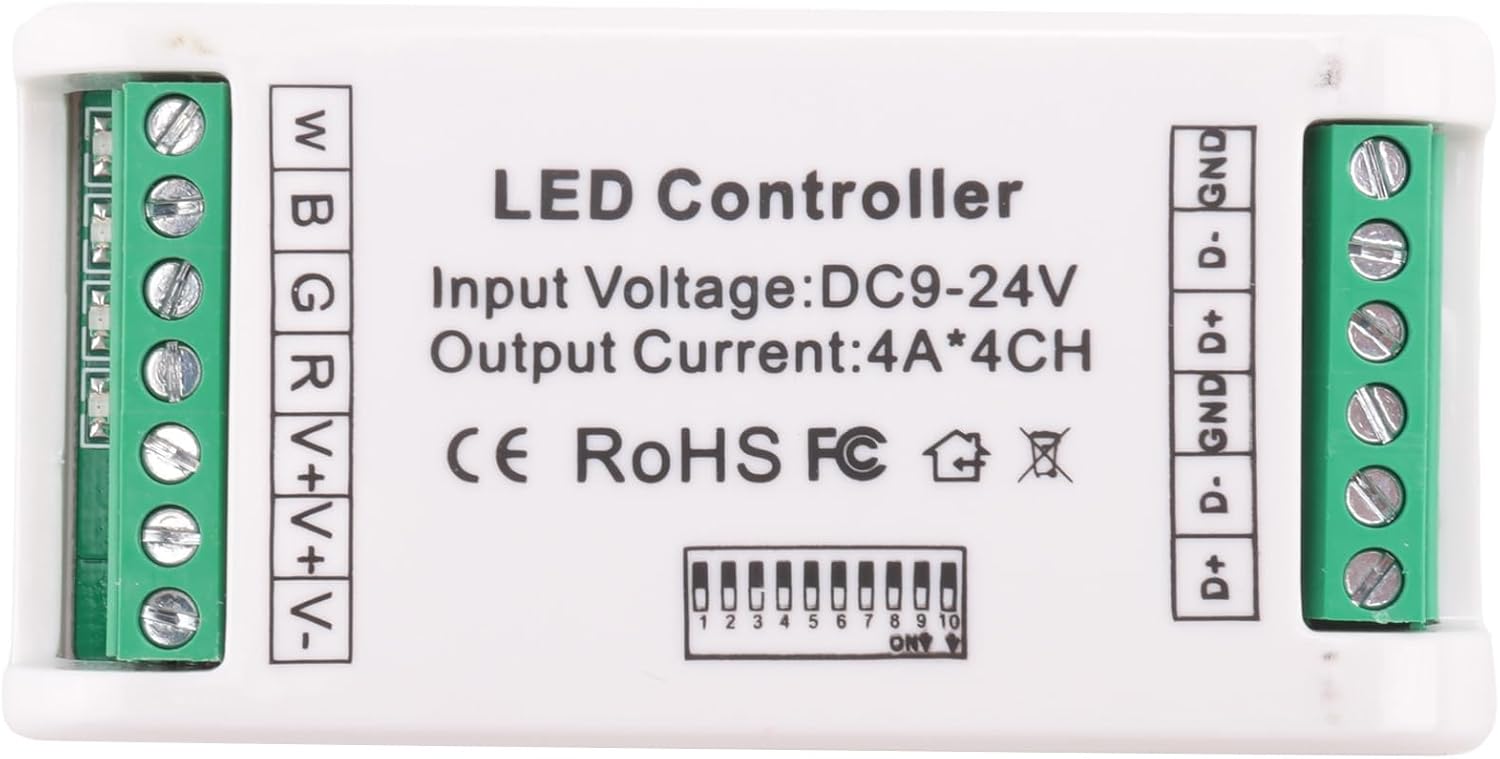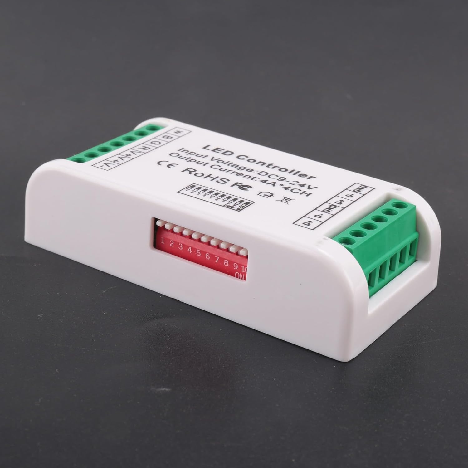L'ingresso si adatta automaticamente a DC9V ~ DC24 V; uscita massima Potenza: 192 W (12 V) 384 W (24 V) Ciascuno occupato da 4 indirizzi . 0-100% di uscita dimmer, ogni canale 256 sfumature di grigio; Ci sono 4 canali di uscita che possono essere collegati a lampade singole o RGBW; Segnale di ingresso: standard DMX512/1990, codice indirizzo impostato tramite interruttore DIP; 4 A per canale max. 16 A, uso per strisce LED, modulo LED, luce LED.