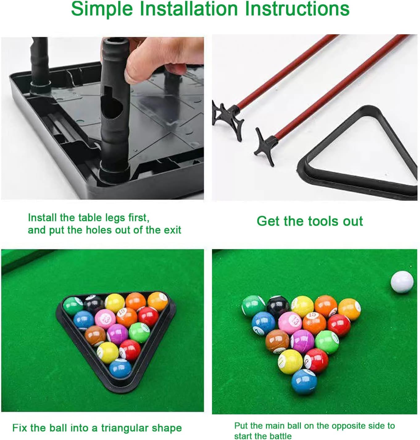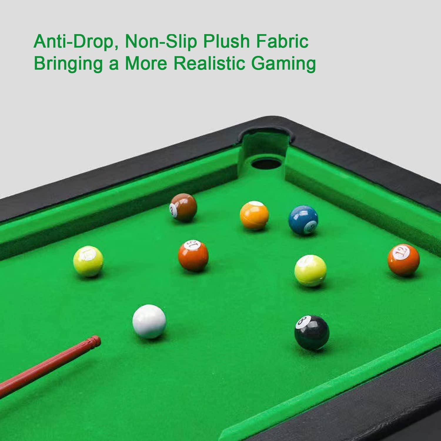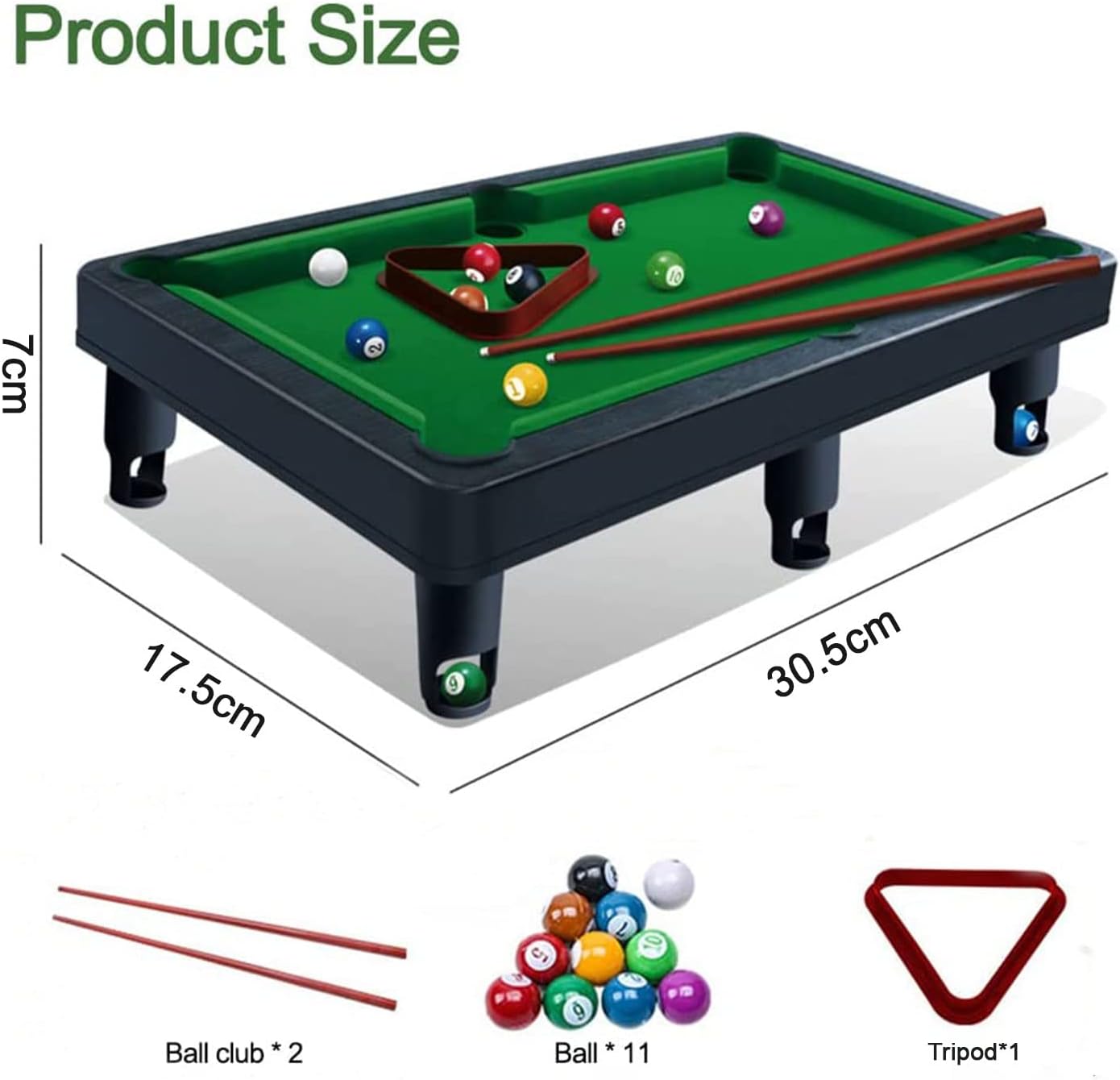 Dimensioni protettive: le dimensioni di questo set da tavolo da biliardo sono 30,5*17,5*7 cm/12*7*2,8 pollici, leggero e di piccole dimensioni, ti offrono comodità da trasportare e giocare ovunque. Questo set da tavolo da biliardo portatile è della dimensione perfetta per risparmiare spazio, ideale per luoghi in cui non hai abbastanza spazio per un tavolo da biliardo di dimensioni standard. Cosa riceverai: questo tavolo da biliardo da tavolo viene fornito con un set completo di accessori da biliardo, puoi divertirti con esso per iniziare il gioco. Il nostro mini set da tavolo da biliardo comprende 11 palline da biliardo, 1 tavolo da biliardo, 1 treppiede e 2 stecche. Fornendo tutto ciò di cui hai bisogno, puoi giocare con la tua famiglia e i tuoi amici in tutta sicurezza. Materiali di qualità: questo set da gioco da biliardo da tavolo è realizzato in plastica ispessita e l'intero tavolo è solido e resistente. Palle da biliardo in resina di alta qualità con lavorazione squisita. Stecca simulata con stampaggio in un unico pezzo e impugnatura comoda. Ti offre un'esperienza di gioco migliore e più realistica. Design sofisticato: il bordo della piscina è più spesso e resistente, con un supporto solido. Il piano del tavolo da biliardo è rivestito con un tessuto felpato antiscivolo selezionato che aumenta l'attrito delle palle da biliardo. Gli angoli del tavolo sicuri e antiurto garantiscono sicurezza durante il gioco. Esistono anche vassoi per palline progettati per ripristinare il realismo del gioco del biliardo, permettendoti di goderti al massimo il gioco. Divertimento per tutte le età: questo gioco da tavolo da biliardo portatile è molto adatto a tutte le età. Il gioco del biliardo aiuta a migliorare la coordinazione occhio-mano e la concentrazione dei bambini, distogliendo l'attenzione dei bambini dai giochi mobili. Per i genitori, una partita a biliardo può aumentare l'interazione con i propri figli. Per gli adulti, i giochi di biliardo sono giocattoli che possono alleviare lo stress.