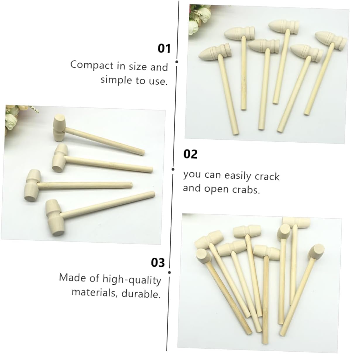 Martello per frutti di mare - I martelli in legno per frutti di mare, crostacei e granchi non sono destinati solo a rompere i gusci di granchi, aragoste e altri frutti di mare, ma possono anche essere utilizzati nella lavorazione della pelle, nella creazione di gioielli, martelli per bambini, martelli giocattolo. essere utilizzato. Martelli in legno per aragosta Giocattoli per bambini - I mini martelli in legno massiccio ti aiutano ad aprire il guscio duro di vari frutti di mare e a goderti il cibo delizioso. Martello per torta in legno - questi martelli in legno possono essere utilizzati anche come giocattoli per bambini e accessori fai-da-te, giocattolo martello per granchio - versatile, questi martelli in legno possono essere buoni strumenti fai-da-te per, mini martello per granchio Mini martello per granchio - realizzato con materiali durevoli che puoi usare, martello di legno