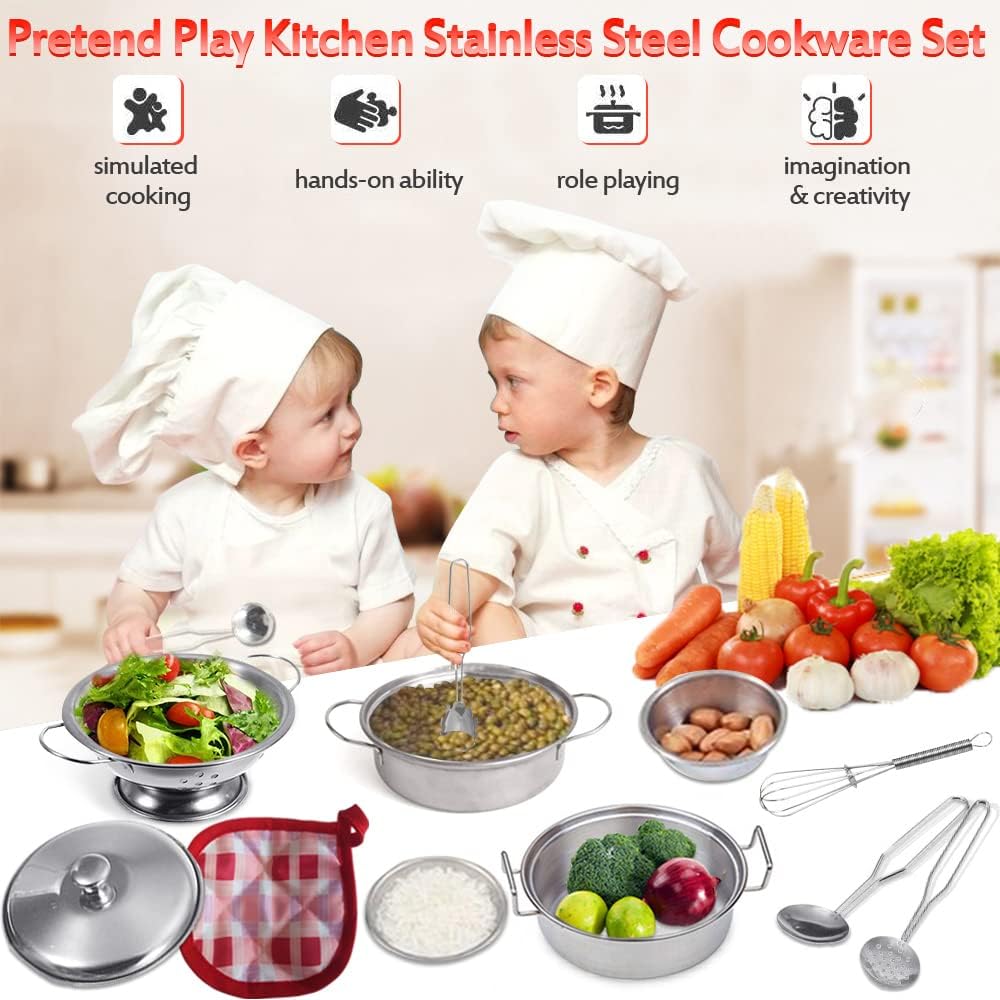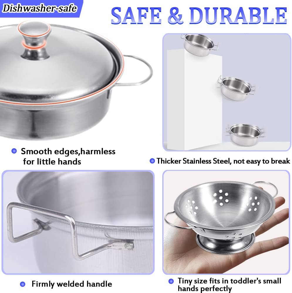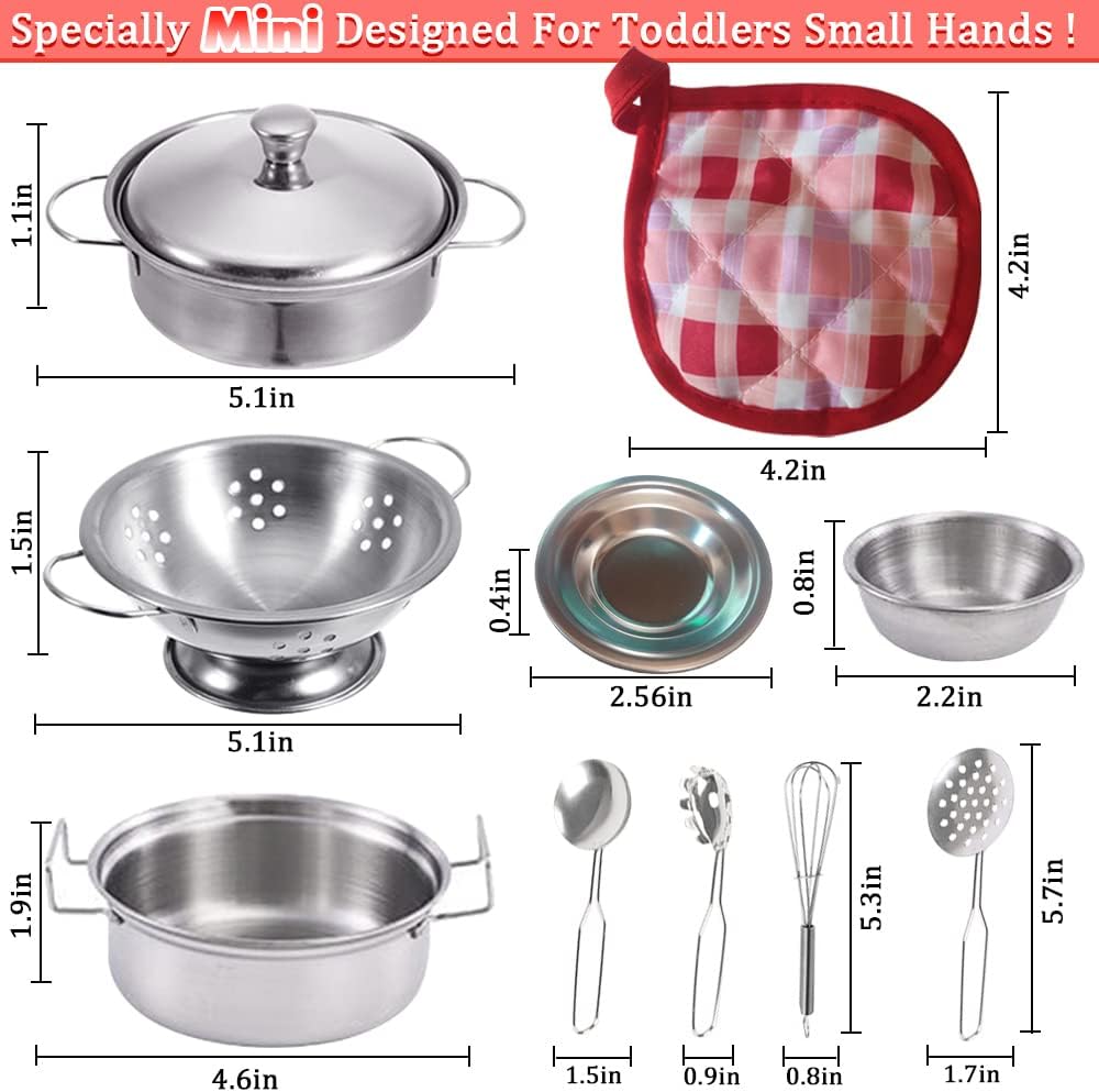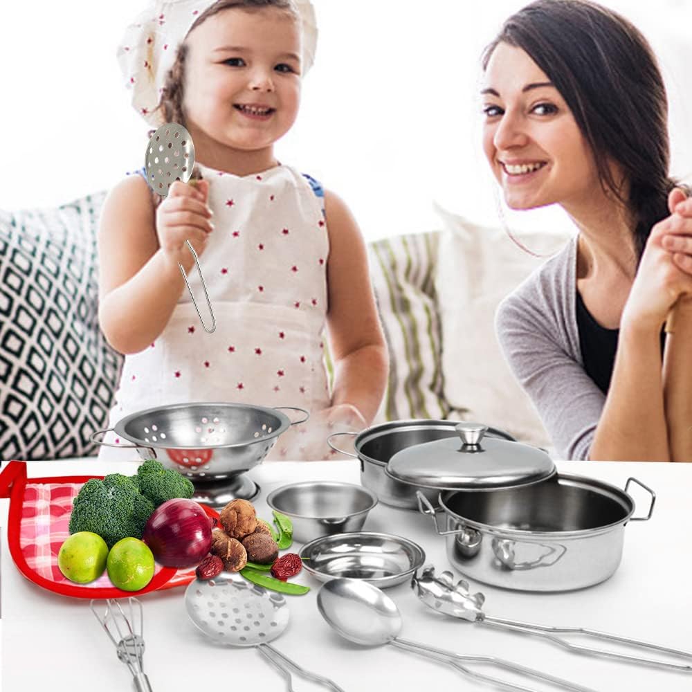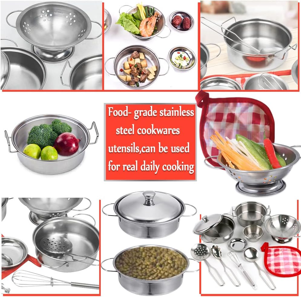 Design perfetto: set classico da cucina per bambini: include pentole e padelle in acciaio inossidabile, piatto per frutta e ciotole per zuppe, piccole ciotole e piattini, tazze, coltelli, cucchiai e bacchette. Sono alloggiati in una scatola portatile robusta e resistente. Soddisfa tutte le esigenze dei bambini che fingono di cucinare. Offri ai tuoi ragazzi e ragazze ore di divertimento in cucina mini esperienze di cucina. La dimensione reale è più piccola di quanto pensassimo due rispetto all'immagine. è stato preso da vicino e mostrare più grande. è arte grafica. Si prega di leggere l'immagine delle dimensioni e acquistare Dimensioni ridotte: progettato con cura per le mani dei bambini e facile da giocare: il nostro set da cucina è realizzato in acciaio inossidabile per uso alimentare lucidato a mano più spesso, che può essere utilizzato come vera tavola nella vita quotidiana. Manico con processo di saldatura, resistente e non facile da rompere. Lavabile in lavastoviglie. Bordi lisci senza innocui per le mani piccole. Piatti molto piccoli, più piccoli di quanto ci aspettassimo. Le dimensioni sono più piccole delle immagini al momento della ricezione della merce. (Noi adulti pensiamo che la taglia sia molto più piccola del normale)】 I dettagli creano acciaio inossidabile di alta qualità: il set di giocattoli da cucina può essere utilizzato in giochi di ruolo da chef, cucina reale e altre scene. Può soddisfare le esigenze di cottura dei piccoli chef. Aiuta i bambini a riconoscere e imparare a utilizzare diversi utensili da cucina e utensili. I bambini possono simulare un processo di cucina, migliorare la coordinazione occhio-mano, la condivisione e le abilità sociali. Rapporto di riduzione realistico: il nostro scintillante set di pentole e padelle per bambini starà benissimo in qualsiasi cucina. Mini formato specifico per i bambini, più facile da afferrare per le mani piccole e più divertente da giocare. Il design Hyper-simulation ripristina completamente le vere pentole da cucina. La migliore aggiunta ai giocattoli da cucina! Il miglior set regalo: il set da gioco da cucina è un regalo ideale per coltivare la creatività e l'immaginazione dei bambini. Perfetto per vacanze, feste di compleanno o regali per ragazzi e bambine.