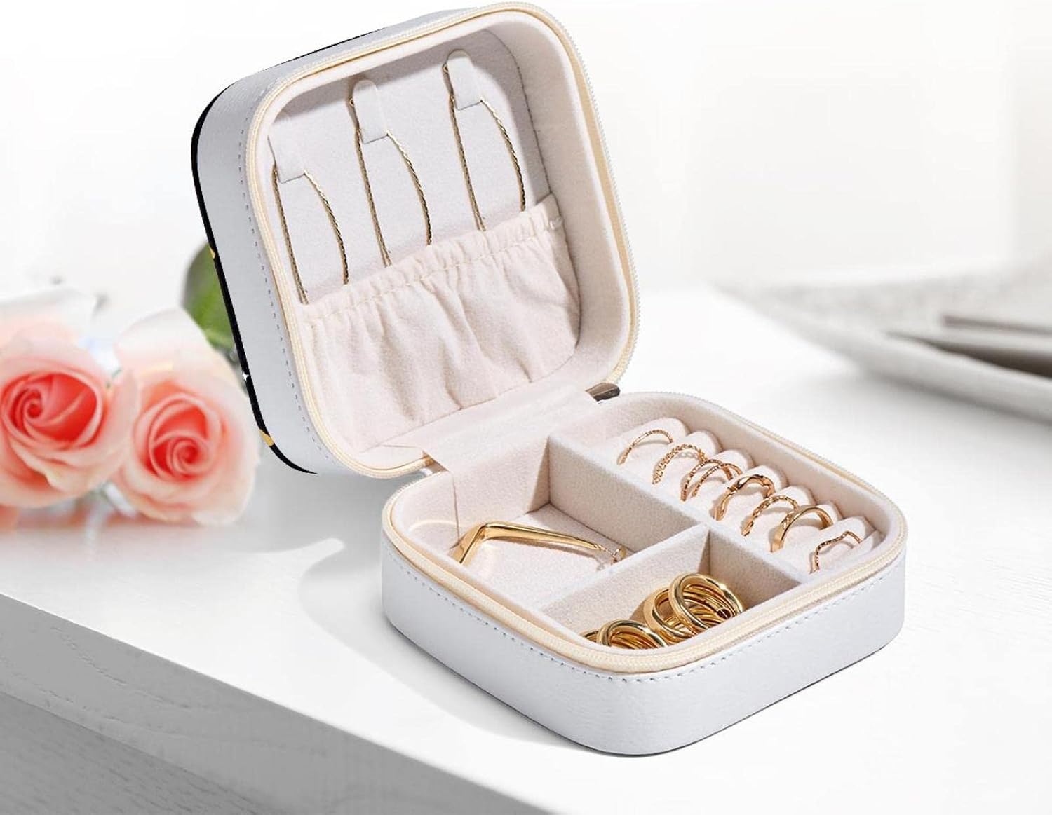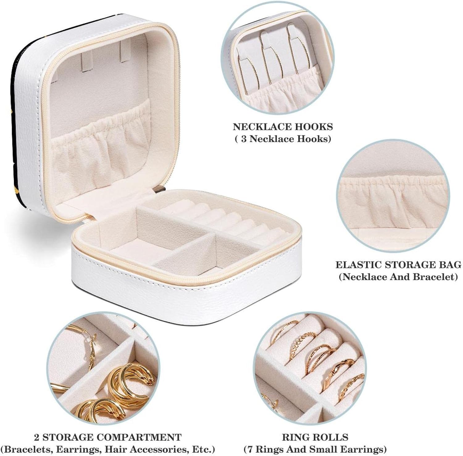 Materiale di alta qualità: avvolto in pelle PU di alta qualità, cerniera liscia per proteggere i tuoi gioielli da danni esterni. Dimensioni da viaggio: 10,5 x 5,8 x 10,5 cm. La scatola multifunzionale per gioielli da viaggio può essere facilmente riposta nella borsa. I gioielli possono essere conservati ordinatamente e non si aggrovigliano. Il corpo compatto è molto adatto per l'uso quotidiano e i viaggi. Tutto in un unico posto: il coperchio superiore ha tre ganci e una tasca elastica per riporre e proteggere la collana. C'è un piatto divisorio e supporti per anelli nella parte inferiore Scatole portaoggetti per organizer: ideali per riporre gioielli tra cui bracciali, orecchini, anelli, collane, pendenti e altri ricordi preziosi. Il regalo di Natale perfetto per le donne: se i tuoi cari amano i gioielli, allora il nostro grazioso portagioielli è il regalo perfetto per loro. I nostri portagioielli sono perfettamente confezionati per essere regalati e sono il miglior regalo per i tuoi amici e i tuoi cari amanti dei gioielli.