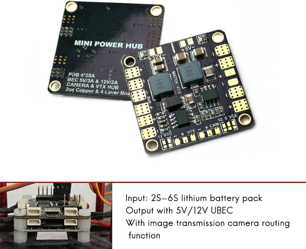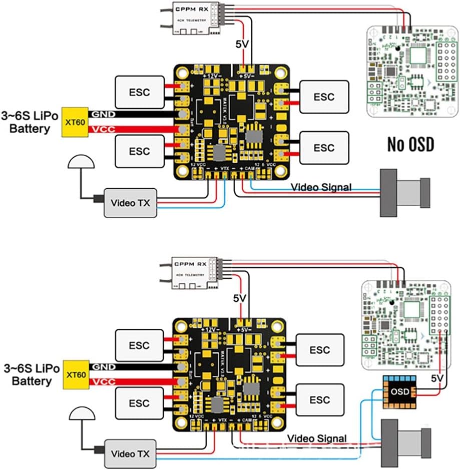 BEC a 2 vie DC-DC verso il basso con bassa ondulazione, 5 V continuamente 3 A, 12 V BEC continuamente 2 A (massimo 3 A, il proprietario del negozio ha misurato 2,5 A continuo e nessun problema). Tensione di uscita per video e fotocamere. Diverse opzioni (VCC, 12 V, 5 V), la dimensione del segnale video è di 30,5 * 30,5. ed è compatibile con i comandi di volo tradizionali come NAZE32, CC3D e F3. I cuscinetti ESC della batteria sono disposti a coppie per facilitare l'incollaggio del filo Colore: come da immagine All'interno e all'esterno del mini distributore ESC 3oz foglio di rame a 4 strati High PCB, tutti i materiali importati, resistenza alle alte temperature, buona dissipazione del calore per garantire il passaggio di grandi correnti, distribuisce la misurazione effettiva di ogni corrente ESC 50A senza problemi. Materiale: lega