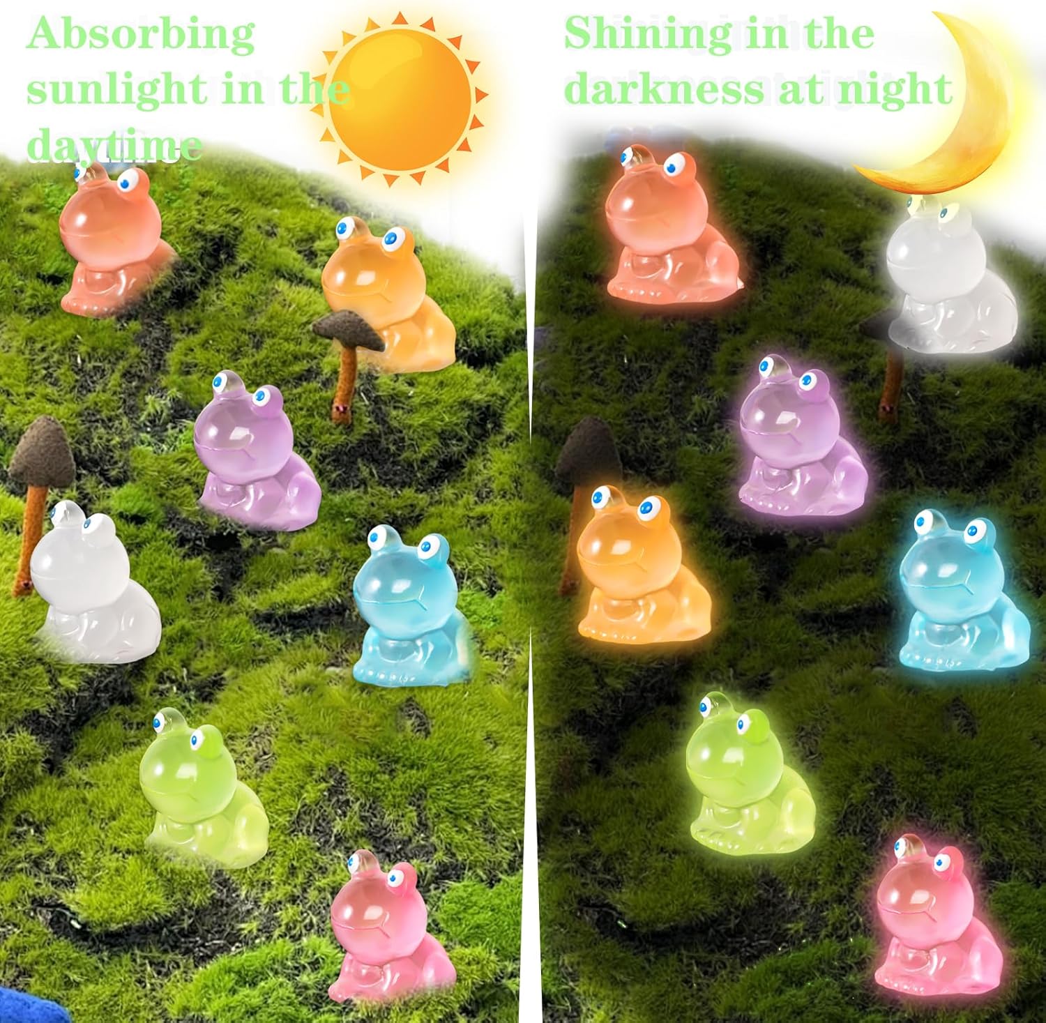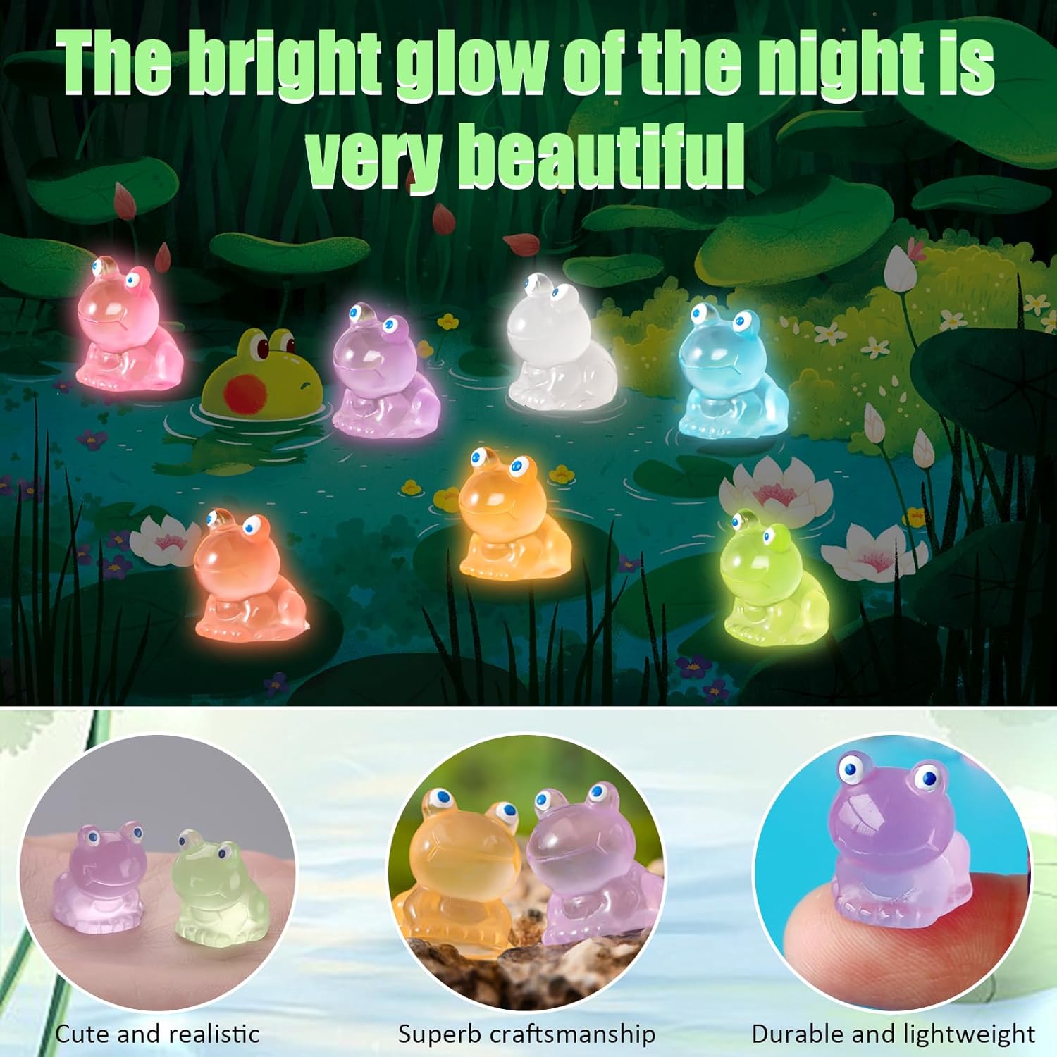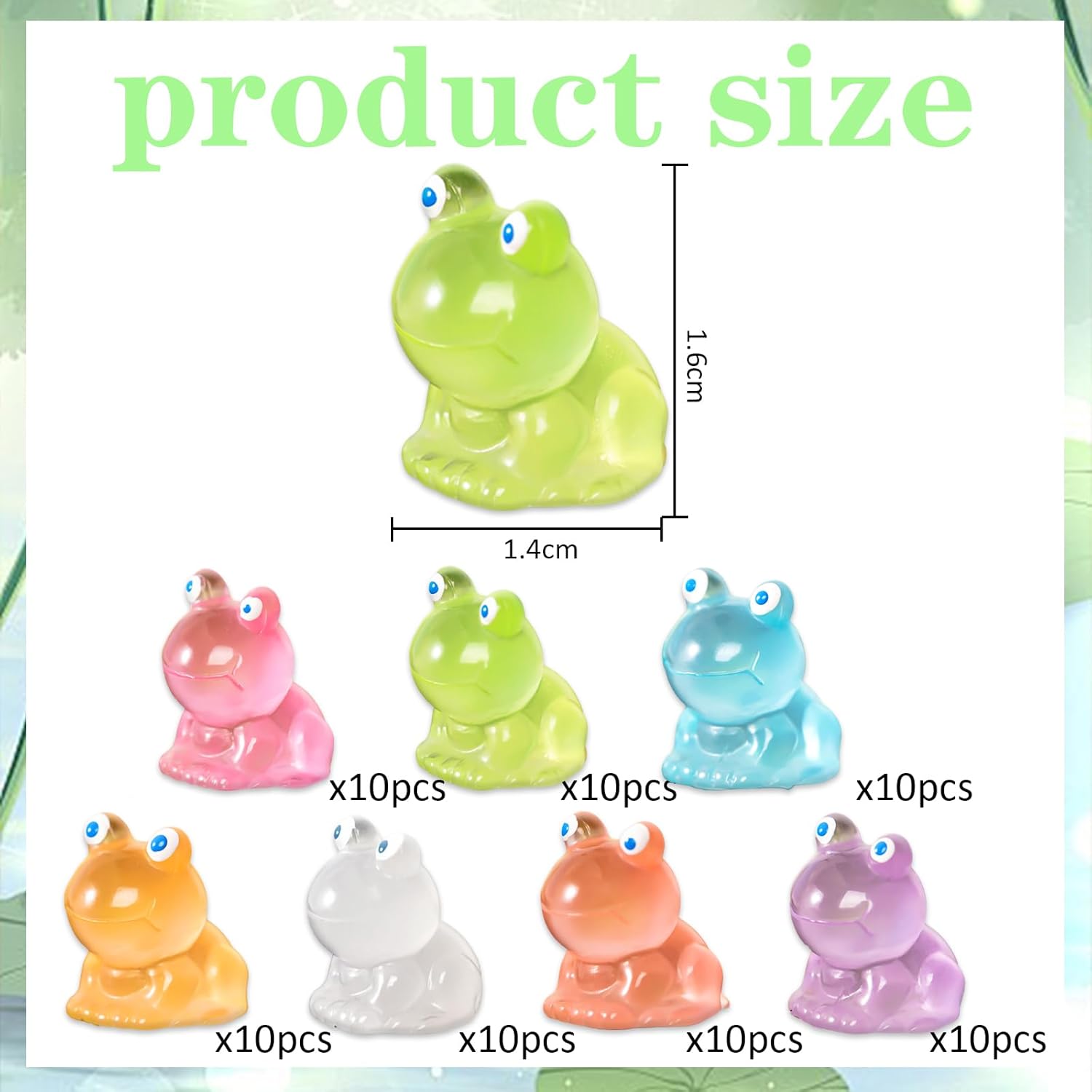 【 Molteplici quantità】: riceverete 70 mini bambole di rana in 7 colori, la quantità e il colore sono sufficienti per soddisfare le vostre diverse esigenze di creazione e decorazione. Le mini rane carine e luminose prestano attenzione ai dettagli e aggiungono un tocco carino al vostro arredamento. Design che si illumina al buio: le mini rane luminose al buio hanno un effetto luminoso unico, durante il giorno assorbono la luce naturale e quando diventa buio, si irradiano, creano un'atmosfera magica nella vostra stanza. Queste decorazioni a forma di rana offrono un'esperienza diversa durante il giorno e la notte. 【Materiale di alta qualità】: le nostre mini rane in resina sono realizzate in resina di alta qualità, sicuro e atossico, robusto e durevole e non facile da trasportare. Colori vivaci, non facile da sbiadire, lunga durata, in modo da poter godere e condividere le vostre creazioni per un periodo di tempo più lungo. Dimensioni adatte: mini rane misura 1,6 x 1,4 cm. Molto realistico e carino, colori vivaci, forme vivaci, piccole dimensioni, facile da trasportare e riporre. Puoi anche posizionarli in un luogo nascosto in modo che la famiglia e gli amici possano trovarli e troveranno una sorpresa. Ampia gamma di applicazioni: queste statuette in resina di piccole dimensioni non sono solo perfette per decorare il vostro acquario, paesaggio da giardino, giardino in miniatura, piante grasse e altri luoghi. Possono essere utilizzati anche per il fai da te per decorare vassoi, lavagni, scrivanie, divani, librerie, scaffali, torte di compleanno, feste con animali o qualsiasi altro luogo speciale nella vostra casa.
