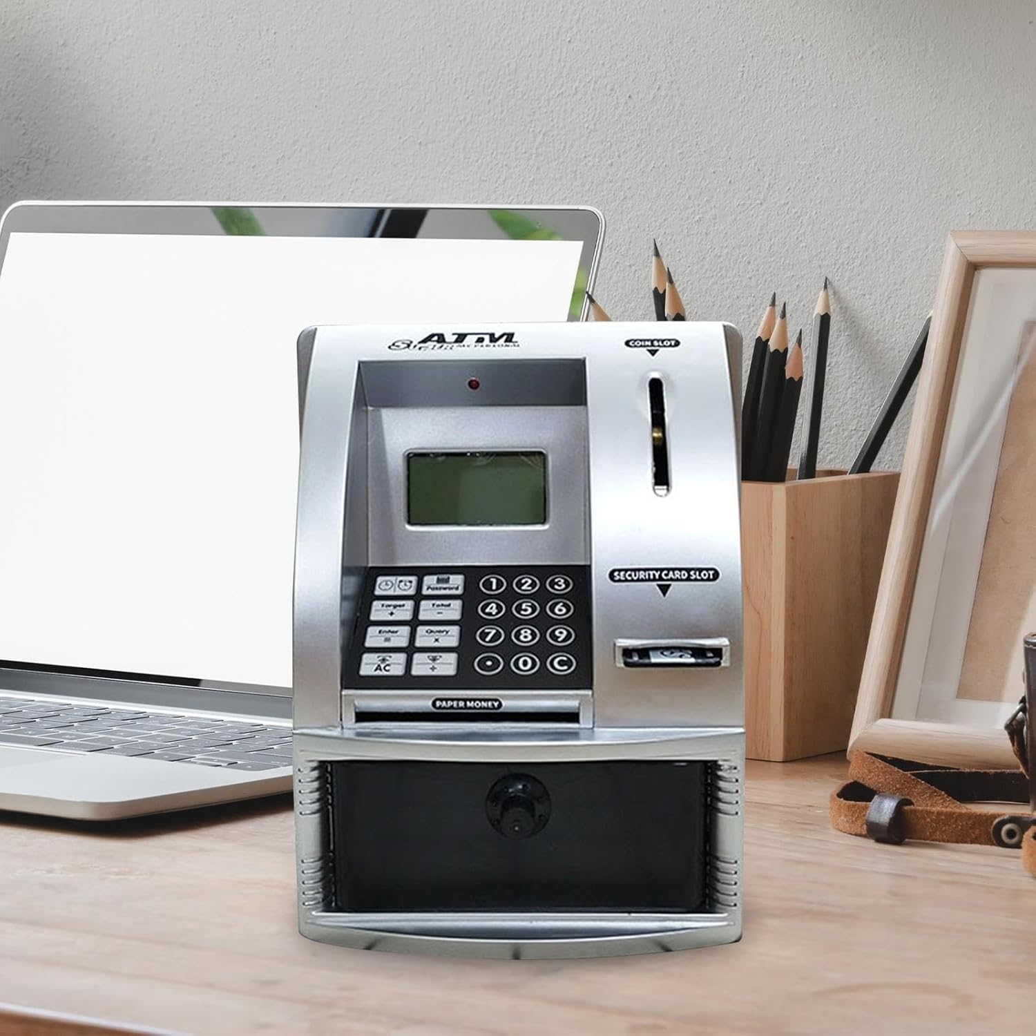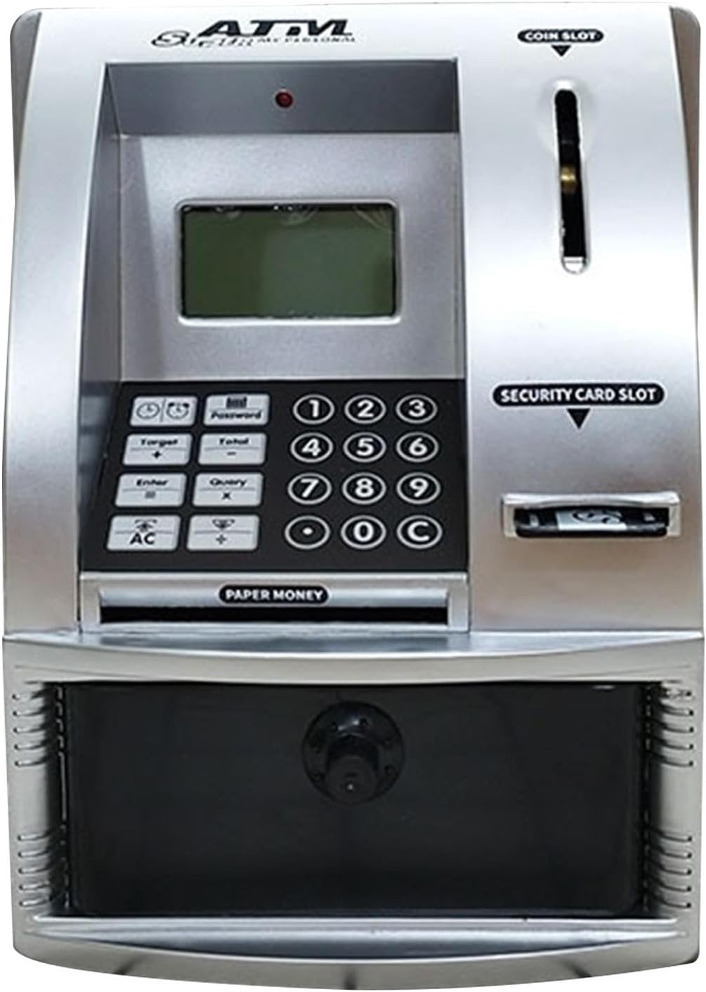 【Funzione di retroilluminazione】 Il giocattolo salvadanaio mini ATM ha una funzione di retroilluminazione di 15 secondi che si accende quando viene premuto un tasto qualsiasi e si spegne automaticamente dopo 15 secondi di inattività. 【Query sul saldo del conto Imposta l'obiettivo del deposito: puoi controllare facilmente il tuo saldo in qualsiasi momento. Inoltre, puoi impostare un importo target di deposito e una data di scadenza per raggiungere questo obiettivo. 【Effetti sonori e regali carini】 La macchina Kid Money Bank ha vari effetti sonori (inserimento/rimozione della carta, apertura del cassetto contanti, conservazione del denaro/modifica della password). È divertente, educativo e insegna l'importanza del risparmio. Anche regali come compleanni per bambini, vacanze di Natale per bambini dai 3 anni in su. 【Salvadanaio multifunzionale per bambini】: questa cassa di risparmio ATM ha una funzione orologio e calendario e una funzione di sveglia giornaliera. Viene utilizzato per immagazzinare denaro tenendo traccia dell'importo. 【Inserimento della carta di protezione con password】 La banca di moneta elettronica per bambini dispone di funzioni di impostazione e sblocco della password per una maggiore sicurezza. Alcune operazioni come depositi (diversi dai depositi), modifiche di ora/data e modifiche della password richiedono l'inserimento di una carta.