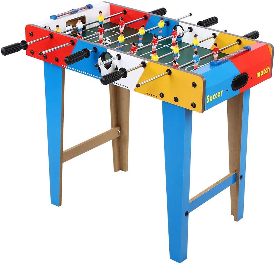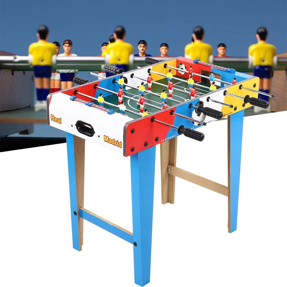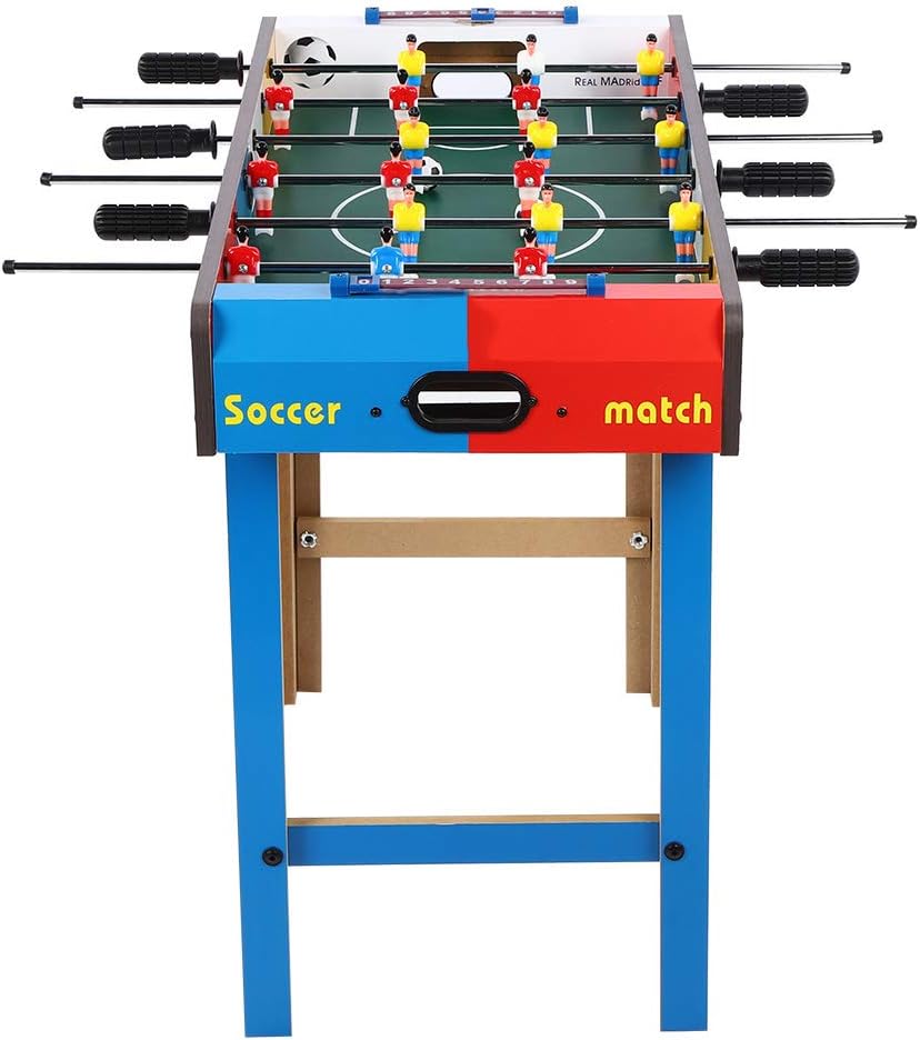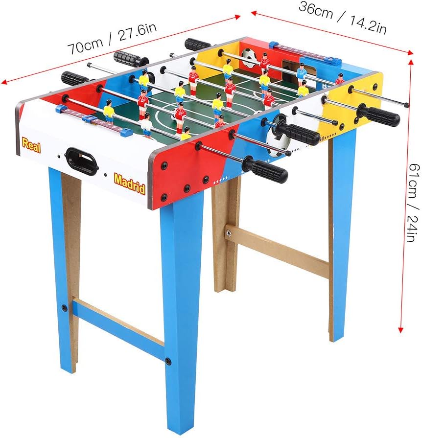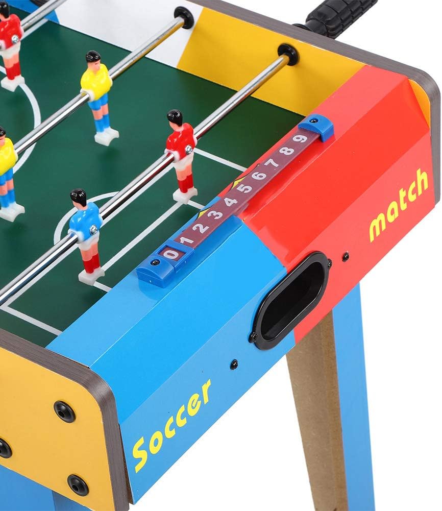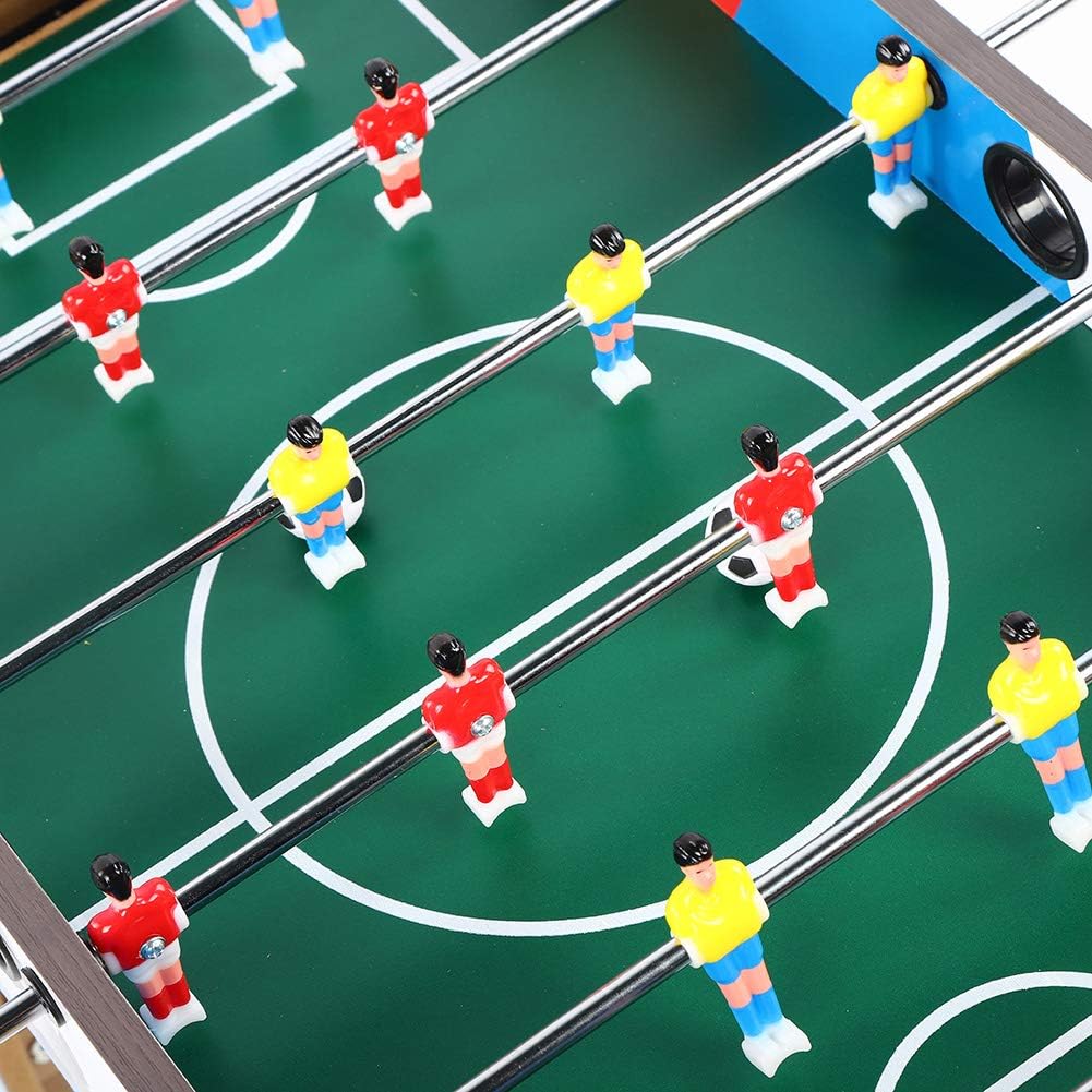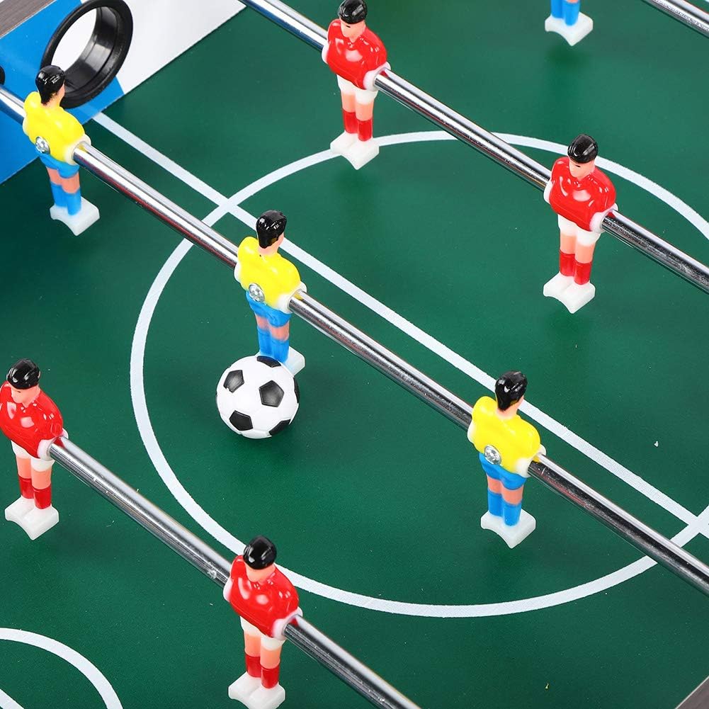 Mini tavolo da calcio, non importa dove ti trovi, puoi goderti il divertimento del calcio. Adotta una robusta struttura in legno e una bordo in acciaio solido, non facile da danneggiare, lunga durata. Il tavolo contiene 6 file, ogni squadra può ospitare 3 file e con 9 giocatori rossi e 9 giocatori gialli. Ogni obiettivo ha una ricerca a sfera interna e ha anche un marcatore di slitta di plastica. Dotato di tazze a sfera per facilità d'uso. Piatto di gambe unificato progettato e chiavi per gambe su ciascun lato.