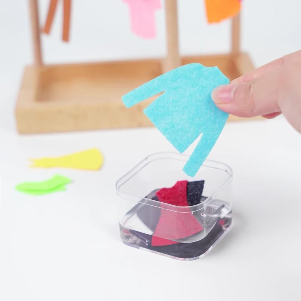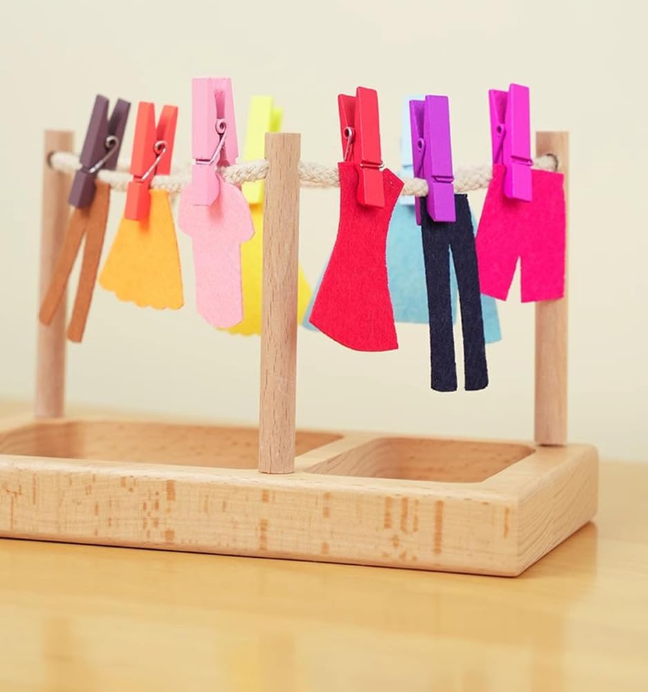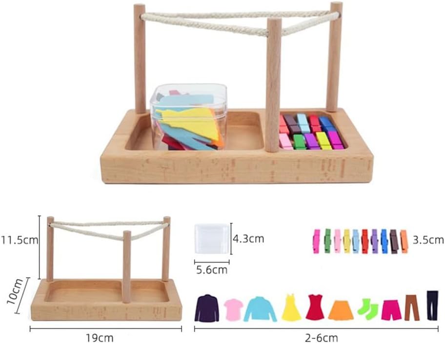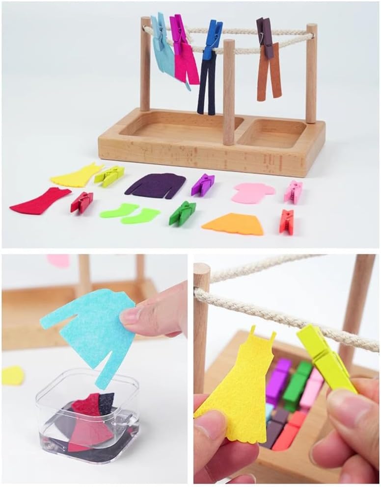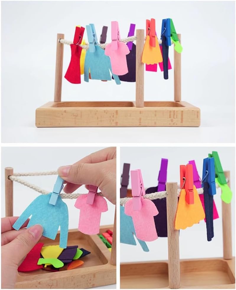 Mini stendibiancheria Montessori - Adatto a bambini dai 2 ai 6 anni, li aiuta a praticare la coordinazione occhio-mano, la percezione visiva, le capacità di risoluzione dei problemi, ecc. Prima dell'operazione, puoi bagnare i vestiti per simulare una scena reale. Dopo l'intervento chirurgico, metterli in un luogo ben ventilato ad asciugare naturalmente. . Allo stesso tempo, tu e i tuoi bambini potrete osservare i cambiamenti nei vestiti durante il processo di asciugatura. I genitori possono preparare carta, penne e forbici e lasciare che i loro figli disegnino da soli vestiti in diversi colori e stili. . Questo non solo può coltivare l'immaginazione e l'abilità pratica dei bambini, ma anche arricchire lo stendibiancheria.