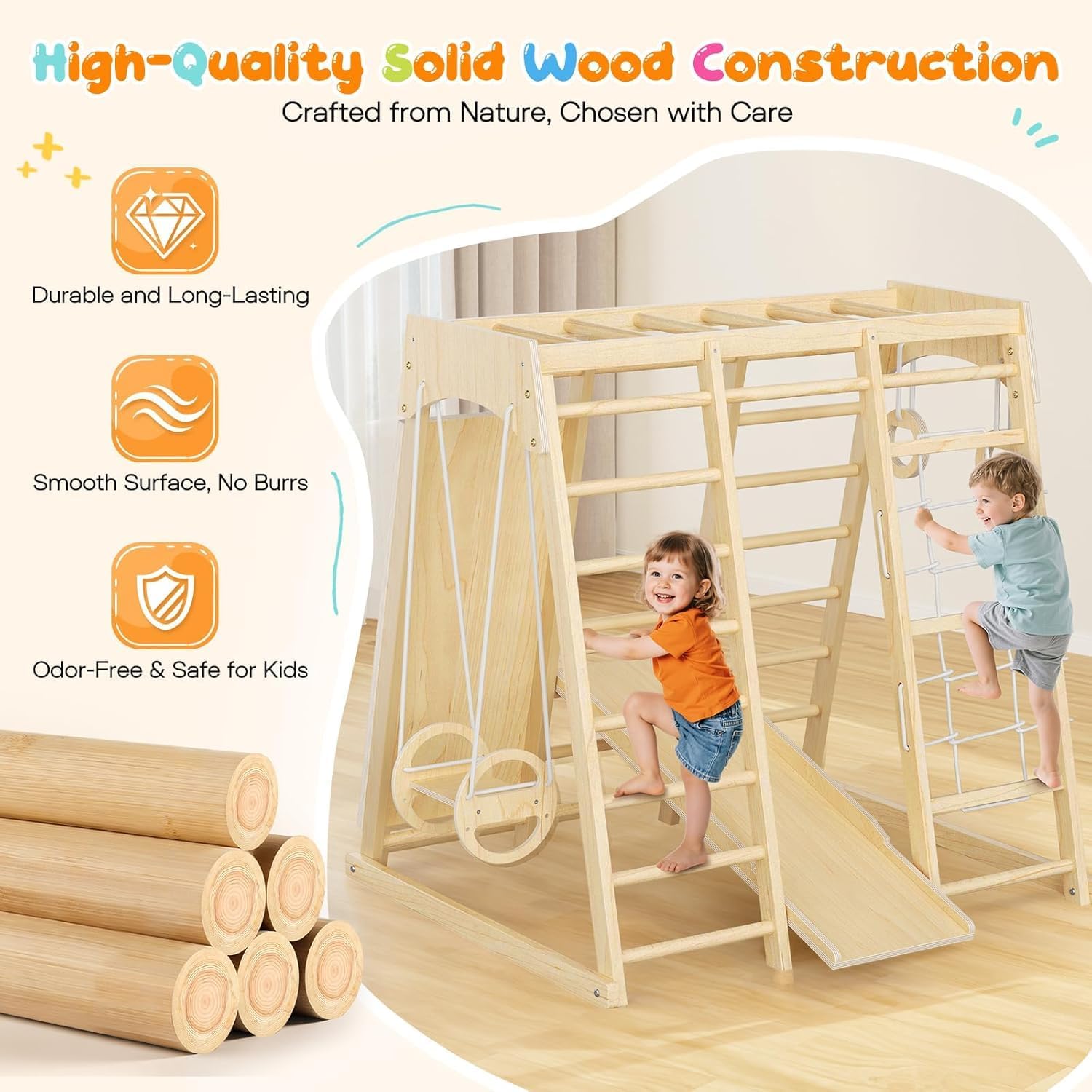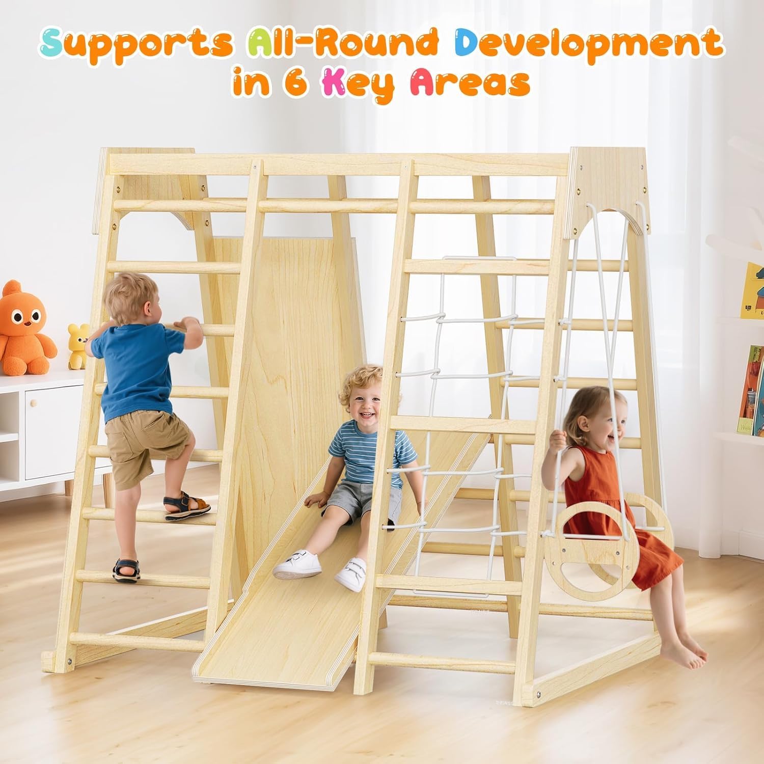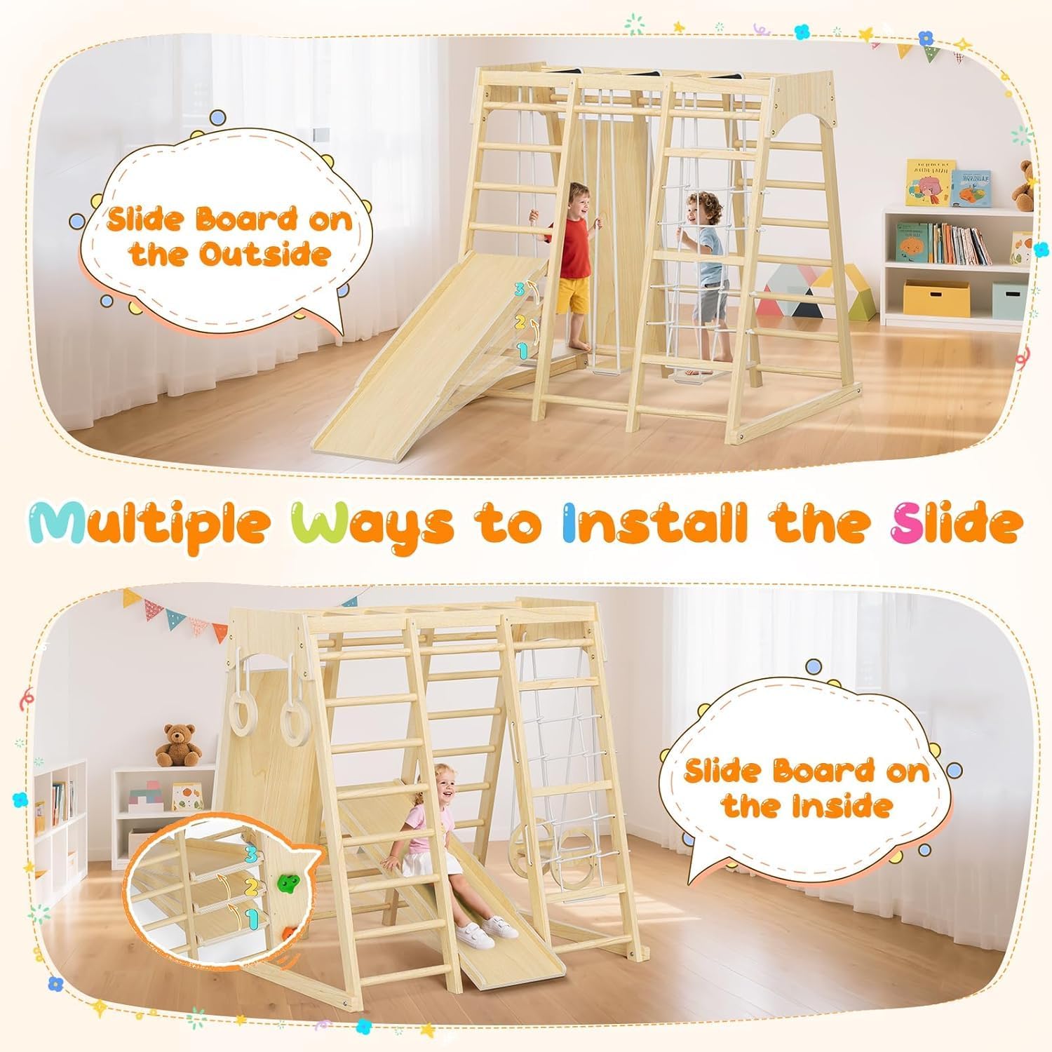 【9 in 1 autoportante e multifunzionale】 Lo scivolo può essere regolato a diverse altezze sulla struttura triangolare per adattarsi a bambini di età diverse. L'arco da arrampicata offre due modalità di gioco: arrampicata o, in combinazione con il cuscino, un comodo letto a dondolo con corrimano protettivi. Design scientifico e pratico: testato secondo gli standard europei di sicurezza ASTM e CPSC. La struttura da arrampicata interna è realizzata in legno massiccio di alta qualità e completamente priva di sostanze nocive. Ogni elemento viene accuratamente lavorato, con bordi arrotondati e superfici levigate senza intoppi. Quindi ci assicuriamo che i bambini siano protetti mentre giocano e i genitori non debbano preoccuparsi. Pratico cuscino e facile da pulire: il set viene fornito con un cuscino morbido e confortevole, che può essere utilizzato con la struttura da arrampicata o nel tempo libero. È realizzato in cotone e poliestere ed è facile da pulire. Per mantenere la sua morbidezza e forma, si consiglia il lavaggio a mano (dopo il lavaggio in lavatrice, toccare delicatamente l'imbottitura 【Allenamento completo e salvaspazio】 Questa struttura da arrampicata per interni favorisce la forza muscolare, l'equilibrio e la coordinazione dei bambini e può essere facilmente riposta grazie alla struttura pieghevole, ideale anche per piccoli spazi. Facile da montare e raccomandare: non è necessaria alcuna installazione professionale, è possibile eseguirla da soli con strumenti adeguati. È autoportante, quindi non è necessario praticare fori nella parete o nel pavimento per mantenerlo stabile e in posizione. I genitori devono sorvegliare i bambini mentre giocano. Si consiglia di mettere un tappeto morbido sotto il parco giochi nel caso in cui si verifichi una caduta inaspettata durante il gioco.