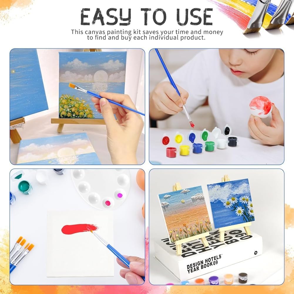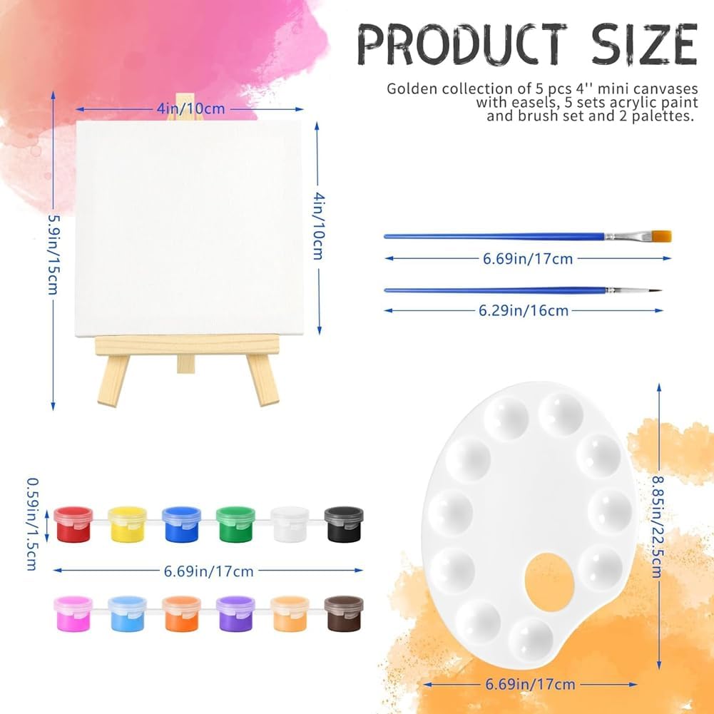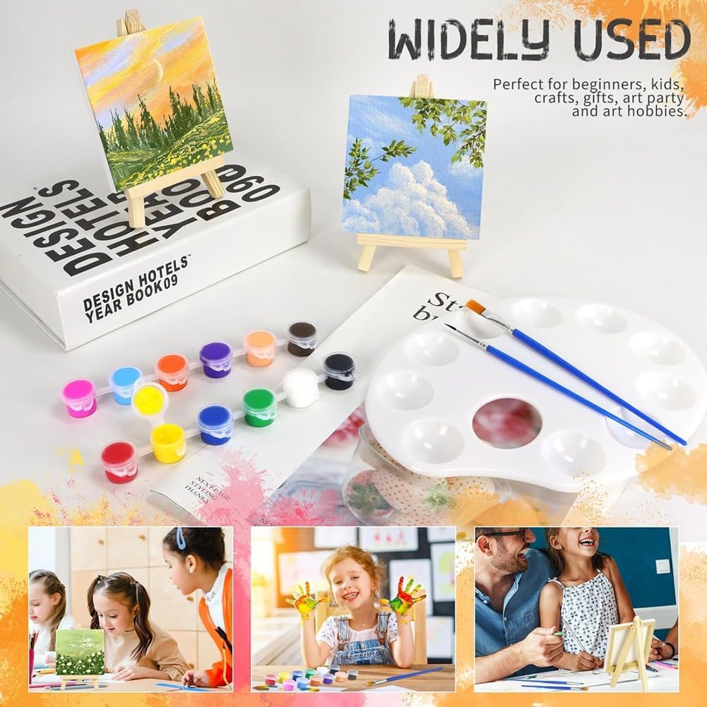 Il set di colori su tela è facile da usare, il cavalletto da pittura ha una semplice, non è necessario assemblarlo, basta aprirlo e quindi iniziare a dipingere tela. La confezione include 5 piccoli cavalletti, 5 piccole tele, 5 set da pittura e 2 piccole tavolozze. Questi materiali di pittura soddisferanno le tue esigenze di disegno all'interno o all'esterno e di sostituzione. Il cavalletto misura 15 cm di altezza, la tela misura 10 cm x 10 cm. Un set di pittura comprende 12 colori e ogni colore ha una capacità di 3 ml. Utilizziamo materiali di alta qualità, i cavalletti sono in legno di pino, le tele sono in , i pigmenti sono in acrilico e le tavolozze sono in plastica. ampia applicazione, queste forniture per feste artistiche sono perfette per dipingere in soggiorni, gallerie, mostre di pittura, club di pittura, scuole, aule, feste artistiche, matrimoni, celebrazioni. I bambini, gli studenti, gli insegnanti e gli amanti della pittura lo adoreranno.