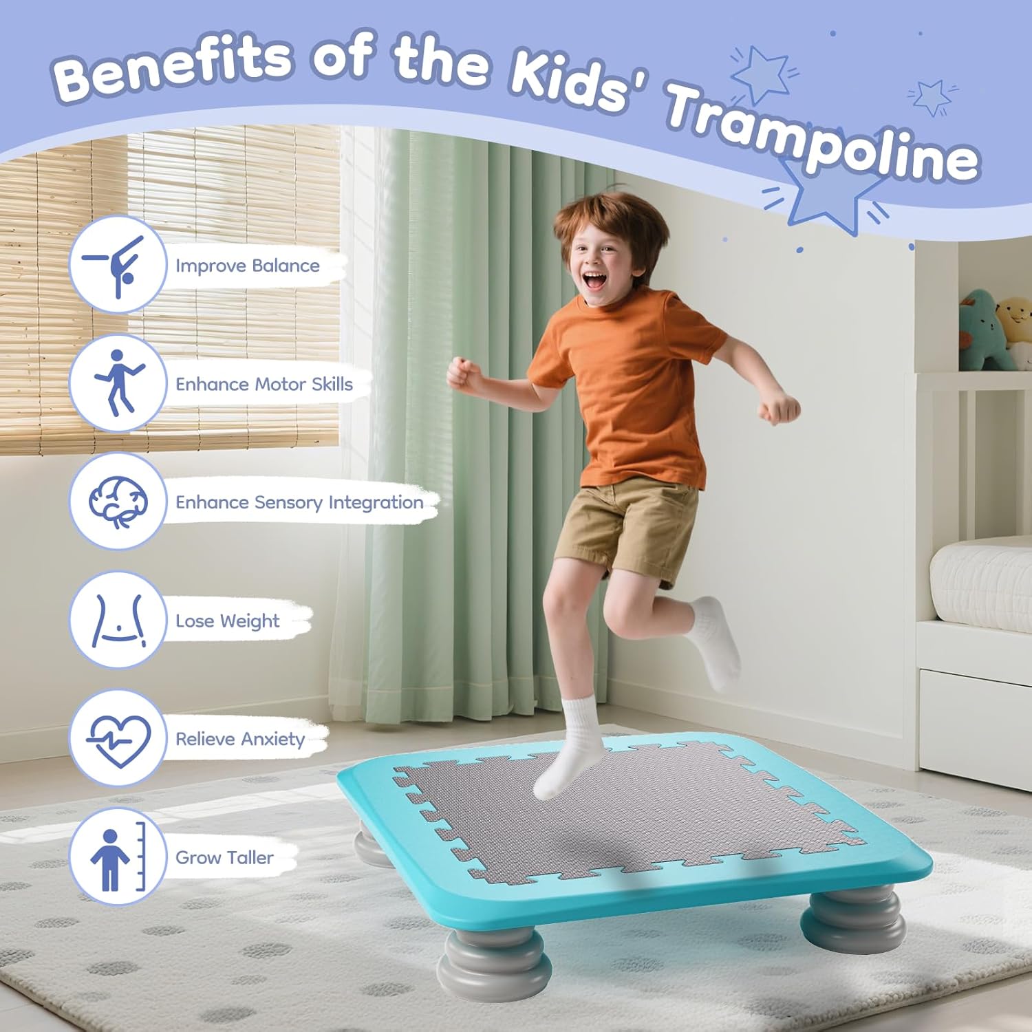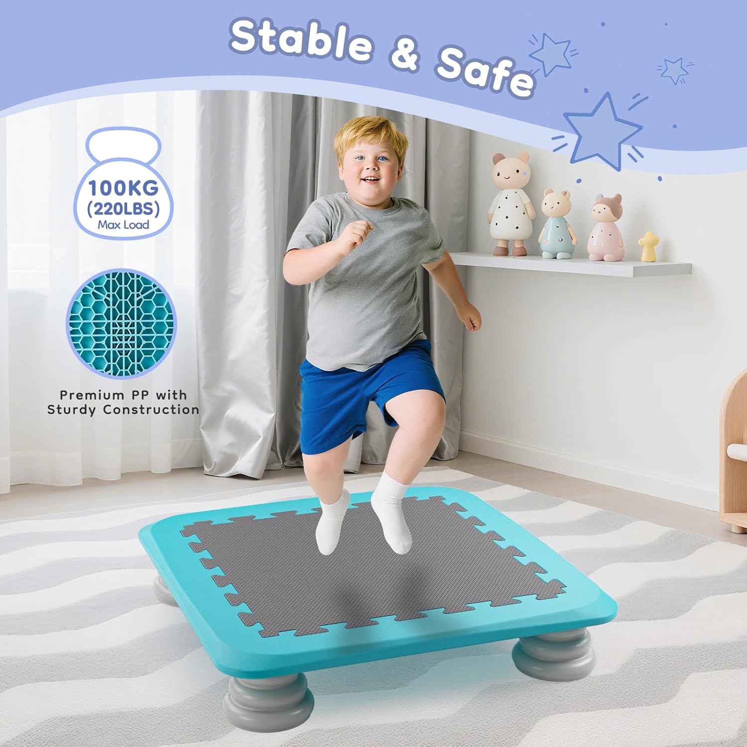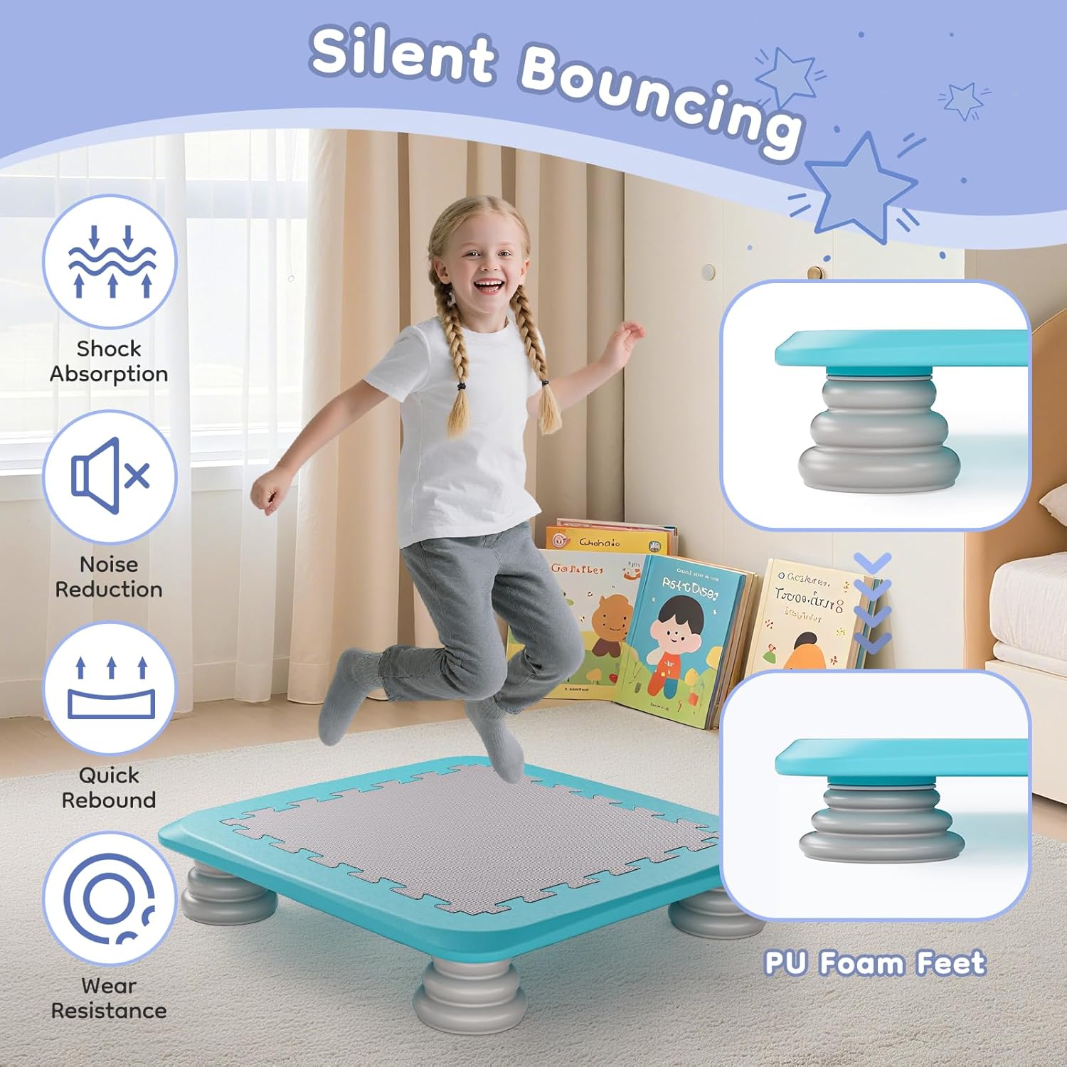 💧[Resistente e sicuro] Questo trampolino per bambini è dotato di un telaio in PP di alta qualità, senza parti metalliche o molle, che garantisce una struttura robusta e un supporto sicuro fino a 100 kg (220 libbre). Presenta inoltre angoli arrotondati e un cuscinetto antiscivolo in EVA. A differenza dei trampolini ad alto rimbalzo, questo offre un eccellente assorbimento degli urti e previene i rimbalzi eccessivi, garantendo un gioco sicuro. 💧[Rimbalzo silenzioso] Il nostro mini trampolino per bambini è dotato di cuscinetti in schiuma PU sicuri per il pavimento. L'eccellente ammortizzazione, l'assorbimento degli urti, la riduzione del rumore e la resistenza all'usura garantiscono un'esperienza di rimbalzo confortevole e silenziosa, senza disturbare gli altri. È perfetto per i bambini energici che amano rimbalzare e tenerli impegnati e intrattenuti. 💧[Avventura sensoriale] Questo mini trampolino offre un'esperienza di gioco sensoriale coinvolgente e sicura per i bambini, aiutandoli a sviluppare le capacità motorie, migliorare l'equilibrio e la coordinazione, crescere più alti, perdere peso e alleviare l'ansia. Adatto a bambini dai 3 anni in su con autismo o bisogni educativi speciali. La piattaforma di salto sicura è adatta anche ai bambini più timidi. 💧[Inclusivo, interattivo e amichevole] Questo trampolino sensoriale offre ai bambini un modo divertente e attivo per fare esercizio. Il suo design inclusivo incoraggia l'esplorazione sensoriale e lo sviluppo delle capacità motorie, favorendo l'interazione sociale e la comunicazione. Che si giochi da soli o in gruppo, promette un'esperienza emotiva gioiosa ed emozionante. 💧[Design rimovibile e portatile] Il telaio, il tappeto e il poggiapiedi del mini trampolino sono tutti rimovibili, rendendolo facile da montare, spostare e pulire. Le sue dimensioni compatte di 64 cm lo rendono facile da riporre sotto divani e letti, rendendolo perfetto per le famiglie con spazi limitati. È anche facile da trasportare per i viaggi, offrendo un'area di salto sicura e divertente per i bambini, sia all'interno che all'esterno.