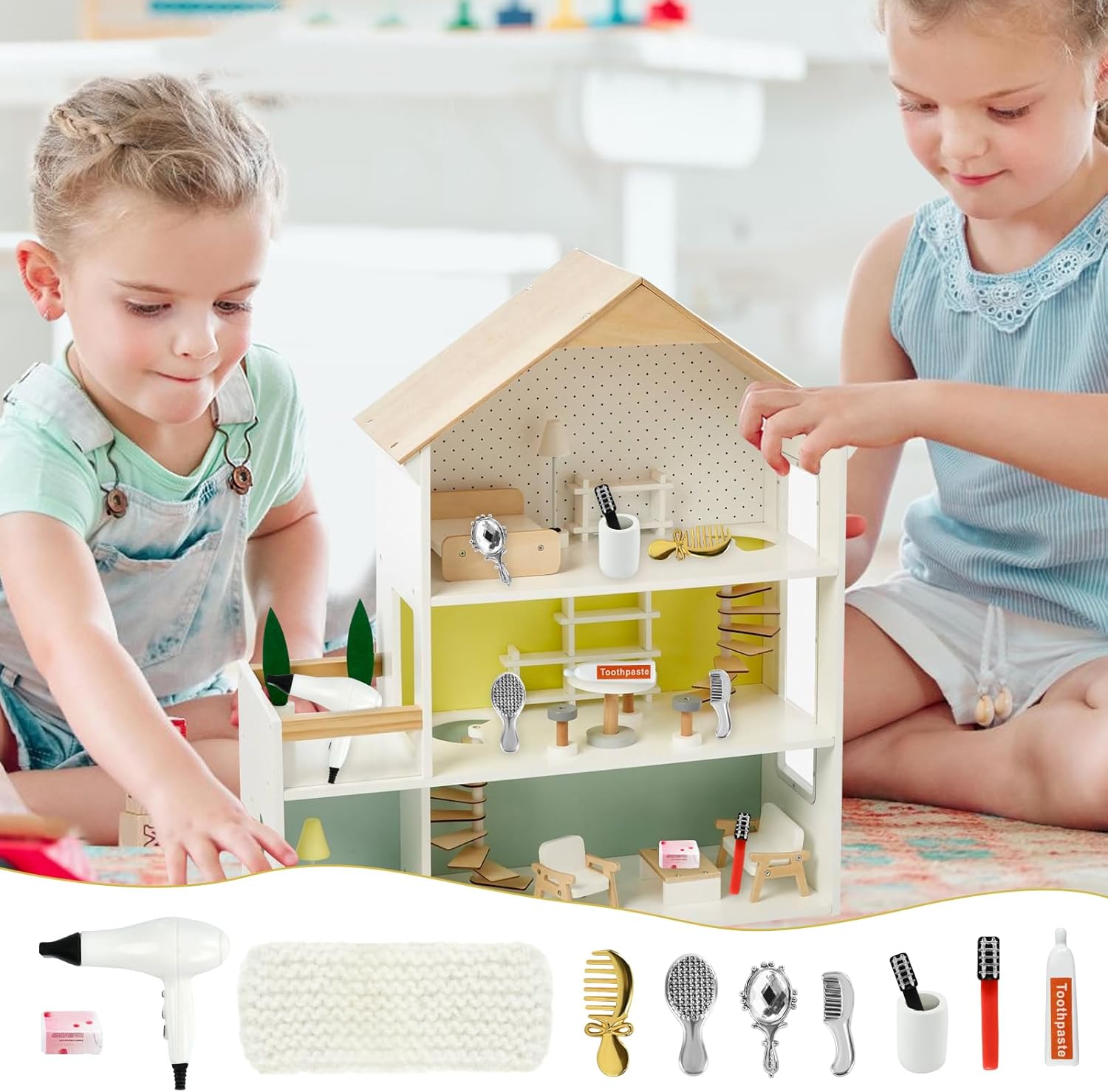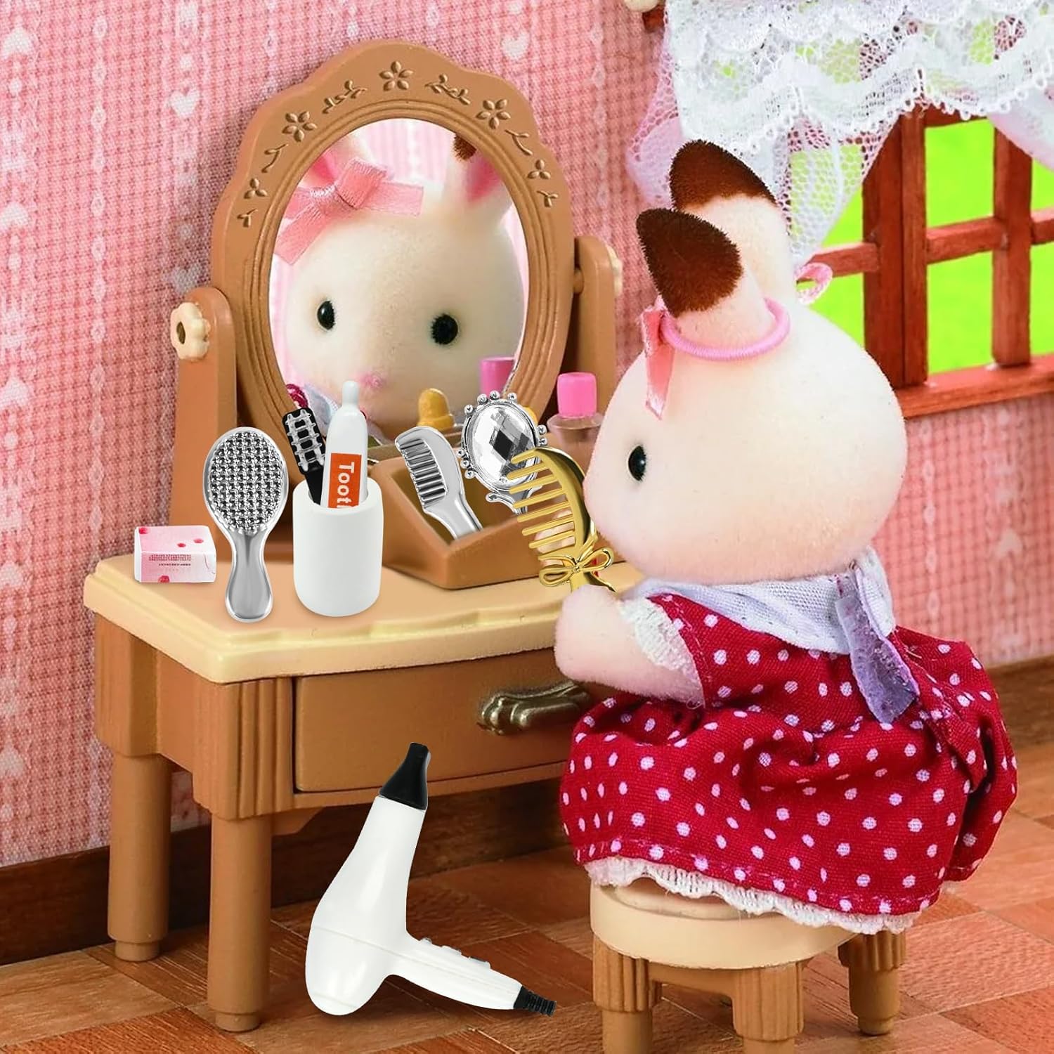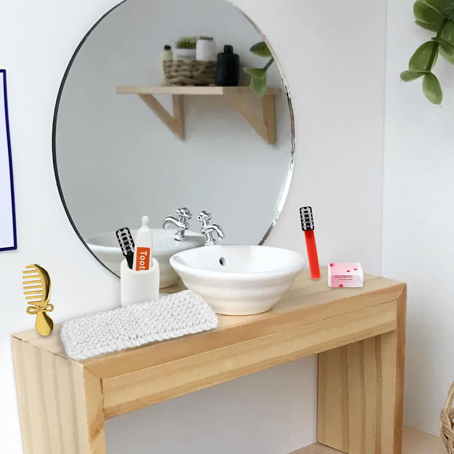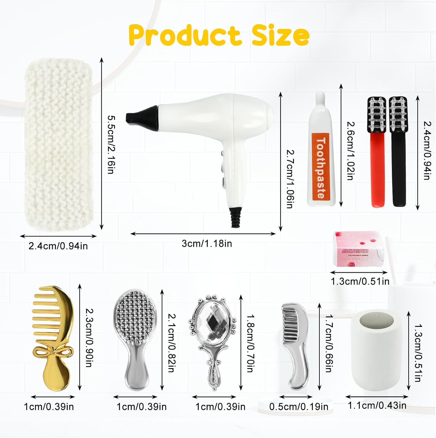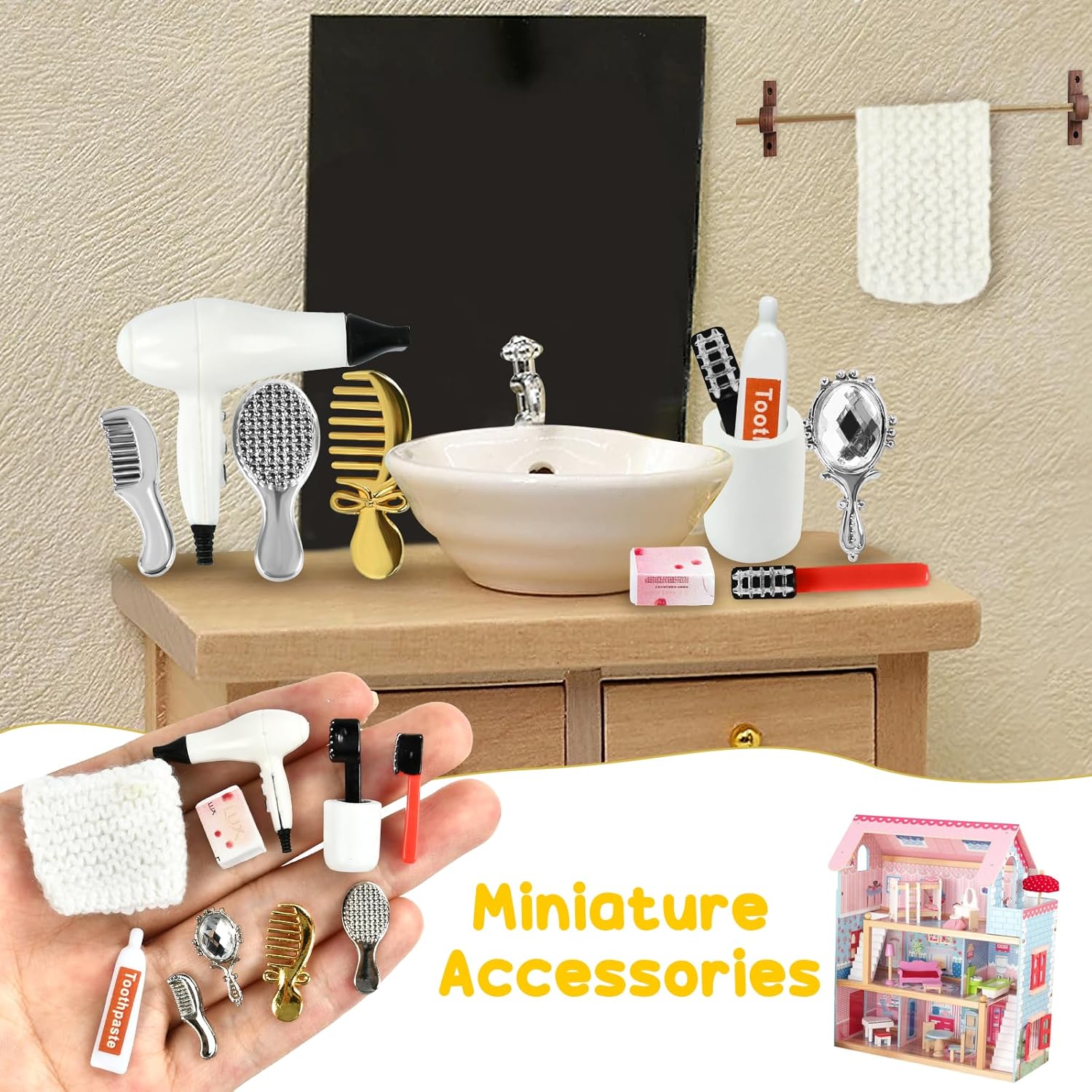 Riceverai: 1 specchietto in miniatura, 3 pettini in miniatura, 1 asciugacapelli in miniatura, 1 dentifricio in miniatura, 2 spazzolini da denti in miniatura (colori casuali), 1 tazza per collutorio in miniatura, 1 sapone in miniatura, 1 asciugamano in miniatura. Arricchisci la scena della tua casa delle bambole in miniatura. Materiale di Alta Qualità: Realizzato in PVC e materiali in lega di alta qualità, è finemente realizzato, robusto e durevole e può mantenere il suo effetto decorativo per lungo tempo, diventando il tocco finale di una casa giocattolo in miniatura. Vividità: ogni prodotto in miniatura è progettato con cura e meticolosità, rendendo il tuo mondo in miniatura più realistico e tridimensionale, riproducendo perfettamente ogni dettaglio della vita quotidiana e fornendo un'esperienza visiva coinvolgente. Ampiamente Usato: accessori in miniatura adatti per case delle bambole in miniatura, mini decorazioni, composizioni paesaggistiche in miniatura o come oggetti di scena per aggiungere fascino e raffinatezza unici alle tue scene e aumentare la diversità del mondo in miniatura. Pieno di Divertimento: è adatto come giocattolo creativo per bambini o appassionati di modelli in miniatura, offre un ricco spazio per l'interattività e l'immaginazione, sperimenta la gioia di creare e stimola l'immaginazione e la creatività.