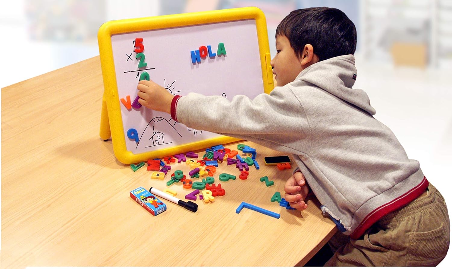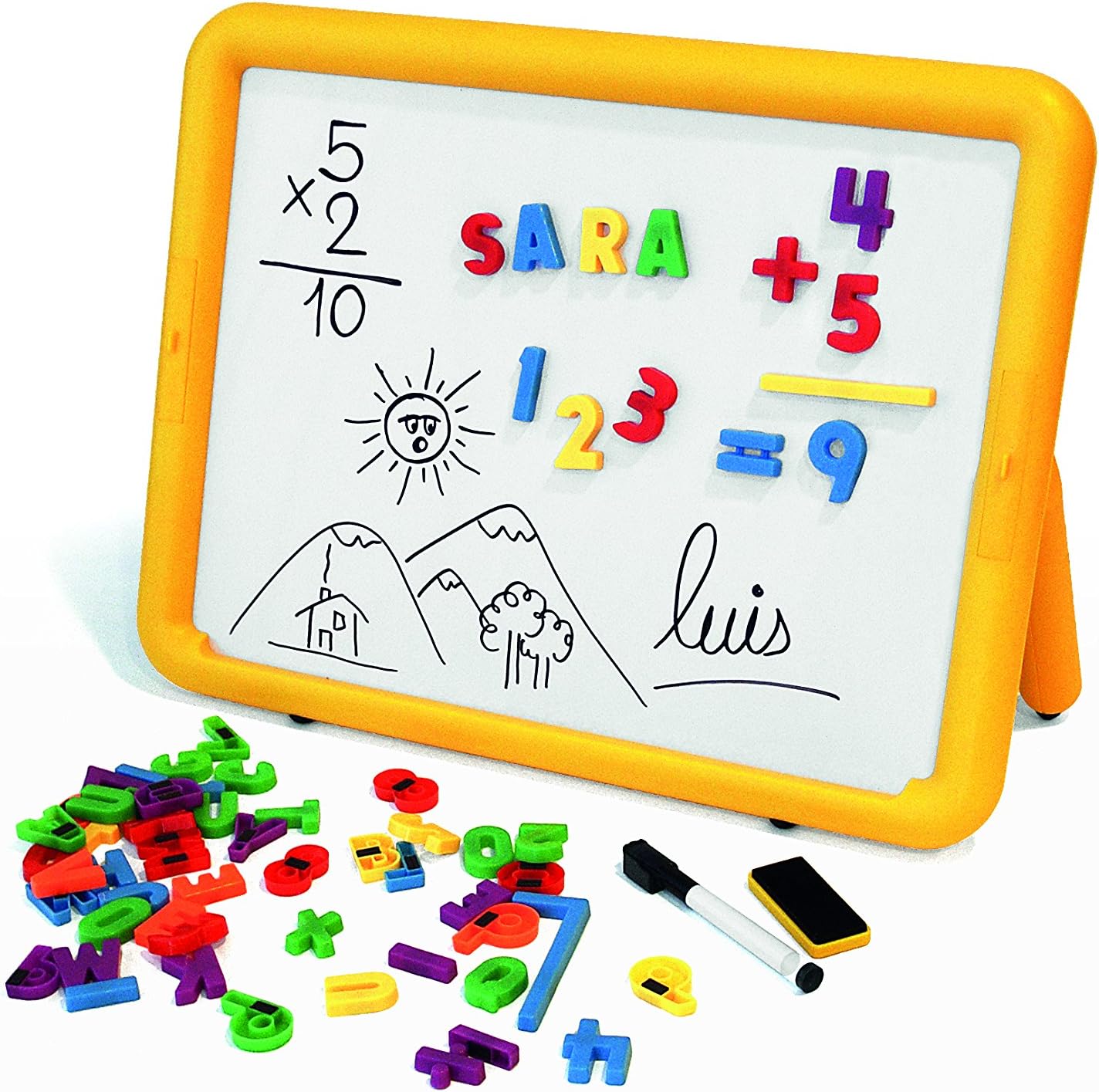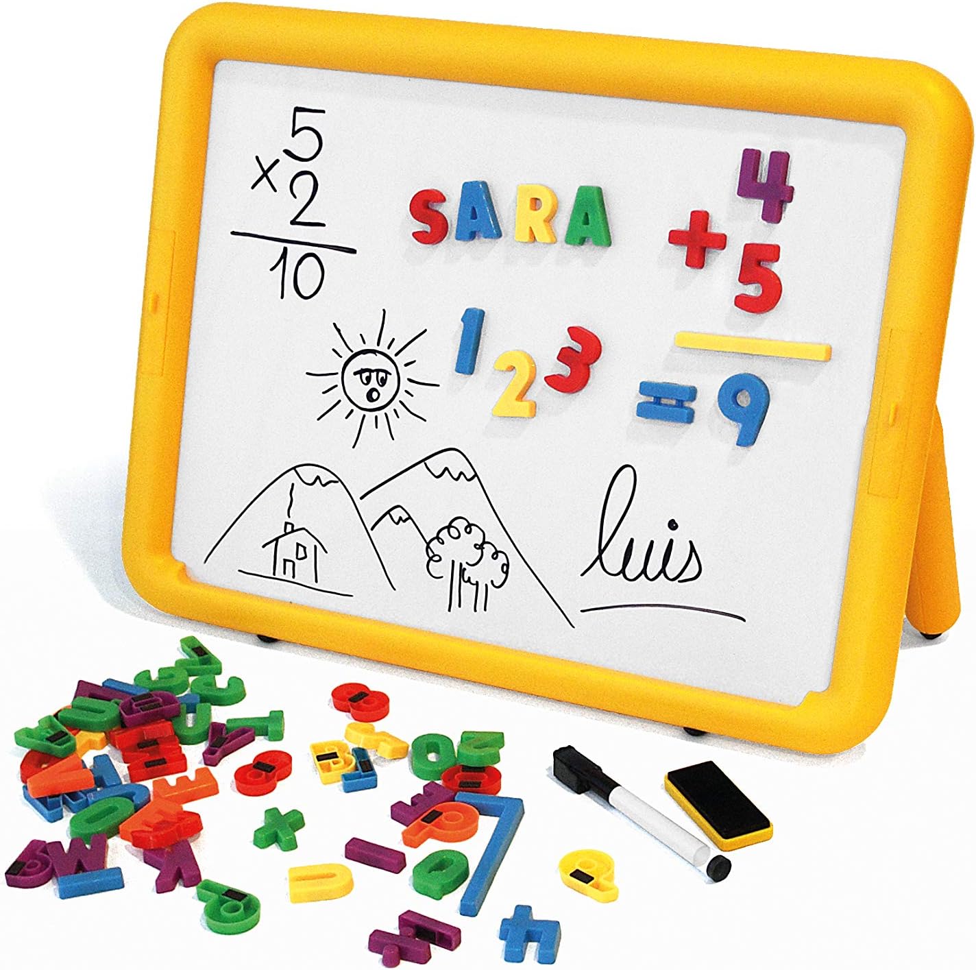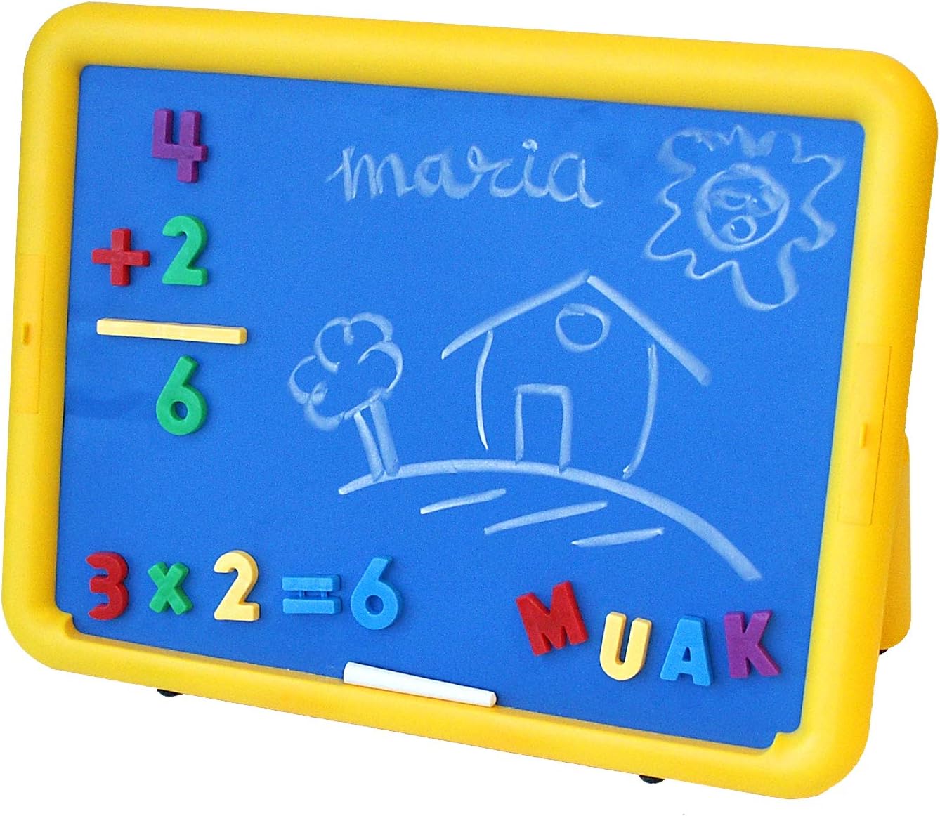 Contiene 1 tavola, 36 lettere, 27 numeri, 1 penna, 1 gomma e 3 gessetti. Lavagna grande I bambini possono scrivere e disegnare sul lato bianco con il pennarello o con il gesso sul lato blu. Da utilizzare con numeri e lettere magnetici. Dimensioni: 47 x 36 cm