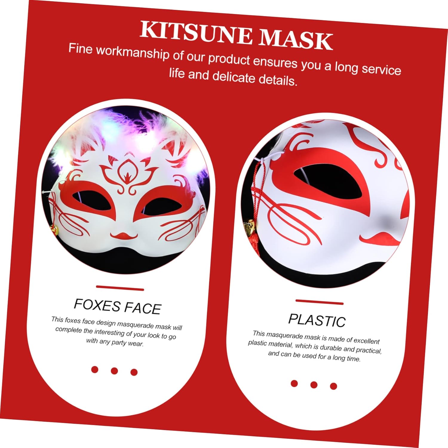 Il pacchetto include 2 maschere Caratteristiche -Adatto a varie attività: perfetto per cosplay, carnevale, Halloween, Natale, feste danzanti, sfilate di moda, feste in maschera, ecc. oggetti di scena per cosplay. -Materiale: plastica, maschera per feste cosplay con -Dimensioni: 20,00X16,00X5,00 cm/7,86X6,29X1,97 pollici maschere di volpi -Colore: maschera da cosplay rossa - Ti fa apparire fantastico e attraente alla festa, ed è una fantastica maschera in maschera. -Questa maschera da festa a mezza faccia è stata progettata per completare il tuo costume in maschera. -Realizzata in materiale plastico di alta qualità, di buona fattura, durevole e di per l'uso come mezza maschera. -Questa maschera è molto adatta per le feste e puoi giocare quanto vuoi dopo averla indossata. Informazioni sulle merci Maschera per costume da cosplay. Design alla moda e affascinante, è molto adatta per la tua collocazione di abbigliamento. Maschera da festa. Creativa, accattivante, durevole, decorativa, comoda da indossare, tutti questi vantaggi che desideri per una maschera da mascherata a mezza faccia sono tutti qui. Accessori per costumi da cosplay. Realizzato con materiali di qualità, questo articolo è perfetto per molte occasioni.