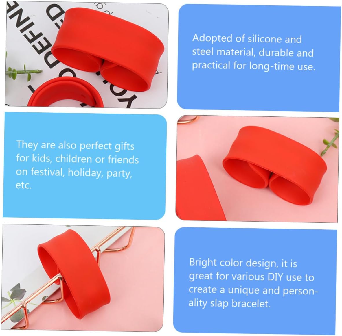 pacchetto include 4 x braccialetti Slap Caratteristiche - Materiale: braccialetti a scatto in silicone + acciaio. -Informazioni sul prodotto: in silicone - Realizzato in silicone di qualità e acciaio, ottimo per da te, facile da indossare come bomboniere per feste. - Taglia , si adatta saldamente al polso, trasformandosi istantaneamente in un da polso. - Puoi condividerli con i tuoi familiari o come premuroso per i braccialetti da polso. - Ottimi per feste a tema, progetti scolastici, lavoretti, costumi, Halloween e feste di compleanno per , braccialetti per eventi. - È flessibile e adatto a te, e non irrita la pelle o altri elementi degli elastici a scatto. Descrizione della merce Fascette a scatto Sono perfette come bomboniere per feste di compleanno dei . a scatto direttamente sul polso e formerà una comoda presa aderente in base alle dimensioni del tuo polso. Braccialetti a scatto sfusi Questi braccialetti a scatto in silicone sono realizzati per durare e utilizzare