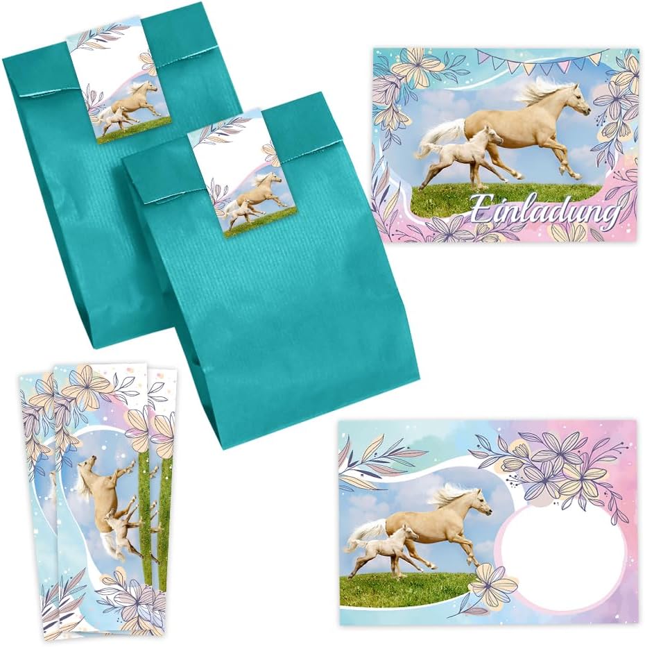 Contenuto: 12 biglietti d'invito + 12 buste + 12 sacchetti per feste/petrolio + 12 adesivi + 12 segnalibri Prodotto in Germania: biglietti, buste, segnalibri e adesivi sono prodotti in Germania. Pratico: con questo set non solo avrete inviti con buste abbinate, sacchetti regalo per regalini e fantastici adesivi regalo da scrivere, ma anche segnalibri come bomboniere. Biglietti: gli inviti sono moderni e progettati con molti dettagli. Sul retro troverete i campi prestampati da compilare. I biglietti d'invito sono molto robusti, hanno formato A6 (10,50 cm x 14,80 cm), stampa di immagini di alta qualità da 300 g/m e sono rivestiti con vernice UV per la finitura. Buste autoadesive: la busta ha una dimensione di 11,40 cm x 16,20 cm, stampa da 80 g/m² ed è adesiva (con striscia adesiva). Sacchetti regalo e adesivi: i sacchetti di carta hanno una dimensione di 12 x 19 cm. I sacchetti per feste sono molto adatti per confezionare piccoli bomboniere o caramelle per gli ospiti. Adesivo: gli adesivi hanno una dimensione di 5,2 x 14,8 cm. Tu o il tuo bambino potete scrivere sugli adesivi "Grazie", "bello che tu aspetta!" o scrivere il nome dell'ospite. Segnalibro: il segnalibro ha una dimensione di 5,2 x 14,80 cm, stampa 300 g/m ed è rivestito con vernice UV su entrambi i lati (lucido).