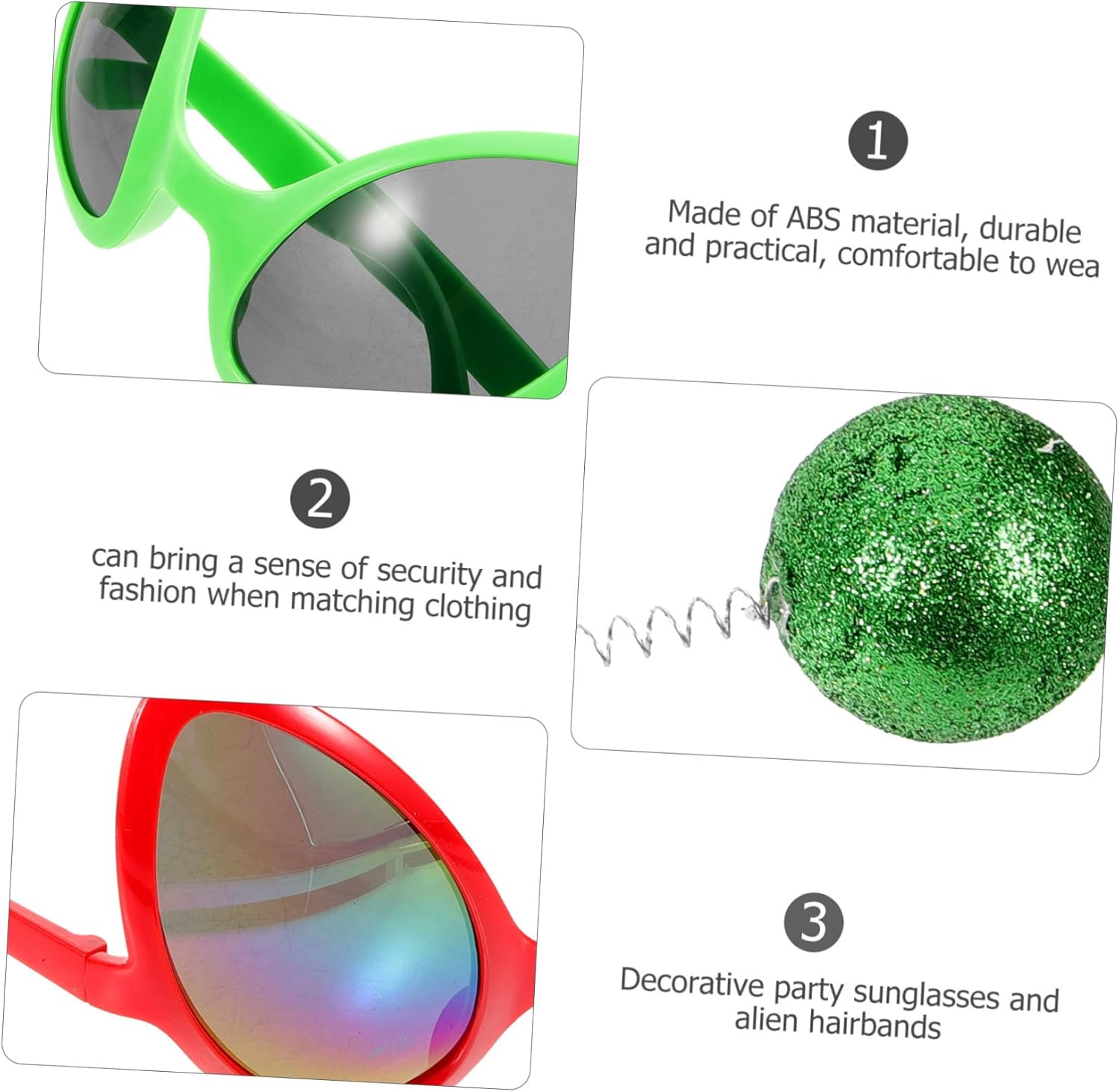 dei pacchetti 2 × alieni 2 × Fasce per aliene Caratteristiche -Colore: da sole divertenti in plastica di colori assortiti -Materiale: decorazioni aliene in ABS per feste -Dimensioni: 22,00X18,00X3,50 cm/8,65X7,07X1,38 pollici (fascia per ) cosplay di alieni da palcoscenico - Dimensioni: 16,50X13,50X7,50 cm/6,48X5,31X2,95 pollici ( ) fasce decorative per feste - Gli alieni sono realizzati con materiali sicuri e ABS, sono leggeri e non ti daranno fastidio né danneggeranno la tua pelle. - Possono essere indossati a lungo, regalandoti un'esperienza di indossamento confortevole con questo accessorio da costume alieno. - Possono essere indossati per divertenti travestimenti alieni, feste, discoteche, concerti, spiagge, festival musicali e molto altro ancora. - Indossando questi e queste fasce per , sarai adorabile e divertente per te, la tua famiglia e i tuoi amici con questa fascia per da alieno adulto. - Il kit di e fasce aliene può essere davvero squisito alle feste. Sono adatti per feste a tema spaziale, feste a tema cosplay, feste in spiaggia hawaiane e fasce aliene per Halloween. Informazioni sulle merci Costume con fascia da alieno I nostri da alieno e le nostre fasce da alieno sono sicuramente la scelta migliore. Fasce per cosplay da festa Possono essere abbinate a qualsiasi indumento e possono anche essere un buon accessorio fotografico per aiutarti a scattare foto fantastiche e interessanti. Interessanti da alieno da sole eleganti e accessori con fascia per ti fanno sembrare più unico tra la
