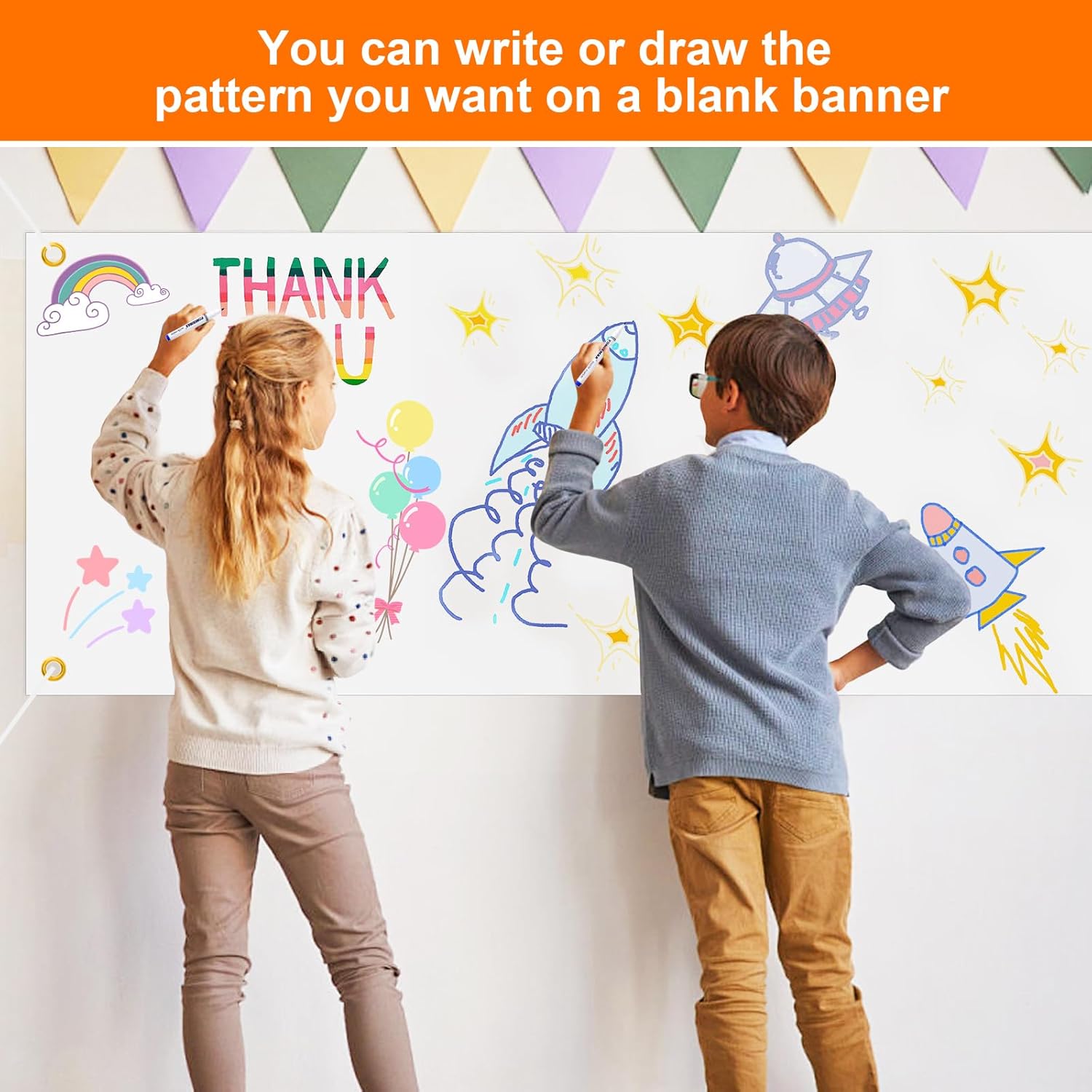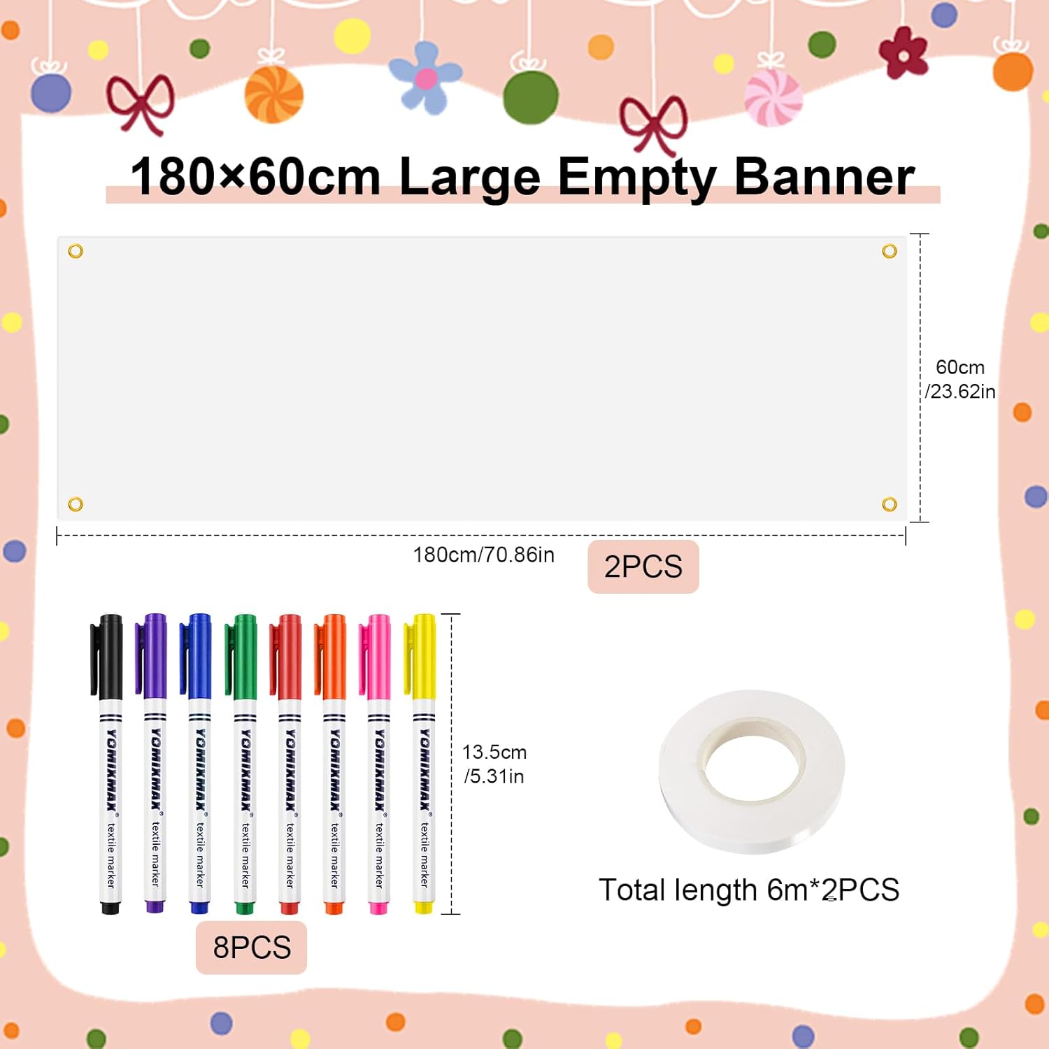 【Banner vuoto fai da te】 Riceverai 2 pezzi di banner bianco vuoto con una dimensione di 180 x 60 cm e 2 pezzi di corde sospese con una lunghezza di 6 m. Ci sono anche 8 penne per tessuti di diversi colori con le quali puoi progettare tu stesso i banner secondo le tue idee. 【Artigianato squisito】 Il poster bianco è realizzato in poliestere di alta qualità, resistente, leggero, non facile da sbiadire o rompersi e riutilizzato molte volte. La bandiera personalizzata è perfettamente tagliata e sigillata con doppie cuciture tutt'intorno per garantire che lo striscione bianco abbia bordi lisci. 【Facile da installare】 Installare questa bandiera fai-da-te è comodo e facile, basta collegare le corde agli occhielli metallici. Progetta la tua bandiera è facile da installare e rimuovere. Devi solo appenderlo dove vuoi decorare. E le robuste corde sospese ti aiutano ad appenderli al muro, al balcone, ecc. 【Penne a 8 colori】 Banner bianco bianco dotato di penne per tessuti a 8 colori, la scrittura è liscia e non facile da sbiadire. I colori colorati aggiungono bellissime decorazioni allo striscione bianco e attirano l'attenzione. 【Ampiamente usato】Banner personalizzato adatto per esporre attività indoor e outdoor come feste di compleanno, Halloween, club sportivi, decorazioni per scrivanie. Può essere utilizzato in giardini, muri. Gli striscioni vuoti sono la decorazione perfetta per le feste a tema.