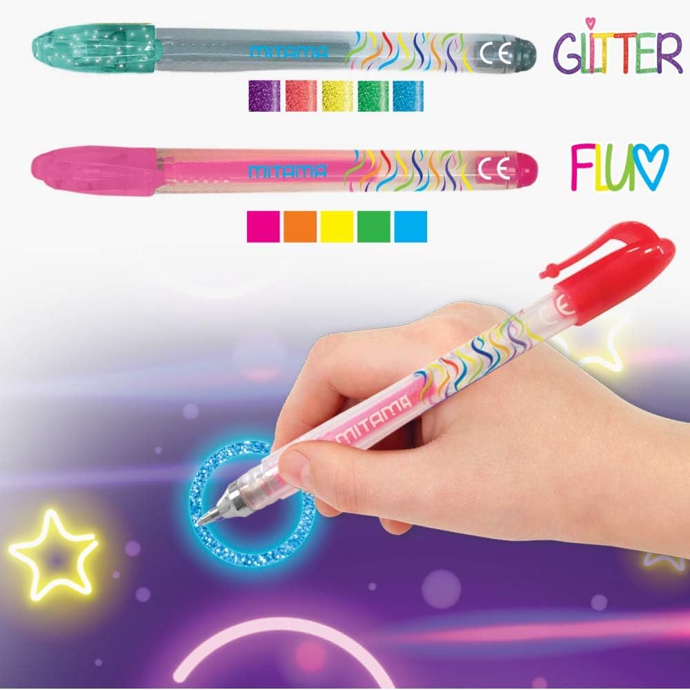 Le Mini Penne Gel Glitter e Neon Mitama sono le nuove penne in formato mini di Mitama Le mini penne a gel sono colorate, glitterate e superbrillanti! La confezione contiene 10 mini penne gel in colori assortiti: 5 colori Glitter e 5 colori Fluo Le mini penne hanno diverse colorazioni brillanti e vivaci. Permettono di scatenare la creatività e divertirsi a scrivere e disegnare! L'inchiostro è atossico e lavabile con acqua calda e sapone da mani e tessuti. La confezione è riutilizzabile come portaoggetti