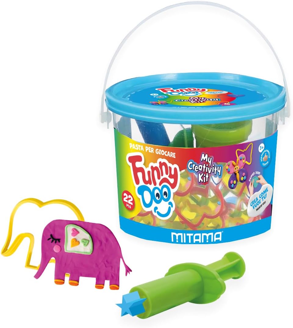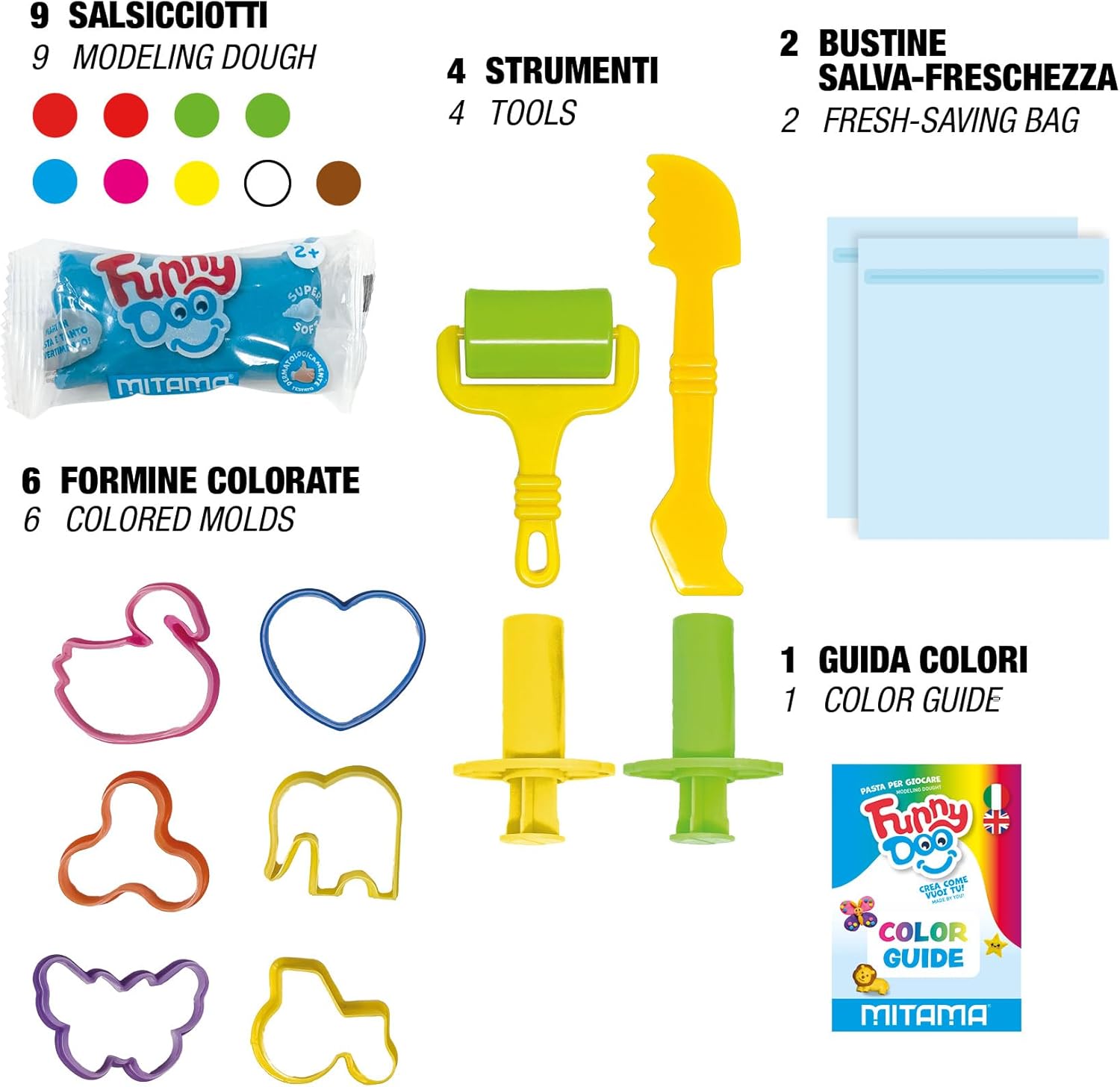 Dimensioni: 16,5 cm (L) x 14 cm (H) Contenuto della confezione (22 pezzi): 9 salsicce colorate Funny Doo da 50 g – 6 formine per biscotti colorate – 4 strumenti (1 rullo, 1 coltello, 2 estrusori) – 2 bustine salvafreschezza – 1 guida colori per mescolare i colori Fascia d'età: 3 anni