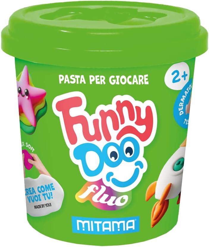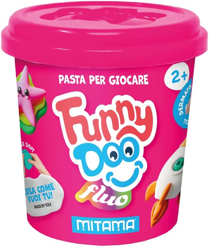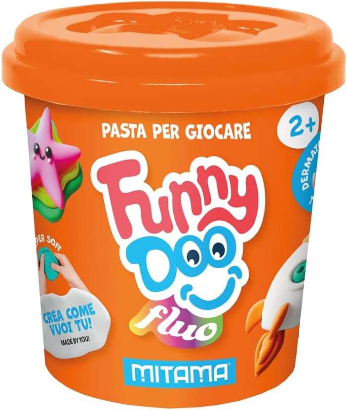 Dimensioni: 19 cm(L) x 7 cm (H) x 6 cm (P) CONTENUTO: -3 barattolini di pasta modellabile FLUO Funny Doo da 120 grammi -Colori: ARANCIO FLUO, ROSA FLUO, VERDE FLUO FASCIA DI ETA': 2+