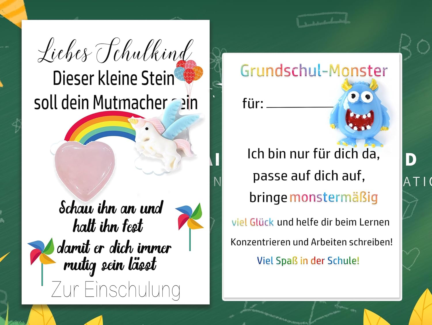 Caratteristiche: Stai cercando un meraviglioso regalo per il rientro a scuola? Caratteristiche: Nota: se il bambino ha bisogno di coraggio, prendilo in mano e credici. Fornitura: una carta con pietra + dinosauro/unicorno, una carta con mostro Dimensioni: quarzo 2 cm. Dinosauro: 4-5 cm. Unicorno: 3 x 3,4 cm. Si prega di notare che il colore del cristallo e il motivo dei dinosauri sono casuali. Attenzione: il Mutstein può essere facilmente trasportato nello zaino della scuola o nell'astuccio. Materiali di alta qualità: la pietra è realizzata con materiali naturali ed è applicata su un cartoncino formato A6