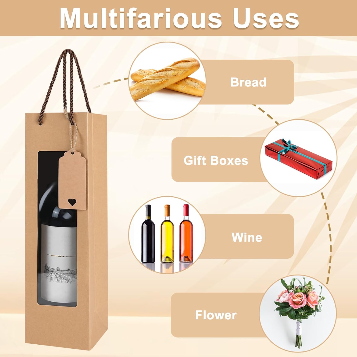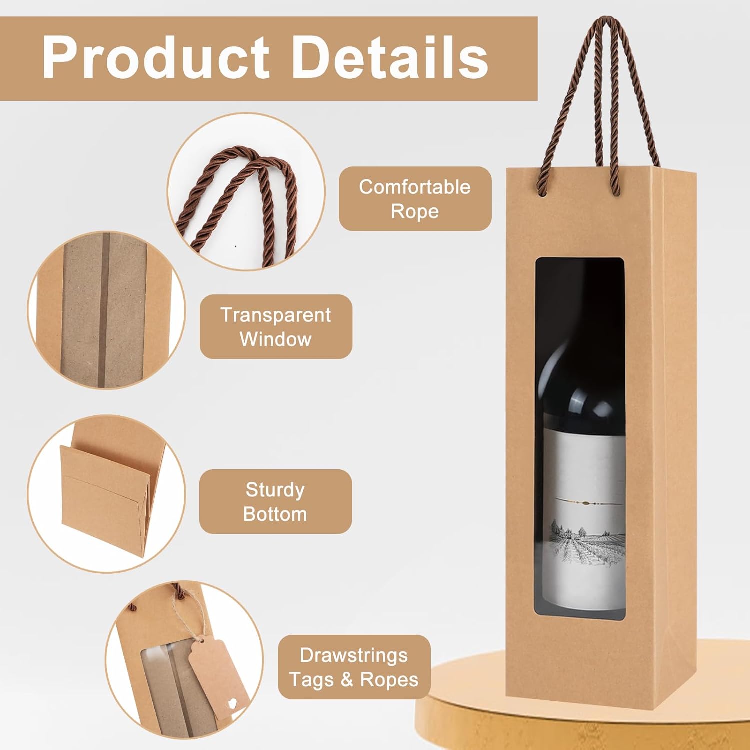 【Pacchetto valore】 Riceverai un pacchetto valore che include 30 sacchetti regalo marroni per vino con manici, 30 etichette in corda e corda da 10 m. Ogni sacchetto regalo di Natale misura circa 34,5 x 9,5 x 9,5 cm e può contenere la maggior parte delle confezioni di bottiglie di vino. Questa combinazione perfetta renderà il tuo regalo ancora più suggestivo e sorprendente. 【Materiale di qualità】 La confezione regalo è realizzata in un sacchetto di cartone kraft rigido di alta qualità con un delicato cavo di trasporto intrecciato a tre fili. Ciò garantisce che i sacchetti regalo per bottiglie di vino siano robusti e durevoli e non si strappino o si rompano facilmente, consentendo il riutilizzo e la protezione a lungo termine di ciascun sacchetto per bottiglie di vino durante il regalo. 【Design semplice ed elegante】Le borse per bottiglie di vino sono progettate in un classico ed elegante colore marrone, aggiungeranno sicuramente un tocco di raffinatezza al tuo regalo; Il colore è neutro, il che lo rende adatto a uomini e donne e bello per la maggior parte delle occasioni, che si tratti di un matrimonio, una festa, un compleanno, un anniversario o un Natale. 【Funzione finestra trasparente】 La finestra trasparente dei nostri sacchetti per bottiglie con maniglie nel design consente di vedere chiaramente il tuo regalo e renderlo fantastico. È anche facile mostrare i dettagli del regalo della bottiglia di vino ai tuoi amici e familiari attraverso il design trasparente della finestra. 【Ampie applicazioni】 La bottiglia del sacchetto regalo può contenere non solo bottiglie di vino, ma anche fiori e altri regali, offrendoti un modo diverso di utilizzo. Il design semplice e bello può mostrare la bellezza del tuo regalo e puoi anche condividere la nostra borsa regalo di nozze con familiari, amici e colleghi per trasmettere la tua cura.