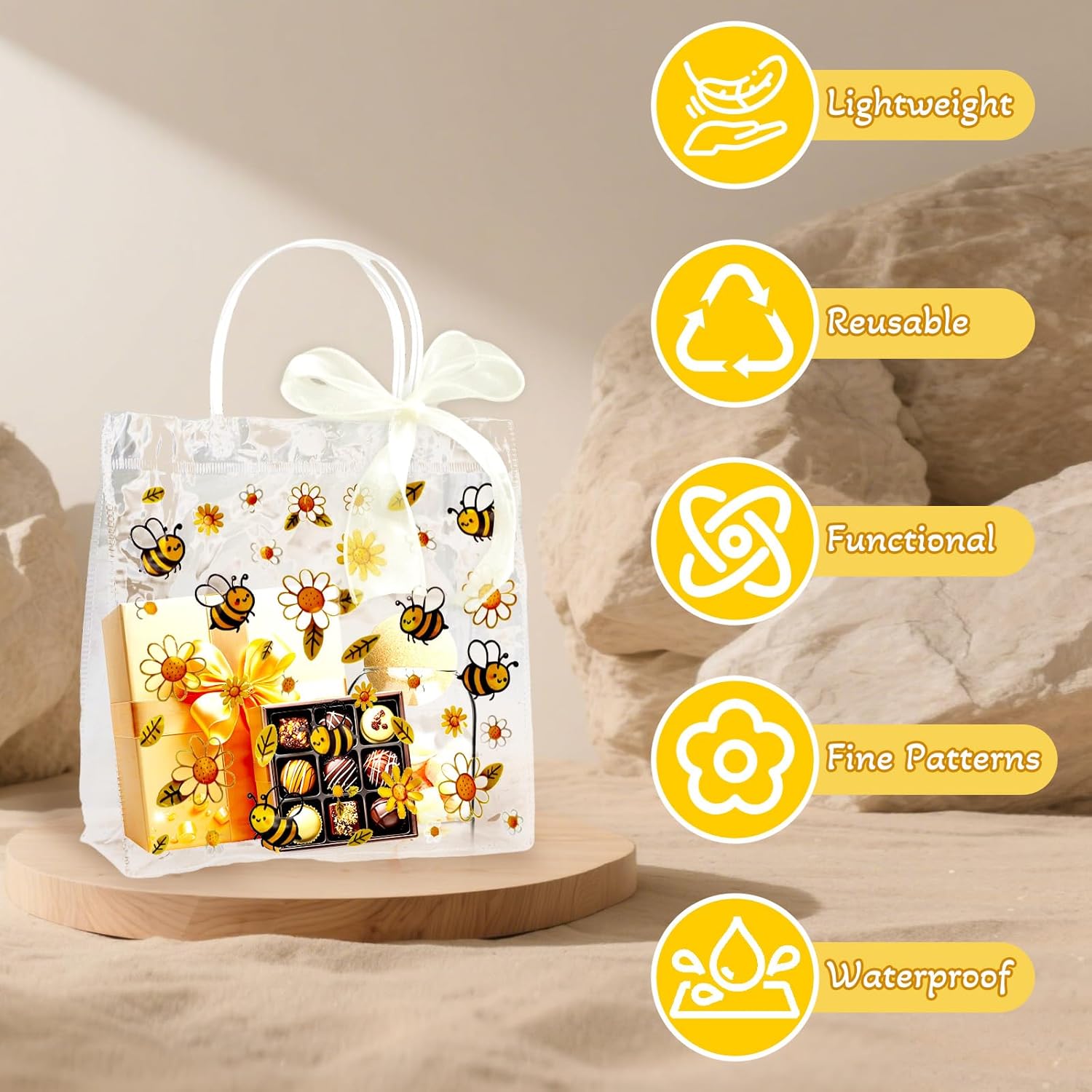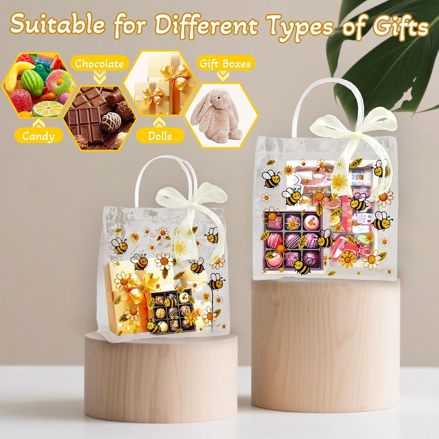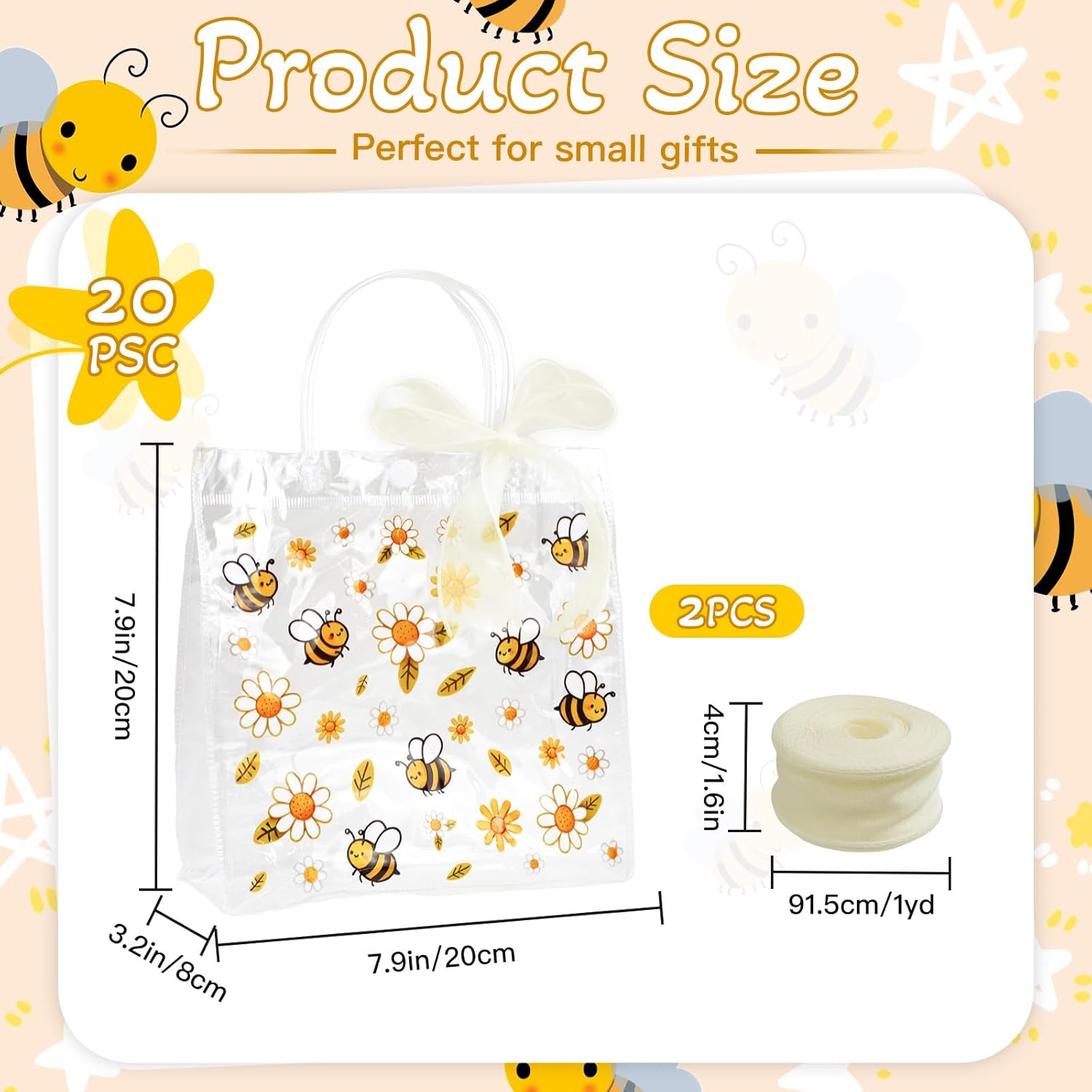 【Design Affascinante】Il set di sacchetti trasparenti comprende 20 adorabili sacchetti regalo trasparenti a tema ape. I graziosi motivi floreali e api aggiungono un tocco di natura e divertimento, rendendoli perfetti per varie occasioni come compleanni, baby shower o feste. 【Uso versatile】 Questi piccoli sacchetti regalo trasparenti con manici sono ideali per presentare regali, siano essi piccoli gioielli, dolci o oggetti di artigianato fatti a mano. La loro caratteristica trasparente permette di vedere chiaramente i regali all'interno, aggiungendo un ulteriore elemento di sorpresa. 【Materiale di qualità】 I sacchetti trasparenti in PVC sono realizzati in plastica resistente di alta qualità, abbastanza resistente da contenere regali senza strapparsi facilmente. Resisteranno alla normale manipolazione e usura, garantendo che i tuoi regali siano ben protetti. 【Dimensioni perfette】 I sacchetti regalo riutilizzabili trasparenti a forma di ape per bambini misurano 20 cm di lunghezza, larghezza e 8 cm di profondità, offrono spazio sufficiente per la maggior parte dei regali di piccole e medie dimensioni. Sono facili da trasportare e conservare, il che li rende pratici sia per chi fa il regalo che per chi lo riceve. 【Valore aggiuntivo】Il set trasparente di sacchetti regalo per baby shower viene fornito con 1 rotolo di nastro elegante. Puoi usarlo per allacciare le borse e creare un look bello e rifinito. È un'ottima aggiunta che consente confezioni regalo più creative.
