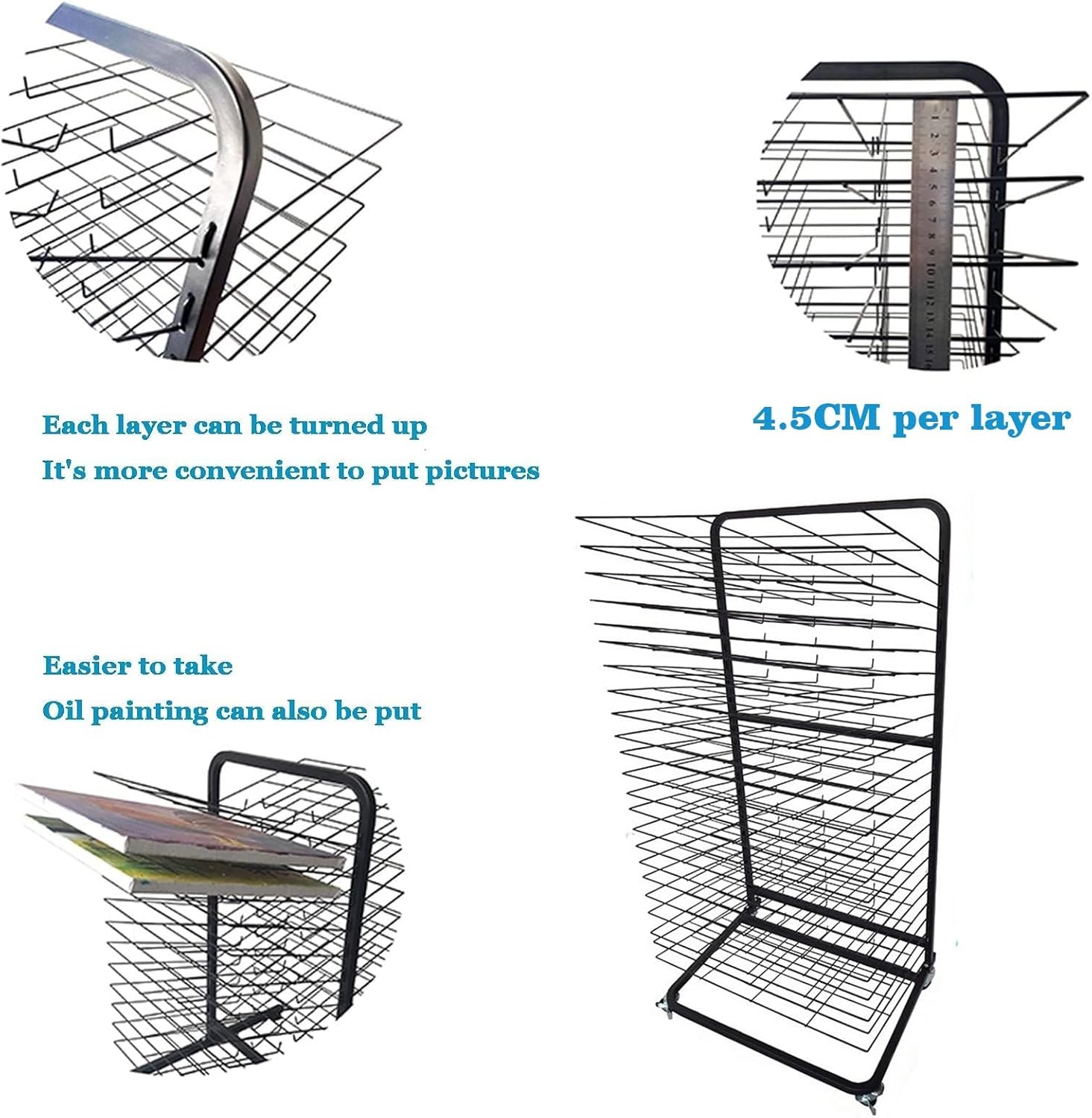 Materiale robusto: questo stendibiancheria for aule scolastiche è dotato di una robusta struttura in metallo saldato, la struttura in acciaio può resistere a un uso intensivo, con una capacità di carico massima di 12 libbre, il nostro stendibiancheria in metallo può aiutarti a mantenere i tuoi dipinti, schizzi e altri progetti artistici ordinati e organizzati! Spaziatura ragionevole: il portaoggetti ha 23 livelli, e la spaziatura tra di loro è di 4,5 cm, e la spaziatura tra i ripiani è maggiore. Perfetto for asili nido e corsi d'arte, aule d'arte o studi. Asciuga facilmente le tue opere d'arte: di' addio ai capolavori sporchi e dai il benvenuto alle opere d'arte pulite e asciutte. Il nostro stendibiancheria in metallo può aiutarti a mantenere i tuoi dipinti, schizzi e altri progetti artistici ordinati e organizzati! Mobilità combinata con stabilità: il nostro rack è stato progettato con cura con 4 rotelle girevoli, tra cui due ruote bloccabili. Sposta facilmente la tua stazione di asciugatura assicurandoti una stabilità assoluta durante l'uso. Ampia applicazione: lo stendibiancheria for aule è perfetto for piccoli fogli di carta, poster di dimensioni standard e carta for acquerelli di dimensioni imperiali, con spazio di asciugatura sufficiente for ospitare un'intera classe di dipinti o una serie di stampe.