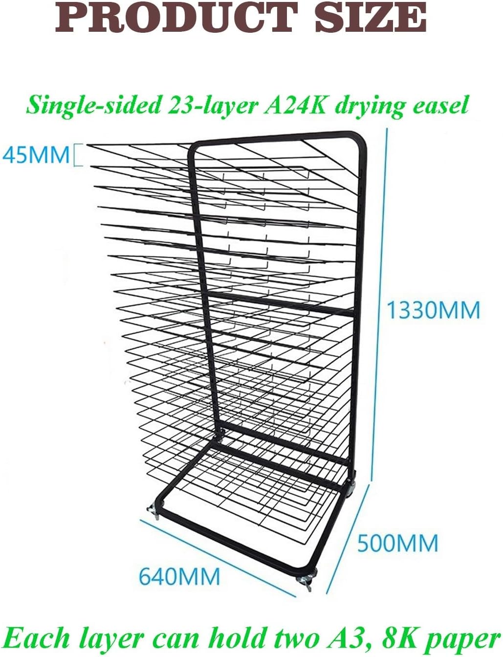 Materiale robusto: questo stendibiancheria for aule scolastiche è dotato di una robusta struttura in metallo saldato, la struttura in acciaio può resistere a un uso intensivo, con una capacità di carico massima di 12 libbre, il nostro stendibiancheria in metallo può aiutarti a mantenere i tuoi dipinti, schizzi e altri progetti artistici ordinati e organizzati! Spaziatura ragionevole: il portaoggetti ha 23 livelli, e la spaziatura tra di loro è di 4,5 cm, e la spaziatura tra i ripiani è maggiore. Perfetto for asili nido e corsi d'arte, aule d'arte o studi. Asciuga facilmente le tue opere d'arte: di' addio ai capolavori sporchi e dai il benvenuto alle opere d'arte pulite e asciutte. Il nostro stendibiancheria in metallo può aiutarti a mantenere i tuoi dipinti, schizzi e altri progetti artistici ordinati e organizzati! Mobilità combinata con stabilità: il nostro rack è stato progettato con cura con 4 rotelle girevoli, tra cui due ruote bloccabili. Sposta facilmente la tua stazione di asciugatura assicurandoti una stabilità assoluta durante l'uso. Ampia applicazione: lo stendibiancheria for aule è perfetto for piccoli fogli di carta, poster di dimensioni standard e carta for acquerelli di dimensioni imperiali, con spazio di asciugatura sufficiente for ospitare un'intera classe di dipinti o una serie di stampe.