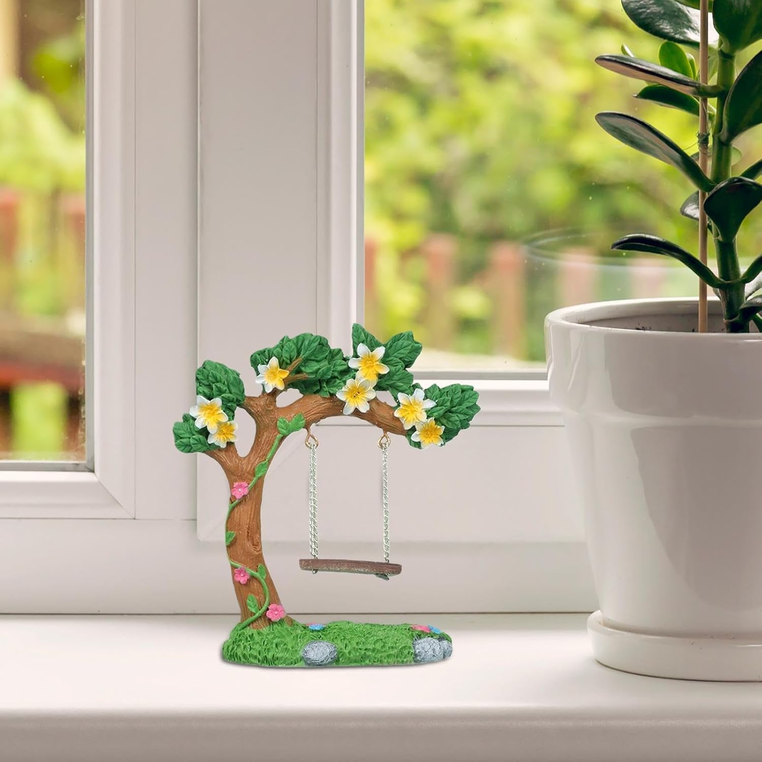 Compatibilità giardino fatato: progettata per risparmiare spazio mantenendo un aspetto estetico, questa altalena in miniatura si fonde armoniosamente in giardini fatati e configurazioni della casa delle bambole, arricchendo la loro delicata composizione spaziale attraverso un design accurato Design in resina intagliata a mano: le texture in resina intagliate a mano replicano un'autentica altalena da giardino fatata, con effetto galleggiante dinamico e dettagli intricati, per un aspetto vivido Punto focale di interesse dinamico: aggiungi fantasia al tuo giardino con un'altalena ispirata ai petali che promuove l'interesse dinamico e funge da splendido centrotavola, fondendo design creativo con bellezza coinvolgente per un incanto duraturo Regalo creativo: festeggia compleanni, festival, Natale e anno presentando questa altalena da giardino fatata alla persona cara, trasmettendo il miglior affetto e la cura premurosa senza sforzo Arricchimento della profondità della scena: aggiungi fascino a qualsiasi ambiente integrando questa altalena in paesaggi interni o spazi esterni, garantendo una maggiore profondità e un ricco fascino visivo