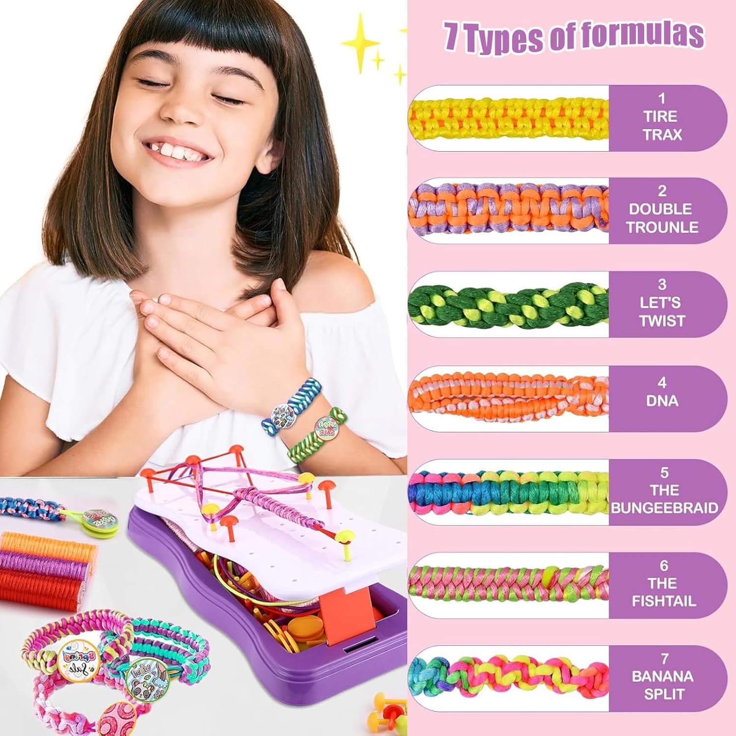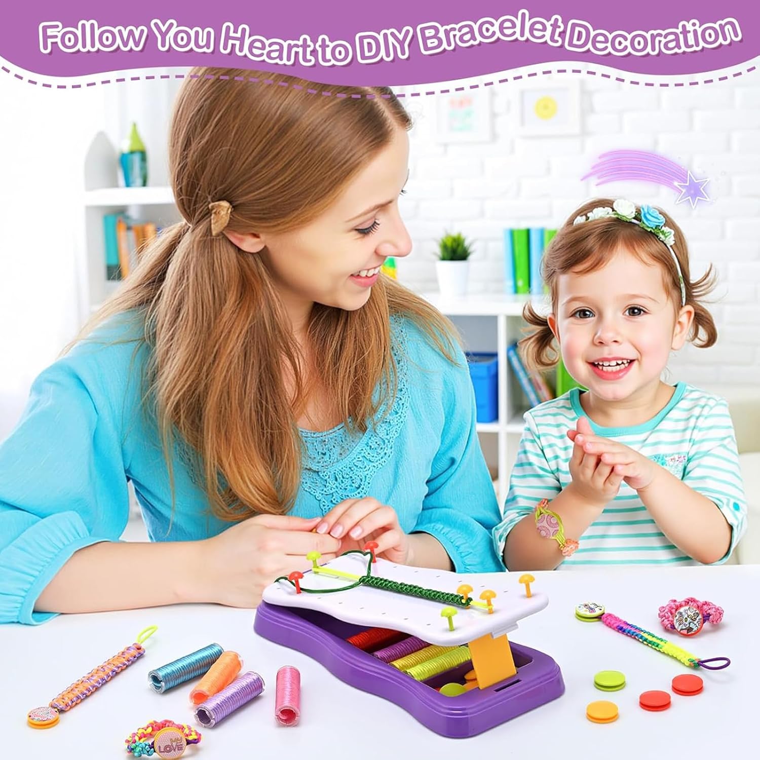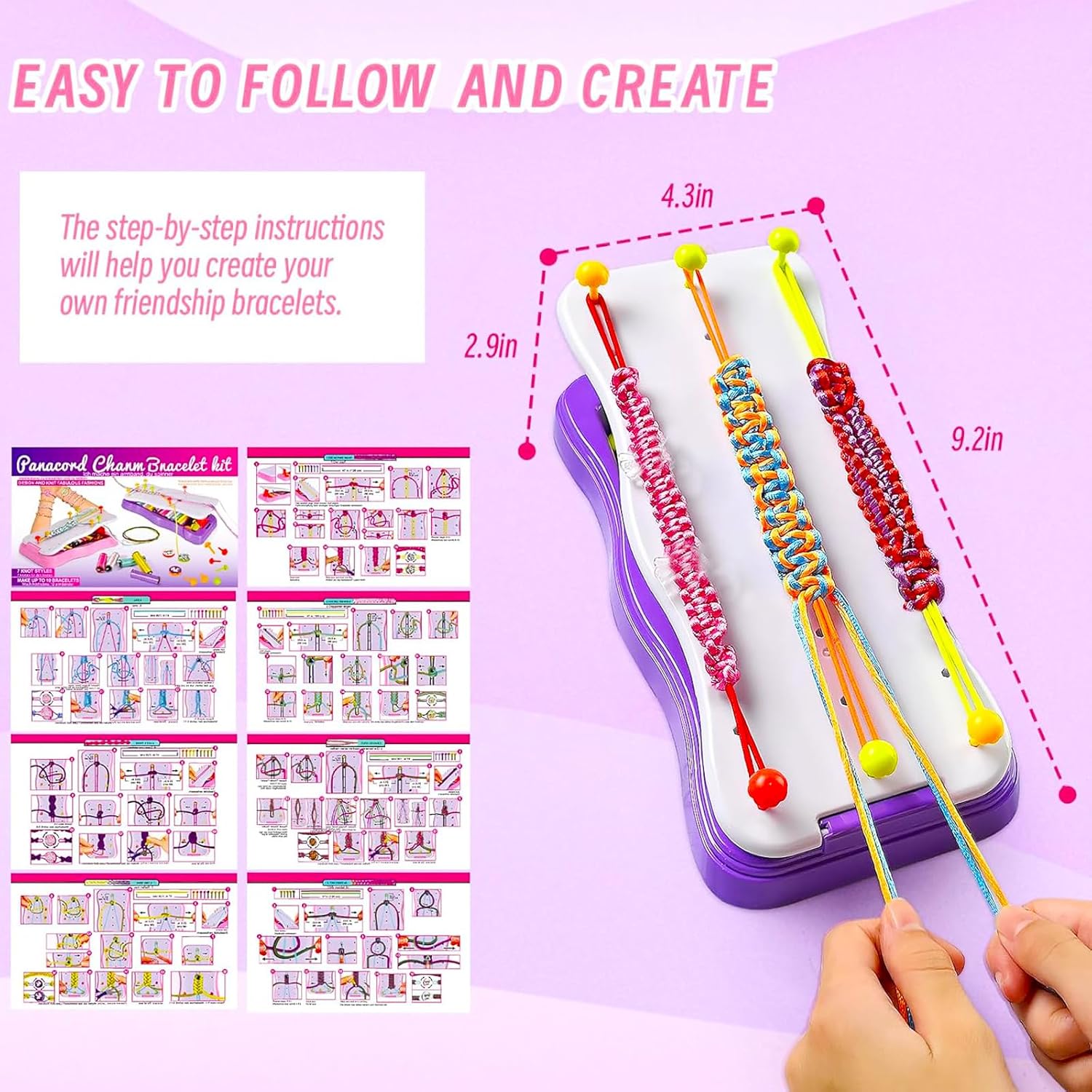 【Contenuto della confezione】: Questo set di cordini per intrecciare fatti a mano include un supporto per intrecciare, 15 chiodi, 10 fibbie per intrecciare, 10 elastici, 10 cordini per intrecciare, un foglio di adesivi e un manuale di istruzioni: una combinazione perfetta per consentire al tuo bambino di creare liberamente una varietà di stili di braccialetti 【Vari stili】: Questo set di cordini per intrecciare fatti a mano fai da te include istruzioni per 7 diversi stili di braccialetti, rendendo la creazione di braccialetti semplice. Scatena la creatività del tuo bambino per progettare braccialetti unici nel loro genere, che miglioreranno notevolmente la sua creatività e la sua coordinazione occhio-mano 【Compatto e portatile】: Il set di braccialetti dell'amicizia è progettato per essere portatile. Il suo design compatto lo rende facile da trasportare e offre ampio spazio per riporre le tue creazioni e gli strumenti senza occupare troppo spazio: perfetto per viaggi, campeggio o altre attività all'aperto 【Partner Genitore-Figlio】: Usa questo set di braccialetti fatti a mano per bambini per creare braccialetti con tuo figlio o il tuo partner per promuovere l'interazione genitore-figlio, migliorare la comunicazione emotiva, vivere momenti di creatività e crescita e favorire il tempo e il legame familiare 【Regalo perfetto】: Il set di braccialetti intrecciati fatti a mano per bambini è un ottimo regalo per le bambine, ed è anche un ottimo set fai da te adatto per compleanni, feste, rientro a scuola, San Valentino, Natale e altre celebrazioni. Un regalo perfetto per le bambine