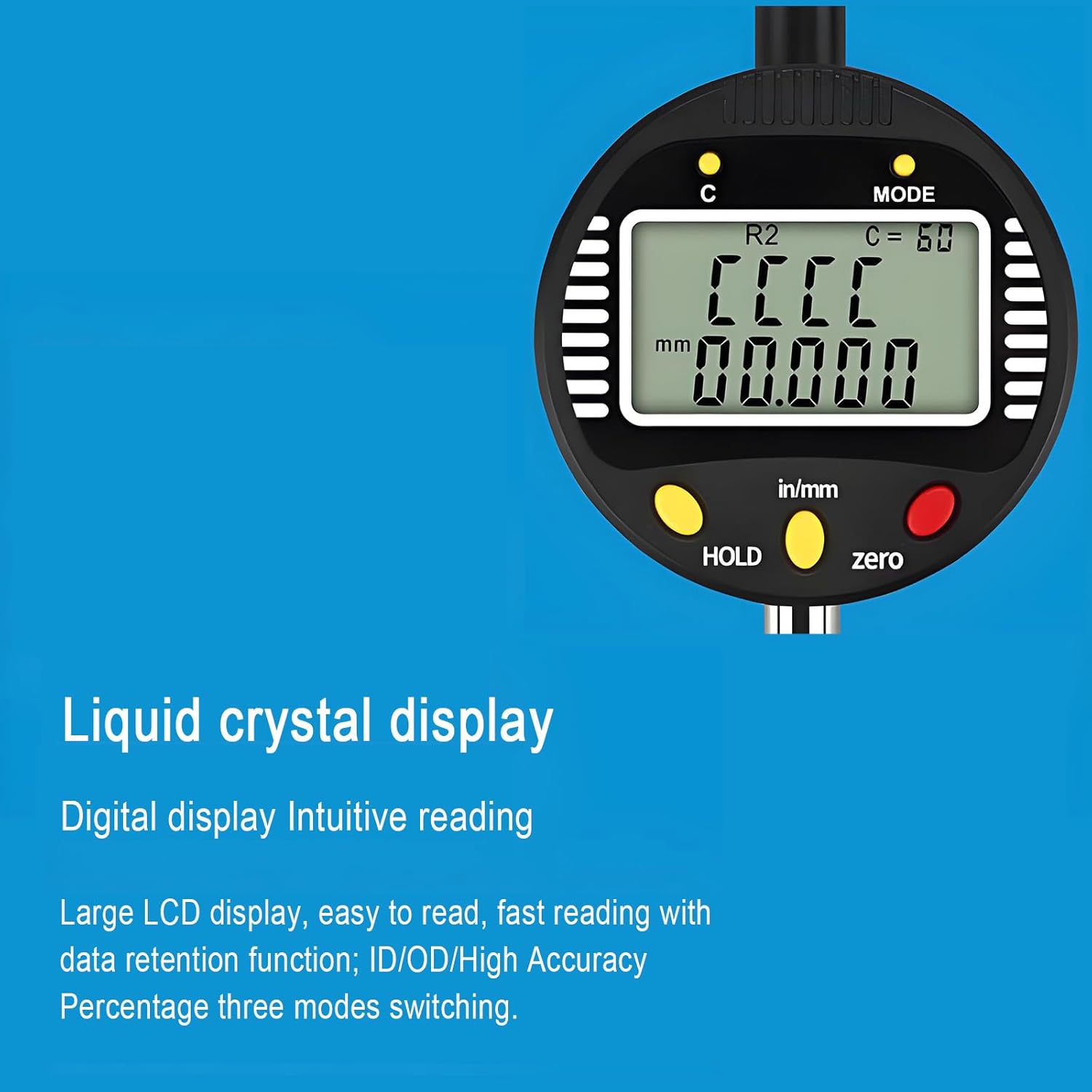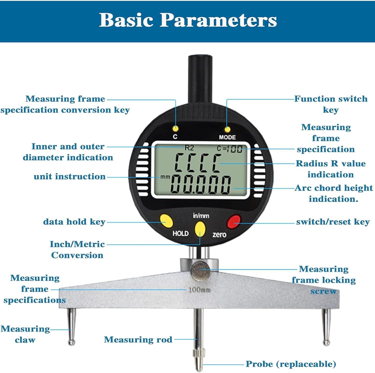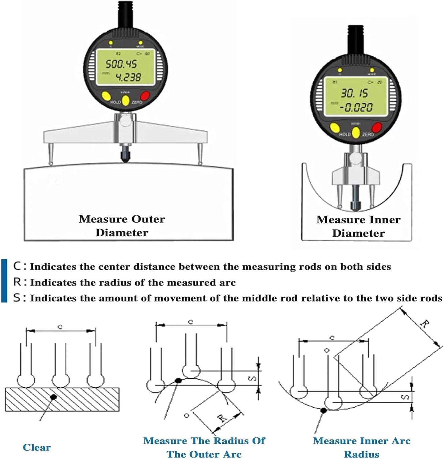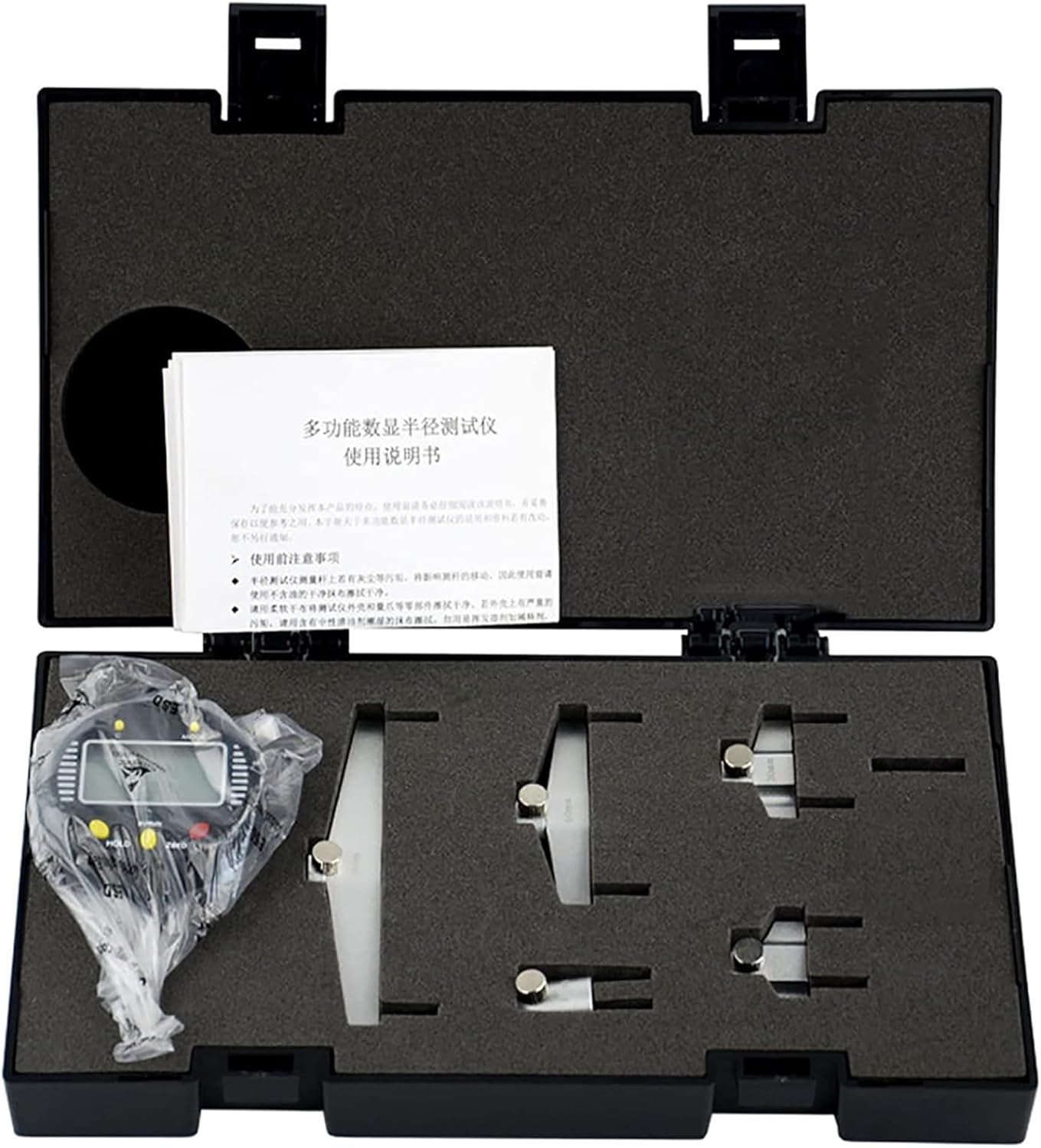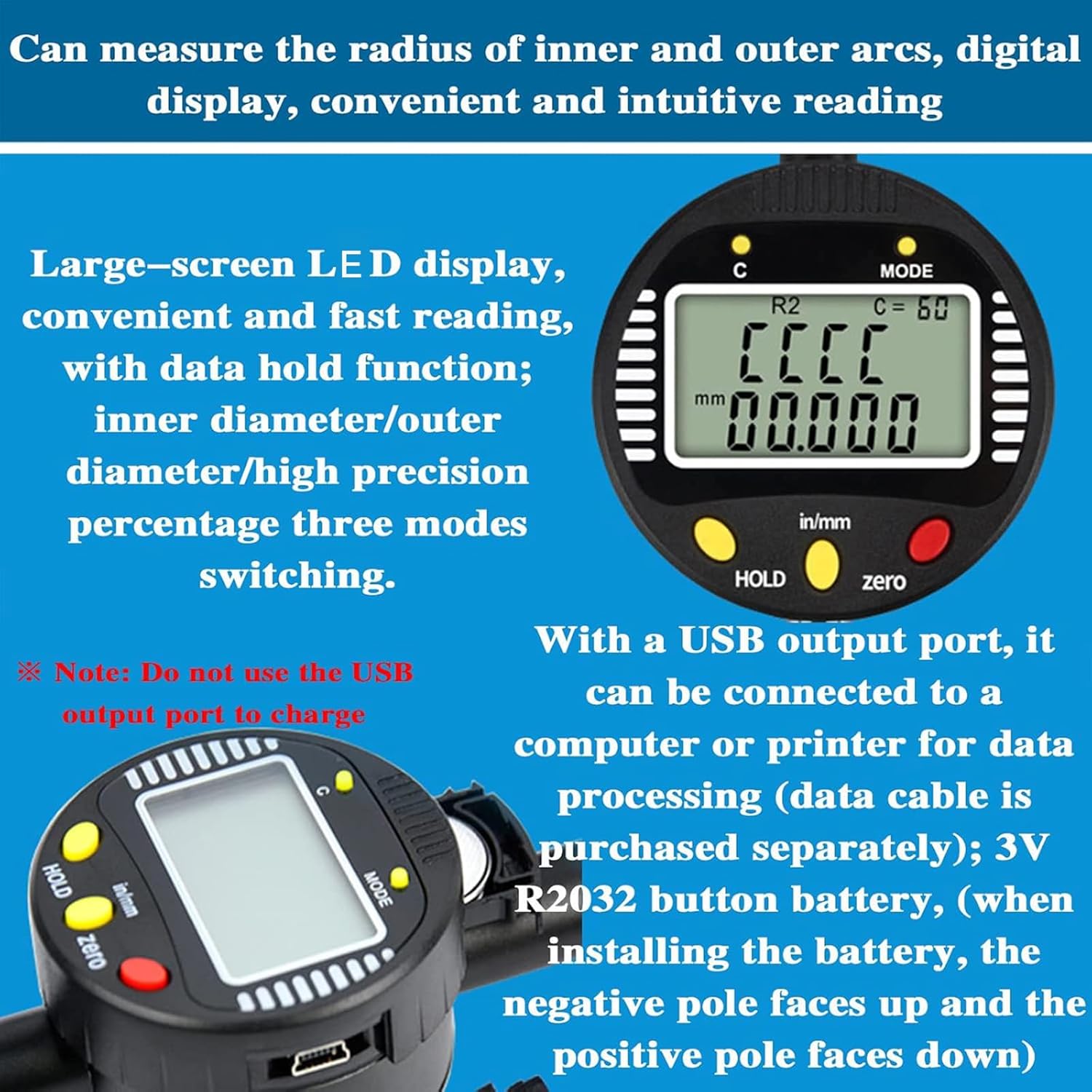【5 ganasce intercambiabili】: 10mm/ 20mm/ 30mm/ 60mm/ 100mm, è possibile scegliere le ganasce corrispondenti in base alle esigenze di misurazione. 【Display a LED】: Letture a colpo d'occhio, visualizzazione di I.D. e O.D., ganasce di misura, valore del raggio R, unità metriche e imperiali, lunghezza, altezza della corda dell'arco, facile salvataggio dei dati correnti, conversione dell'unità (mm/pollici) e reset. 【Conversione metrica/imperiale】: Commutabile tra millimetri e pollici per un'ampia gamma di misure, caratterizzata da funzionamento semplice, lettura rapida, dimensioni ridotte, facilità di lettura e misurazione portatile. 【Misuratore di raggio digitale ad alta precisione】: Può misurare il raggio esterno e la profondità del raggio interno dell'arco e la lunghezza del passo, con funzione di indicazione della scala digitale, campo di misura: spostamento della lunghezza 0-12,7 mm (0 - 0,5 pollici); risoluzione: 0,005 mm (0,00005 pollici); raggio di misura: 5-700 mm (0,2 - 27,5 pollici). 【Ampia gamma di utilizzi】: Può misurare i raggi esterni e interni degli archi. Dispone di una porta di uscita dati per importare i dati in un computer, che è efficace nella misurazione quotidiana degli archi (come parti meccaniche, stampi in legno, stampi in acciaio da costruzione, ecc.)