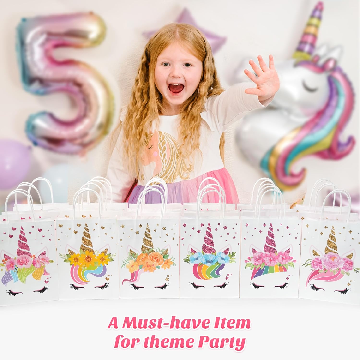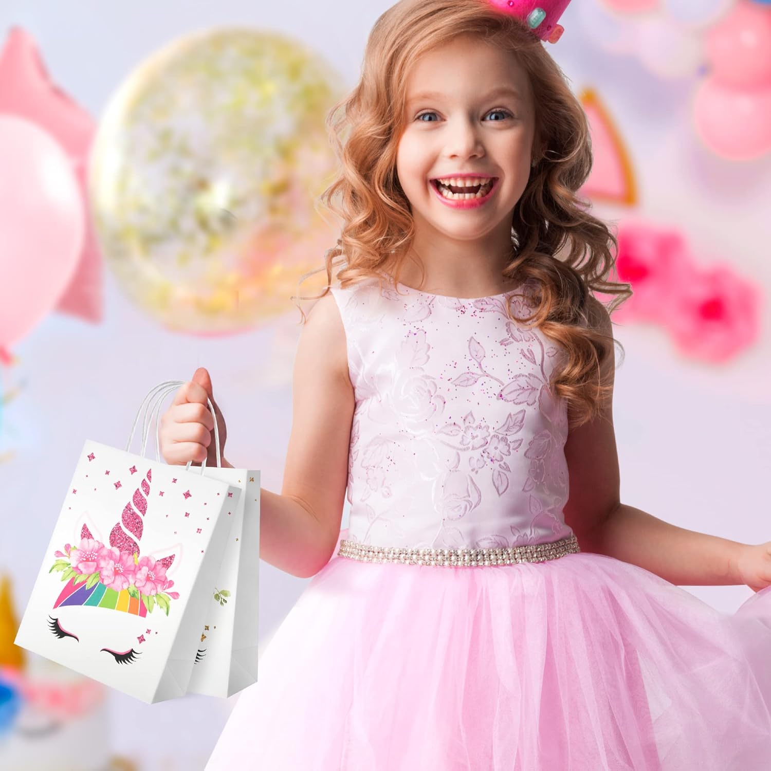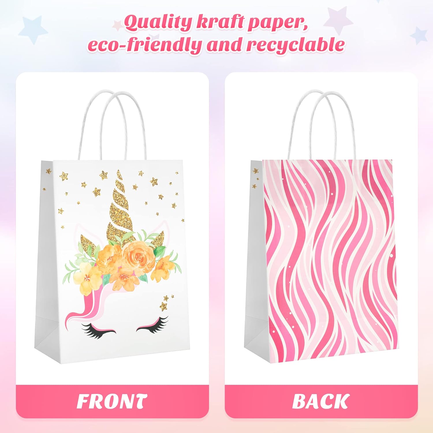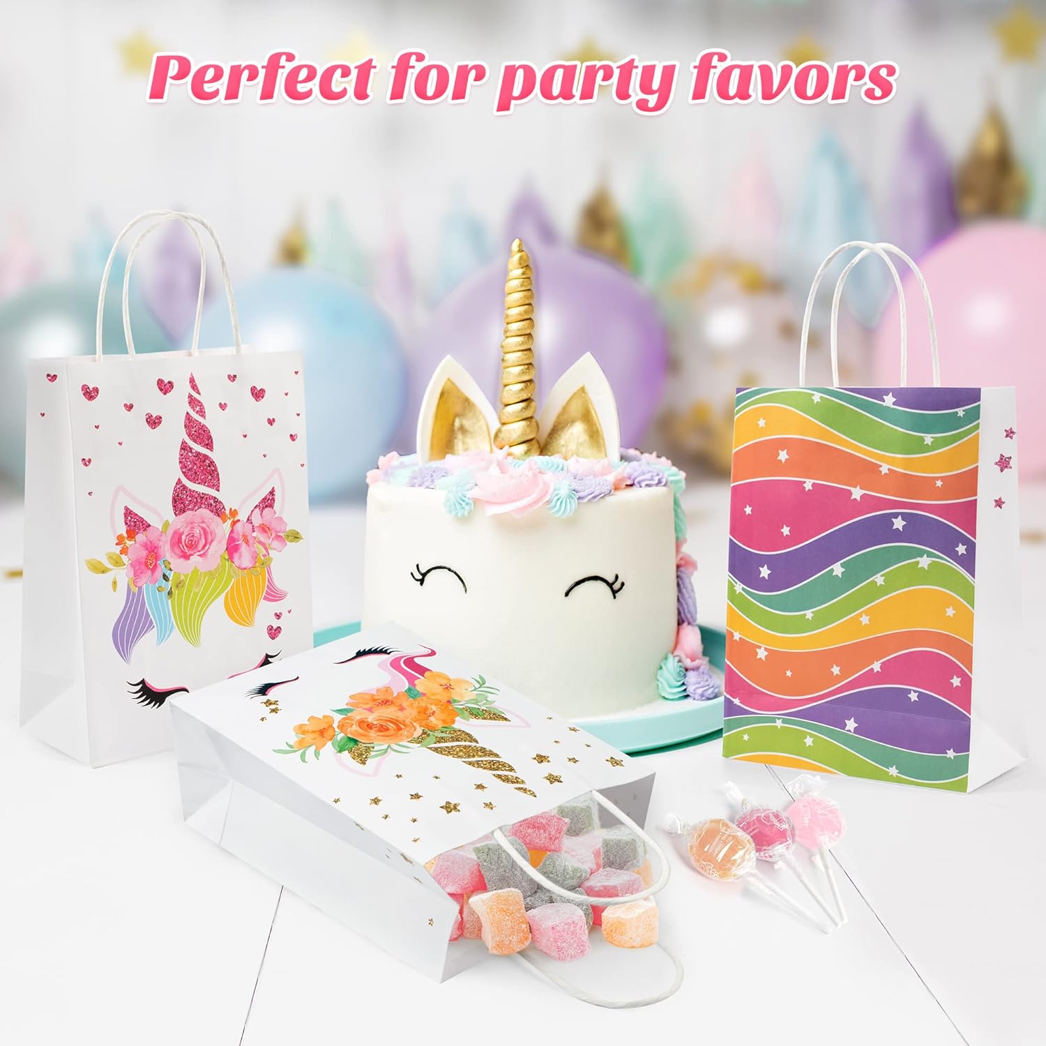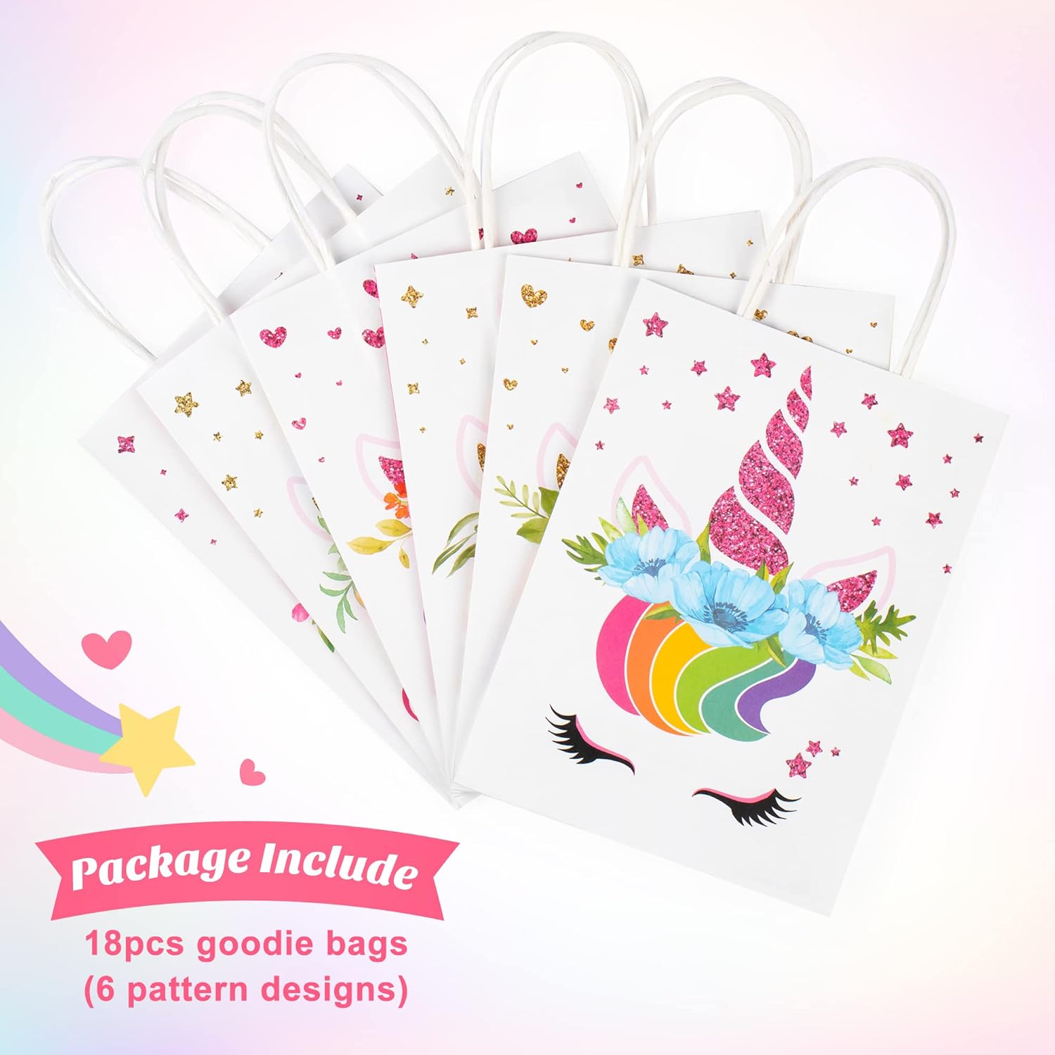 Forniture per feste con unicorno: 18 sacchetti per bomboniere con unicorno con 6 splendidi disegni di unicorno, 3 sacchetti per ogni modello. La dimensione di ciascuna borsa è 6,3 x 3,1 x 8,46 pollici. Abbastanza forte per contenere molti regalini per le feste (caramelle, biscotti, giocattoli, snack, ecc.) ma lascia comunque spazio ai bambini da riempire con altri oggetti personali. La stampa dell'unicorno è così carina e puoi portarla a tante feste a tema diverse. DESIGN A DOPPIO LATO: I nostri sacchetti regalo con unicorno sono progettati con 6 graziosi motivi glitterati. L'adorabile faccia dell'unicorno è stampata sul davanti, il motivo a onde arcobaleno è sul retro. Il design a doppia faccia rende il sacchetto di caramelle più unico. I colori vivaci li renderanno un grande successo tra i bambini. I bambini si divertiranno a scegliere il loro colore o unicorno preferito tra tanti modelli. Materiali riutilizzabili e robusti: le nostre borse da festa con unicorno sono realizzate in carta kraft riciclabile e di alta qualità, ecologica, facile da posizionare e trasportare con maniglie robuste. Più spessi dei normali sacchetti di carta, senza odore, possono essere piegati e conservati per il prossimo utilizzo. Misura ed effetto perfetti per esaltare il valore del regalo. Non importa dove vengono posizionate le borse da festa, creano fantastiche decorazioni per le feste. Perfetto come bomboniera: gli unicorni non invecchiano mai. Questi sacchetti per dolcetti con unicorno sono un ottimo acquisto per bomboniere. I colori vivaci e i motivi sono stati molto apprezzati dai bambini. I bambini adoreranno ricevere questi sacchetti per bomboniere con stampa pony e saranno entusiasti di scoprire cosa li attende al loro interno. Porta tanto divertimento alla tua festa. La dimensione perfetta può ospitare regali di diverse dimensioni. Ampie applicazioni: i nostri sacchetti regalo con unicorno sono unici in quanto ci offrono una vasta gamma di opzioni per tutti i tipi di celebrazioni. Sono adatti come sacchetti regalo di compleanno, sacchetti di caramelle, sacchetti per bomboniere, sacchetti per gioielli, ecc. Possono essere utilizzati per feste di compleanno a tema unicorno, baby shower, dispense per le classi scolastiche, campeggio, vacanze, Pasqua, Natale, ecc.