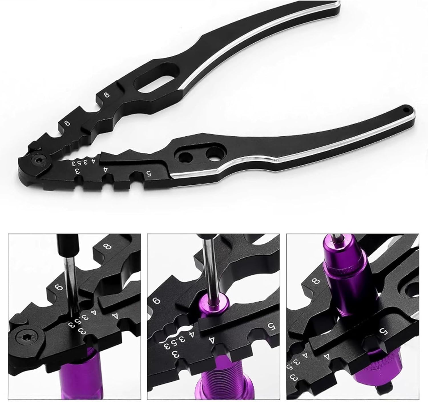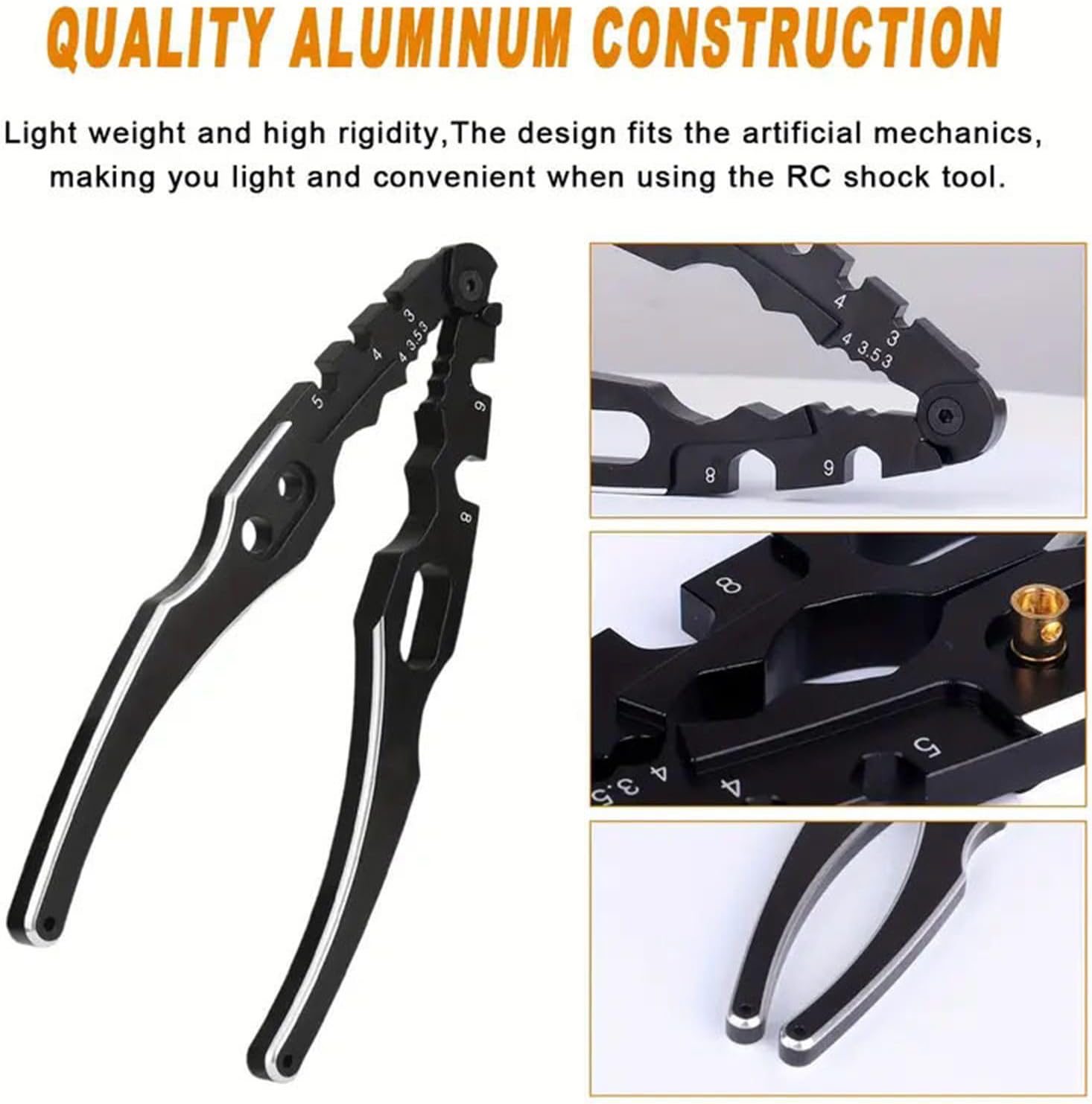 Perfetto compagno di officina per la riparazione di sistemi di sospensione, il miglioramento del crawler o la composizione di componenti shock sia per hobby interni che per ambienti di corse all'aperto Il suo design facile da trasportare combina funzioni essenziali, tra cui il morsetto per pozzetti e la manipolazione dell'articolazione della palla, ottimizzati per una memorizzazione efficiente dello spazio nei trombi del telecomando Ideale per gli appassionati di telecomandi che mantengono fuoristrada o crawler che necessitano di uno strumento professionale per regolare e modificare gli ammortizzatori Progettato con perno a vite rimovibile e supporto antiurto Questo strumento dotato di ammortizzatori metallici multifunzione