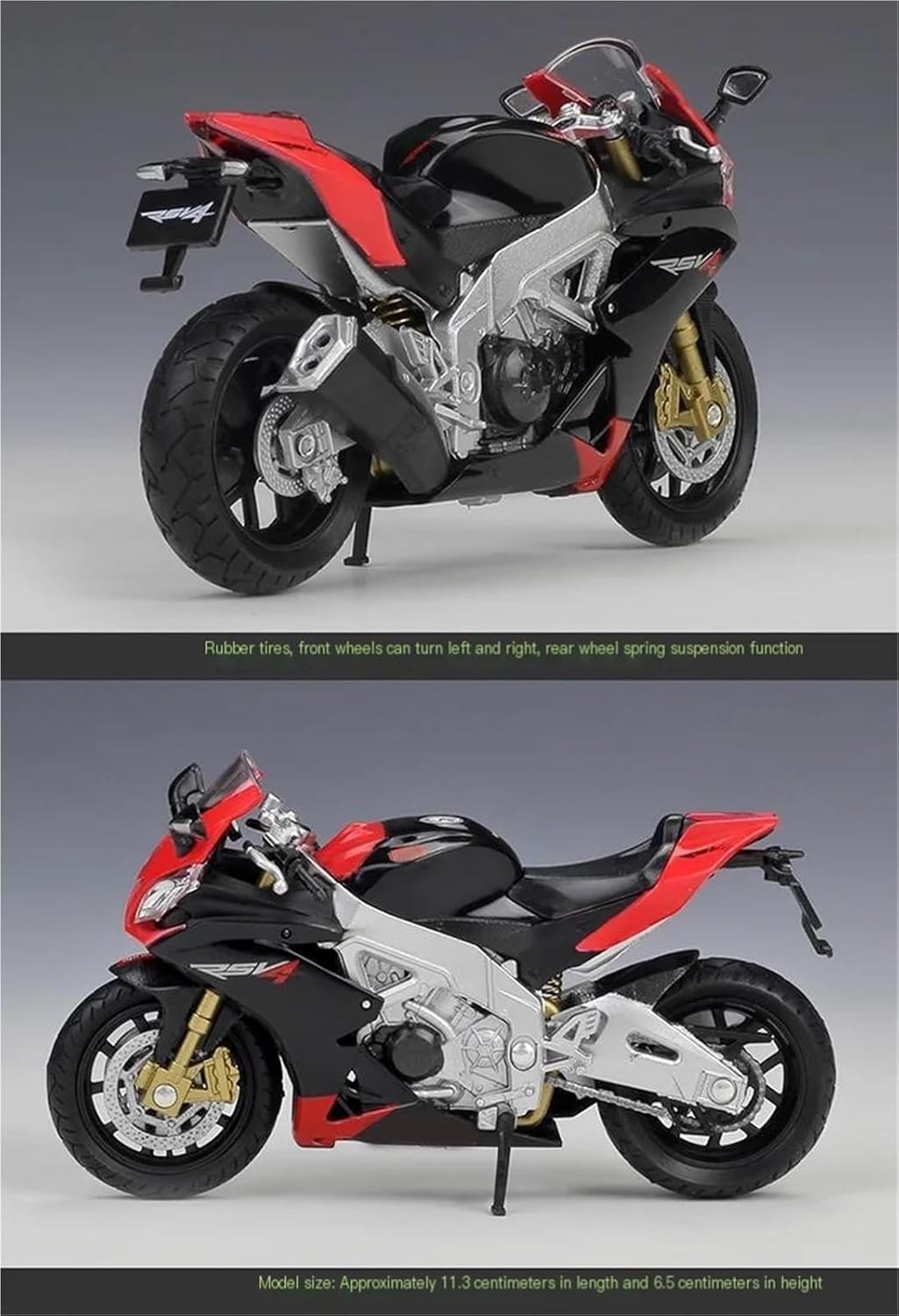 Modello di motocicletta per RSV4 RSV 4 Factory Il modello di motocicletta è un modello squisito realizzato in stretta conformità con la forma, la struttura, il colore, gli interni e altre proporzioni del veicolo originale. È un modello in miniatura del veicolo originale ed è progettato per riprodurre l'aspetto del veicolo originale. Modello di motocicletta di simulazione Modelli di auto giocattolo per motociclette 1:18, stile vivido, pieno di personalità. Realizzato in resistente lega di zinco, è resistente alle cadute e all'usura, garantendo la durevolezza del modello e la sua lunga conservazione. La finitura della vernice è uniformemente liscia, con colori vivaci e duraturi che resistono allo sbiadimento e alle scheggiature, garantendo un aspetto costantemente brillante.