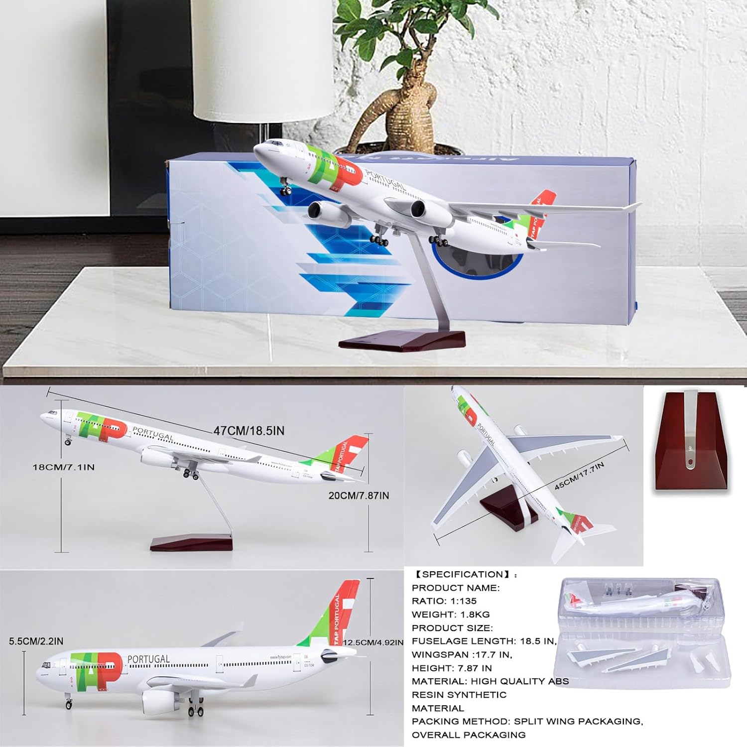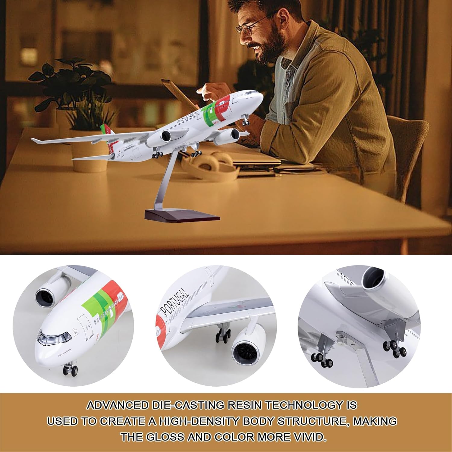 【Design dinamico del motore】: le pale del motore sono finemente scavate e ruotabili manualmente, mostrando un movimento realistico della turbina for un'esperienza aeronautica immersiva. 【Replica di precisione in scala 1:135】: realizzata in scala magistrale for catturare ogni dettaglio autentico dell'A330 della Portugal Airlines, dal carrello di atterraggio alle marcature della fusoliera, utilizzando materiale ABS ecologico for una maggiore durata. 【Illuminazione intelligente】: luci attivate dal suono: basta battere le mani o toccare il modello for illuminare i finestrini della cabina e i motori. Ricaricabile tramite USB (compatibile con i caricabatterie Android standard; caricabatterie non incluso), eliminando le batterie usa e getta. 【Finitura Premium】: la vernice spray ad alta saturazione e antipolvere garantisce colori vivaci e resistenti allo sbiadimento e una superficie perfettamente liscia e priva di granulosità, migliorando la profondità visiva. 【Versatilità espositiva】: include un supporto espositivo in lega e simil-palissandro for una presentazione elegante. Le ruote scorrono fluidamente e si staccano for un allestimento flessibile come centrotavola da scrivania o come oggetto da collezione su scaffale.