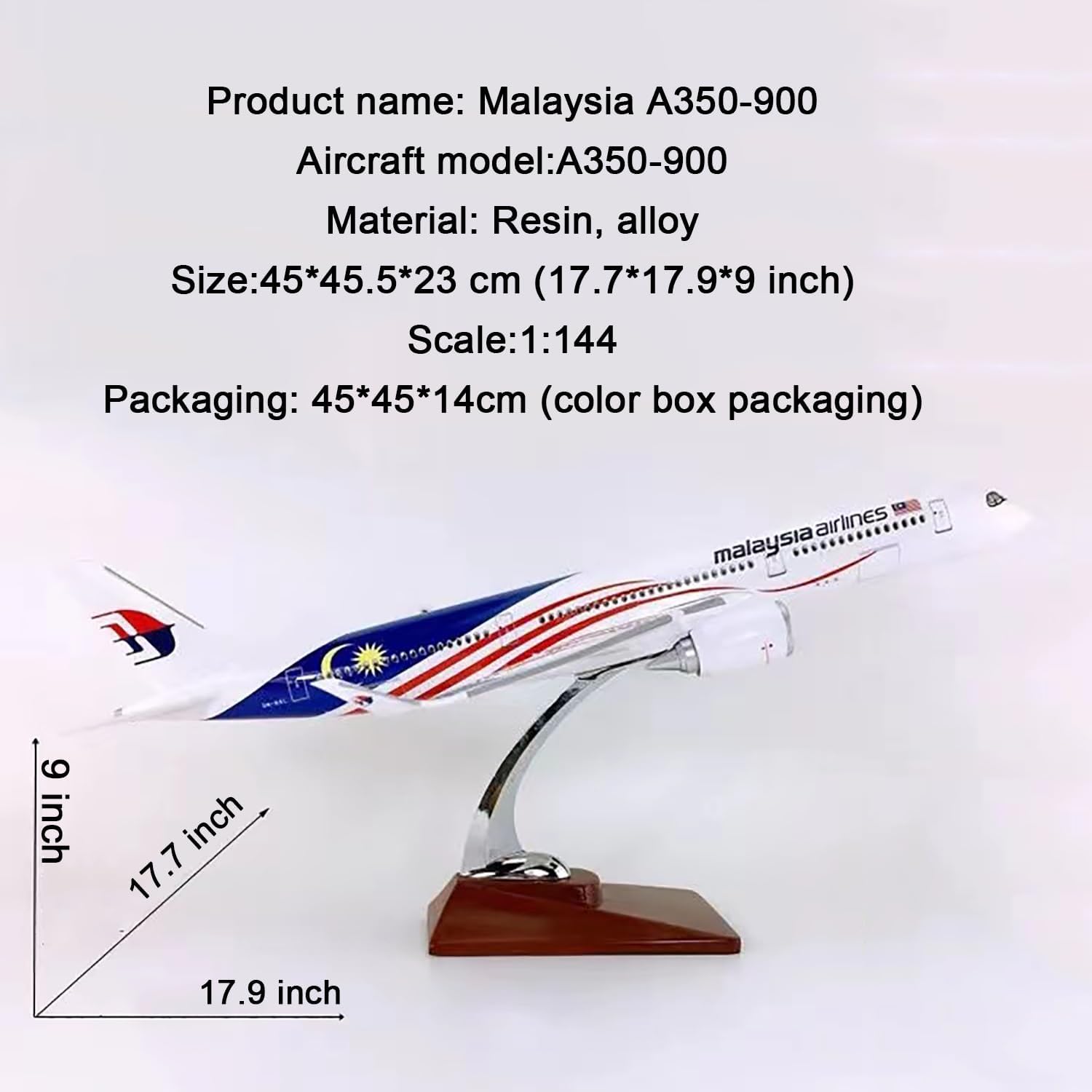 Aeroplano modello: 17,7 pollici 1:144 scala modello Jet modello aereo Malaysia A350-900 con ruote modello aereo, 17,7 * 17,9 * 9 pollici. Materiale Resina Lega ABS Collezionabili pressofusi: meticolosa attenzione ai dettagli, dalla piastra motore alla vernice, utilizzando resina di alta qualità, base solida e staffe metalliche. I modelli sono fedeli alla scala, i modelli sono realizzati in materiale di resina pesante di alta qualità che ha un aspetto fantastico, i modelli sono fusoliera solida Facile da montare: il modello con design a scatto semplice può essere facilmente installato in soli tre passaggi, il design a scatto consente di assemblare i nostri modelli con facilità, meno tempo for montarli e più tempo for mostrarli, i modelli sono dotati di un supporto espositivo, i modelli sono fantastici come souvenir o regali for una persona speciale Dimensioni in scala realistiche: stampo di vernice di prima classe accurata, rifinita secondo rigorosi dettagli alle proporzioni originali, utilizzando la tecnologia di modellazione 3D prefabbricata monoblocco, processo di abbinamento dei colori di placcatura anodizzata, dettagli visibili Regalo da collezione: il modello di aeroplano simulato è dotato di una staffa a piedistallo, che può essere esposta in qualsiasi momento. È un'eccellente collezione for gli appassionati di veri modelli di aeroplani, un'eccellente decorazione for la tua casa, ufficio e bancone e un eccellente regalo di compleanno di Natale for gli amici