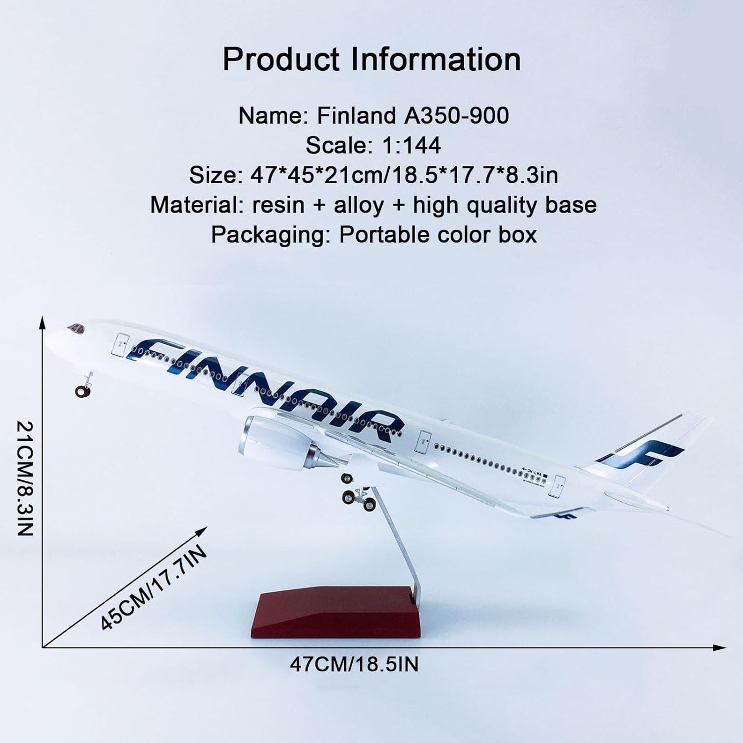 Aeromodello: 18,5 pollici 1:144 scala modello Jet modello aereo Finlandia A350-900 con ruote modello aereo, 18,5 x 17,3 x 8,3 pollici. Materiale Resina Lega ABS Collezionabili pressofusi: meticolosa attenzione ai dettagli, dalla piastra motore alla vernice, utilizzando resina di alta qualità, base solida e staffe metalliche. I modelli sono fedeli alla scala, i modelli sono realizzati in materiale di resina pesante di alta qualità che ha un aspetto fantastico, i modelli sono fusoliera solida Facile da montare: il modello con design a scatto semplice può essere facilmente installato in soli tre passaggi, il design a scatto consente di assemblare i nostri modelli con facilità, meno tempo for montarli e più tempo for mostrarli, i modelli sono dotati di un supporto espositivo, i modelli sono fantastici come souvenir o regali for una persona speciale Dimensioni in scala realistiche: stampo di vernice di prima classe accurata, rifinita secondo rigorosi dettagli alle proporzioni originali, utilizzando la tecnologia di modellazione 3D prefabbricata monoblocco, processo di abbinamento dei colori di placcatura anodizzata, dettagli visibili Regalo da collezione: il modello di aeroplano simulato è dotato di una staffa a piedistallo, che può essere esposta in qualsiasi momento. È un'eccellente collezione for gli appassionati di veri modelli di aeroplani, un'eccellente decorazione for la tua casa, ufficio e bancone e un eccellente regalo di compleanno di Natale for gli amici