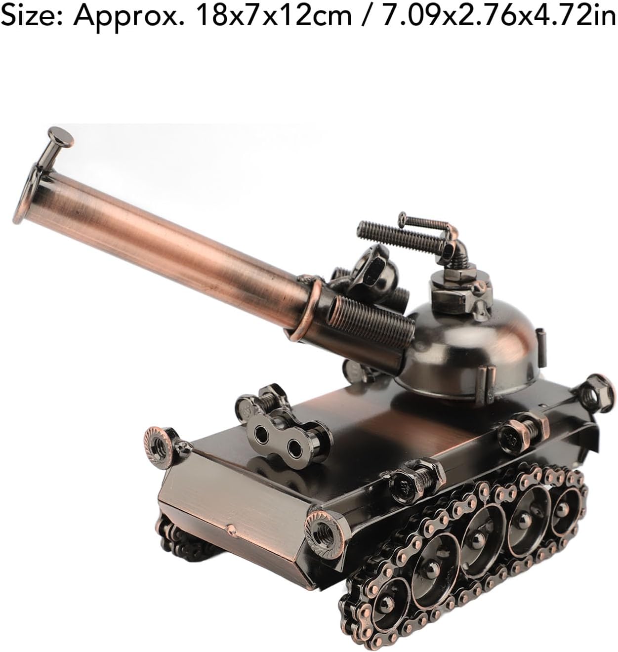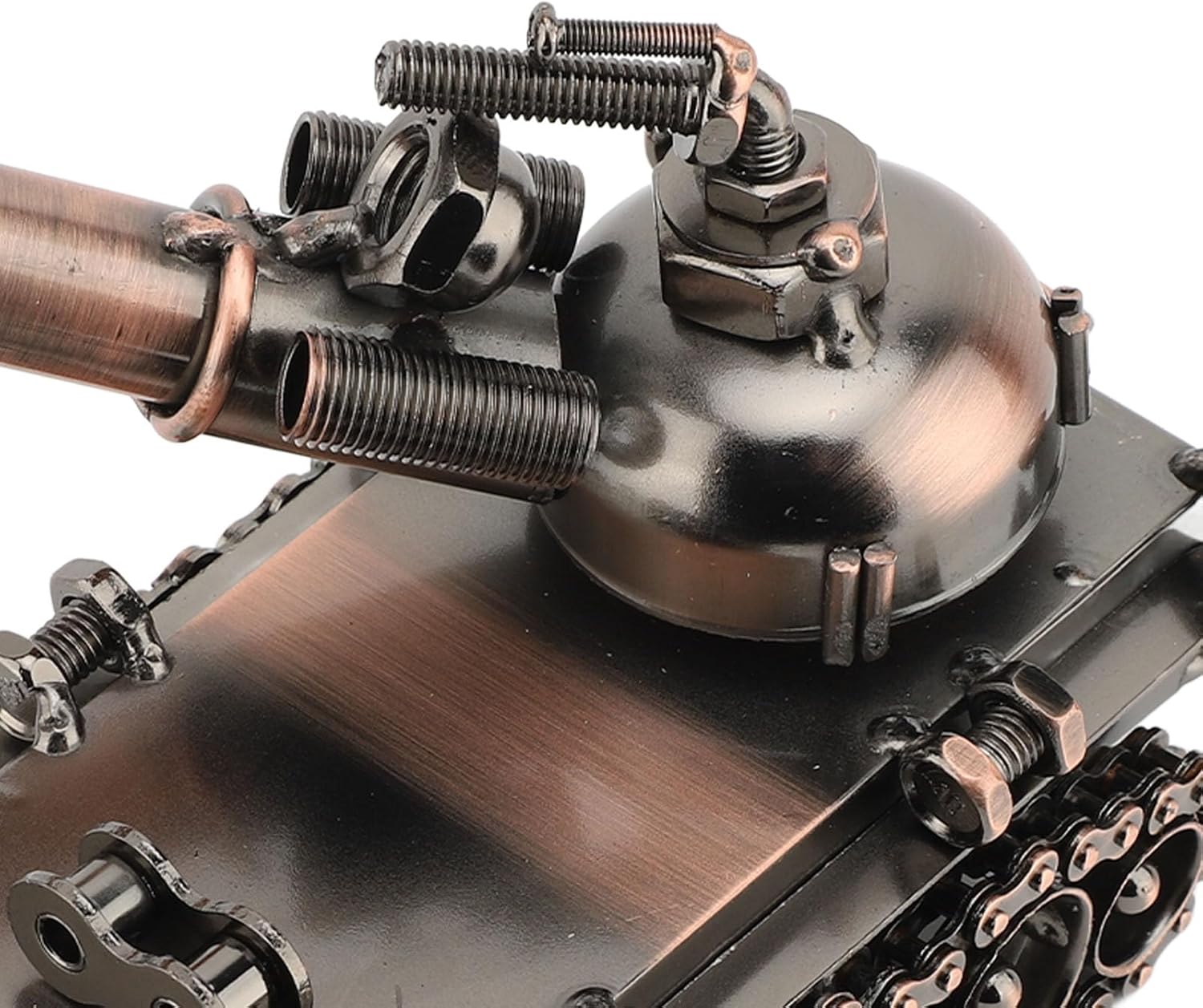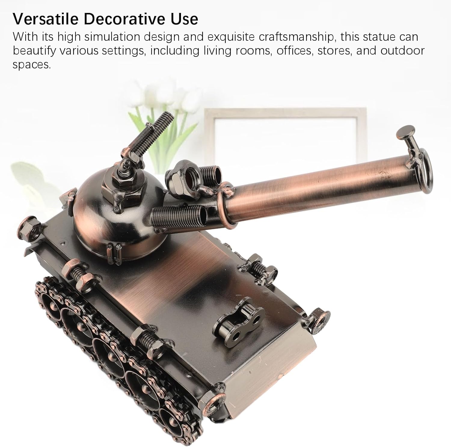 Design eccezionale: il nostro modello di carro armato offre eccellente fattura e fascino estetico, rendendolo una scultura delicata che ogni adulto e bambino adorerà. Arte artigianale: ogni componente di questo serbatoio in ferro, dai pneumatici alle catene e ai bulloni, è meticolosamente saldato a mano per garantire un pezzo d'arte in metallo di alta qualità. Elegante decorazione da tavolo: posiziona questa affascinante scultura sulla tua scrivania, soggiorno o camera da letto per migliorare il tuo spazio con un tocco di arte e originalità. Uso decorativo versatile: con il suo design ad alta simulazione e la squisita fattura, questa statua può abbellire vari ambienti tra cui soggiorni, uffici, negozi e spazi esterni. Dimensioni: ca. 18x7x12 cm / 7,09x2,76x4,72 pollici