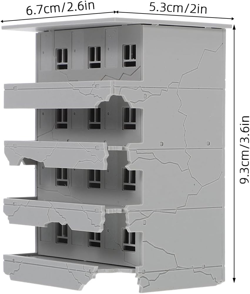 Dettagli realistici in rovina: il modello in miniatura dell'edificio danneggiato lo rende perfetto per gli appassionati di che cercano modelli architettonici per diorami e decorazioni fai da te per tavoli di sabbia Oggetto da collezione salvaspazio: progettato in una scala compatta 1:144, questo edificio di case in rovina si adatta perfettamente a qualsiasi collezione, consentendoti di esporre miniature di edifici danneggiati senza occupare troppo spazio Esperienza di assemblaggio interattiva: il modello di tavolo di sabbia fai da te incoraggia la creatività e le abilità pratiche, offrendo alle famiglie un modo coinvolgente per costruire e decorare insieme il proprio micro paesaggio ornamentale Aggiunta di scenari versatili: migliora i tuoi scenari ferroviari, le rovine delle città o i giochi da tavolo con questo modello di edificio in plastica, aggiungendo un'atmosfera drammatica e un interesse visivo a qualsiasi scena Materiale plastico: realizzato in plastica, il modello architettonico gli appassionati a personalizzare il loro modello di edificio bombardato in rovina o di rovine sbriciolate, consentendo infinite possibilità di progettazione