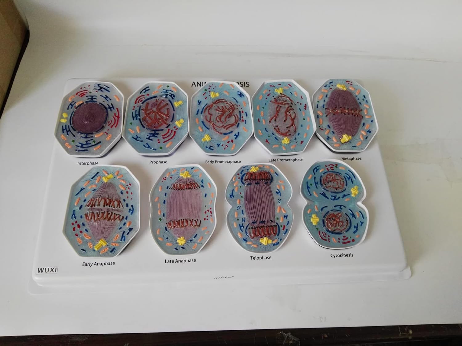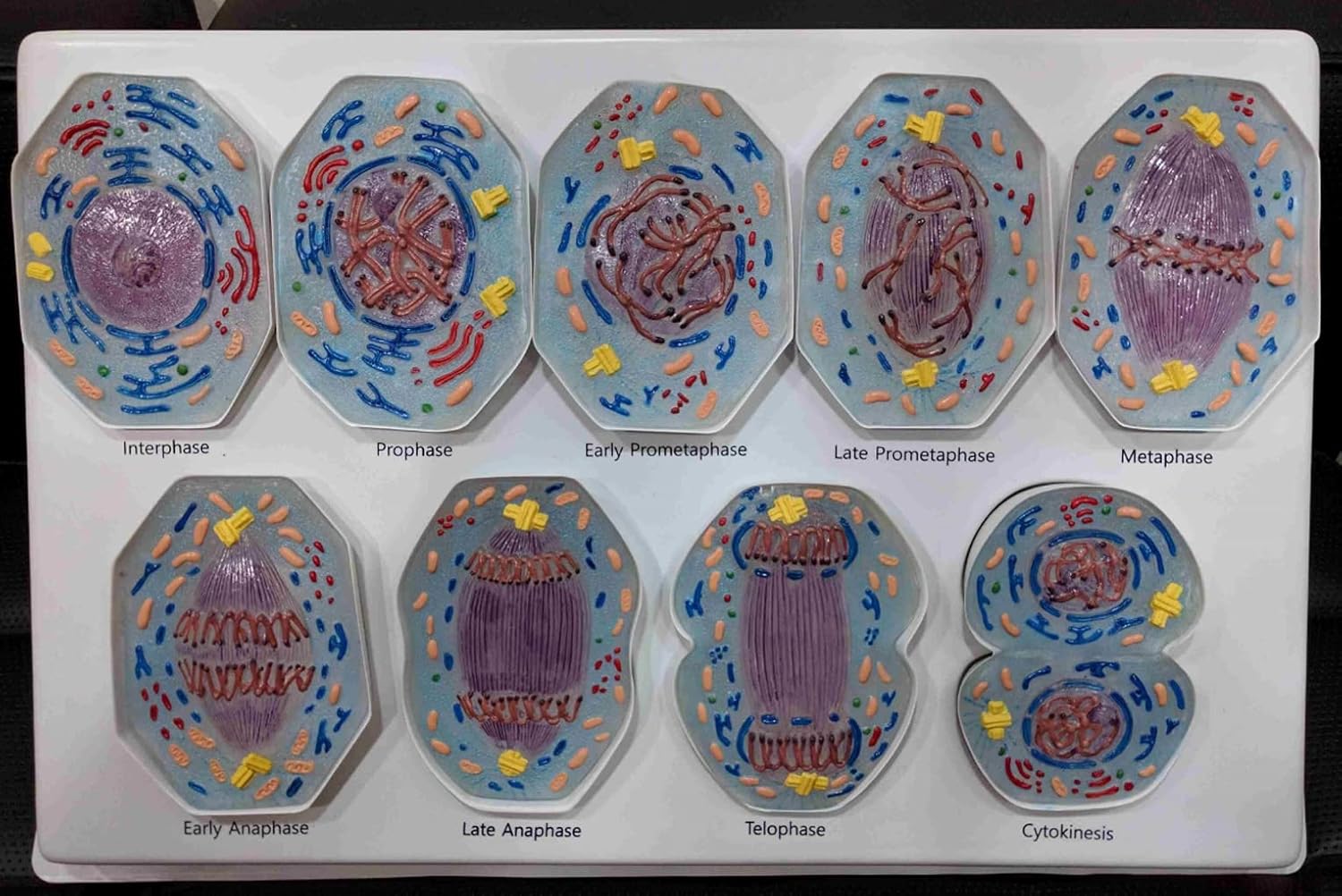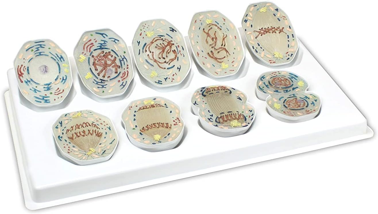 Three-Dimensional mitosis model series for study of 9-phase cell division process Study of typical mammal cell at an enlargement of 10,000x for life size demonstration Detailed open cell organelles for easy teaching identification Coloured according to microscopy and biology standards for accurate teaching identification Pieces equipped with polyethylene stand for easy attachment and display