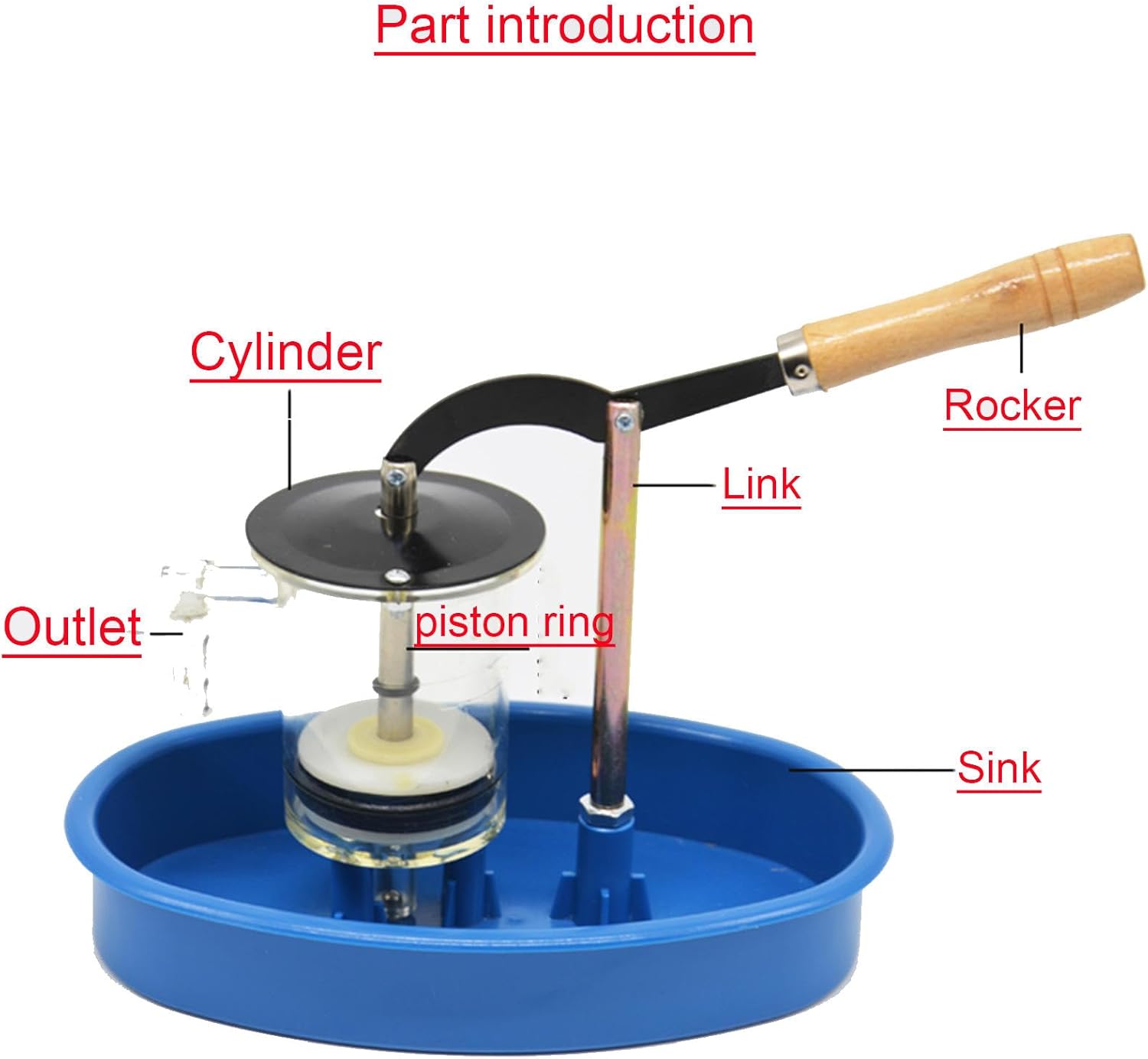 Il modello di pompa è utilizzato per la dimostrazione didattica della fisica nella scuola media e per esperimenti di gruppo. È utilizzato principalmente per spiegare la struttura e il principio della pompa di aspirazione. Struttura: 1. Lavandino 2. Asta di supporto 3. Blocco cilindri 4. Leva del bilanciere 5. Biella 6. Ugello di uscita dell'acqua 7. Valvola di uscita dell'acqua 8. Pistone e fascia elastica 9. Valvola di ingresso Durante l'uso, montare lo strumento come indicato in figura, agitare la maniglia su e giù, se non è flessibile, applicare un po' di lubrificante sull'anello del pistone. Quindi aggiungere circa due terzi della profondità del lavandino al lavandino, scuotere la maniglia e l'acqua verrà pompata continuamente verso l'alto per fuoriuscire dall'acqua. Felice e facile da imparare, esercita le tue capacità pratiche da studente.