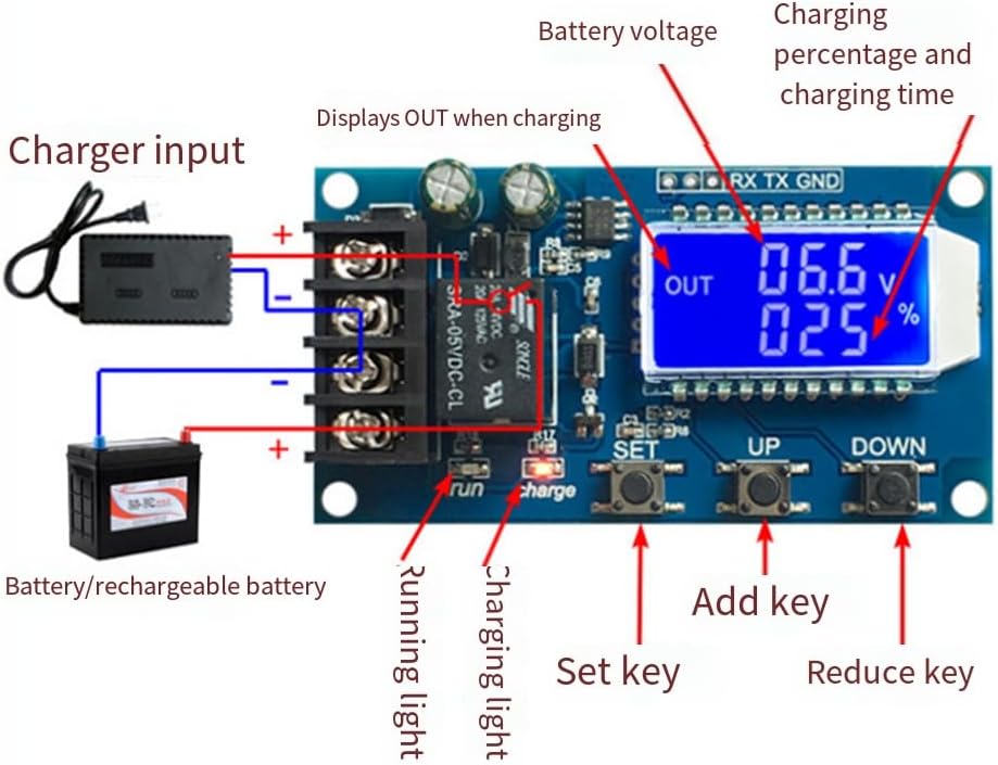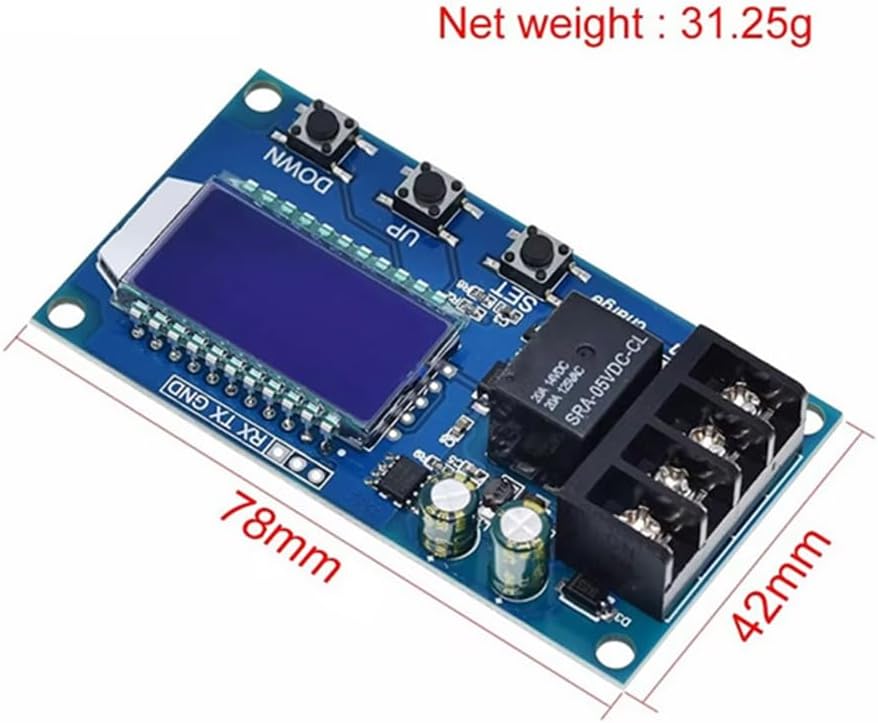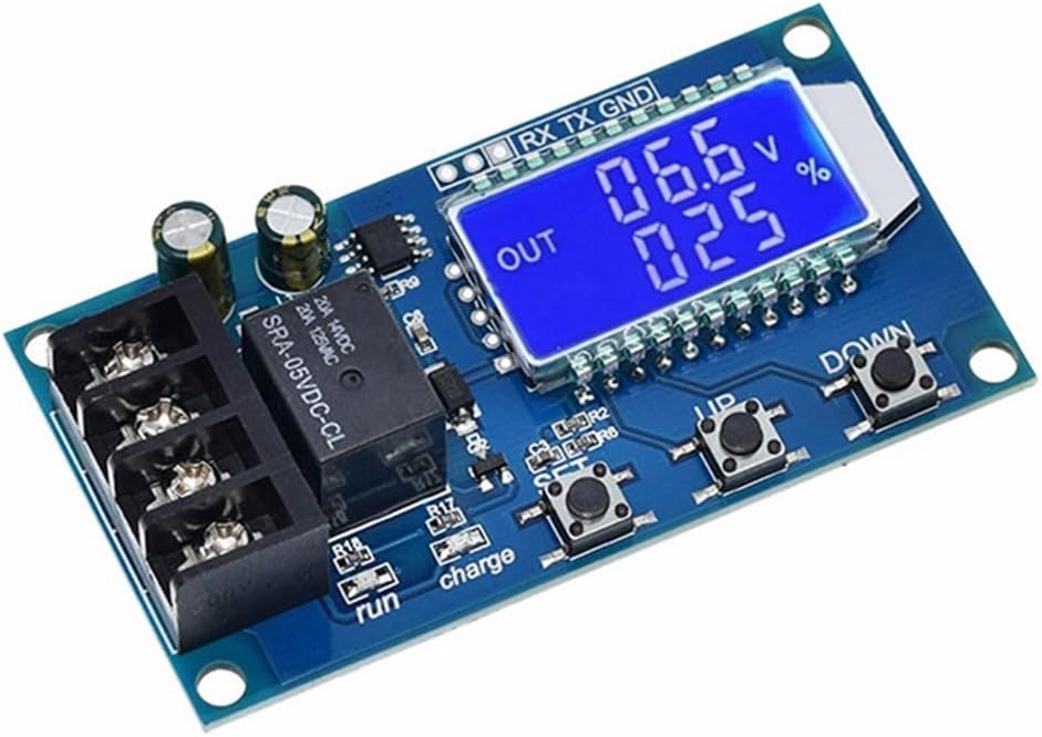 1. È possibile utilizzare qualsiasi batteria da 1,6-60 V e batteria al litio; 4. Il tempo di ricarica può essere controllato; 5. I parametri corrispondenti possono essere impostati e caricati tramite la porta seriale; Nome del prodotto: modulo di ricarica CNC; Modello del prodotto: XY-L10A; Tensione di controllo: DC6-60V; Corrente di controllo: ≤10A; Precisione di controllo: 0,1 V; Tipo di output:output diretto; Colore:blu; Materiale: metallo + plastica 2. Display LCD, tensione della batteria, percentuale di carica e tempo di carica sono chiari a colpo d'occhio; 3. La funzione è molto potente e può controllare automaticamente la ricarica. Descrizione: 1. Descrizione della funzione; a)Funzione di controllo automatico della carica: Impostando la tensione limite superiore UP e la tensione limite inferiore ; la tensione della batteria ≤ alla tensione limite inferiore , il relè si accende e il caricabatterie inizia a caricare la batteria; la tensione della batteria ≥ alla tensione limite superiore UP, il relè si spegne per completare una carica automatica;