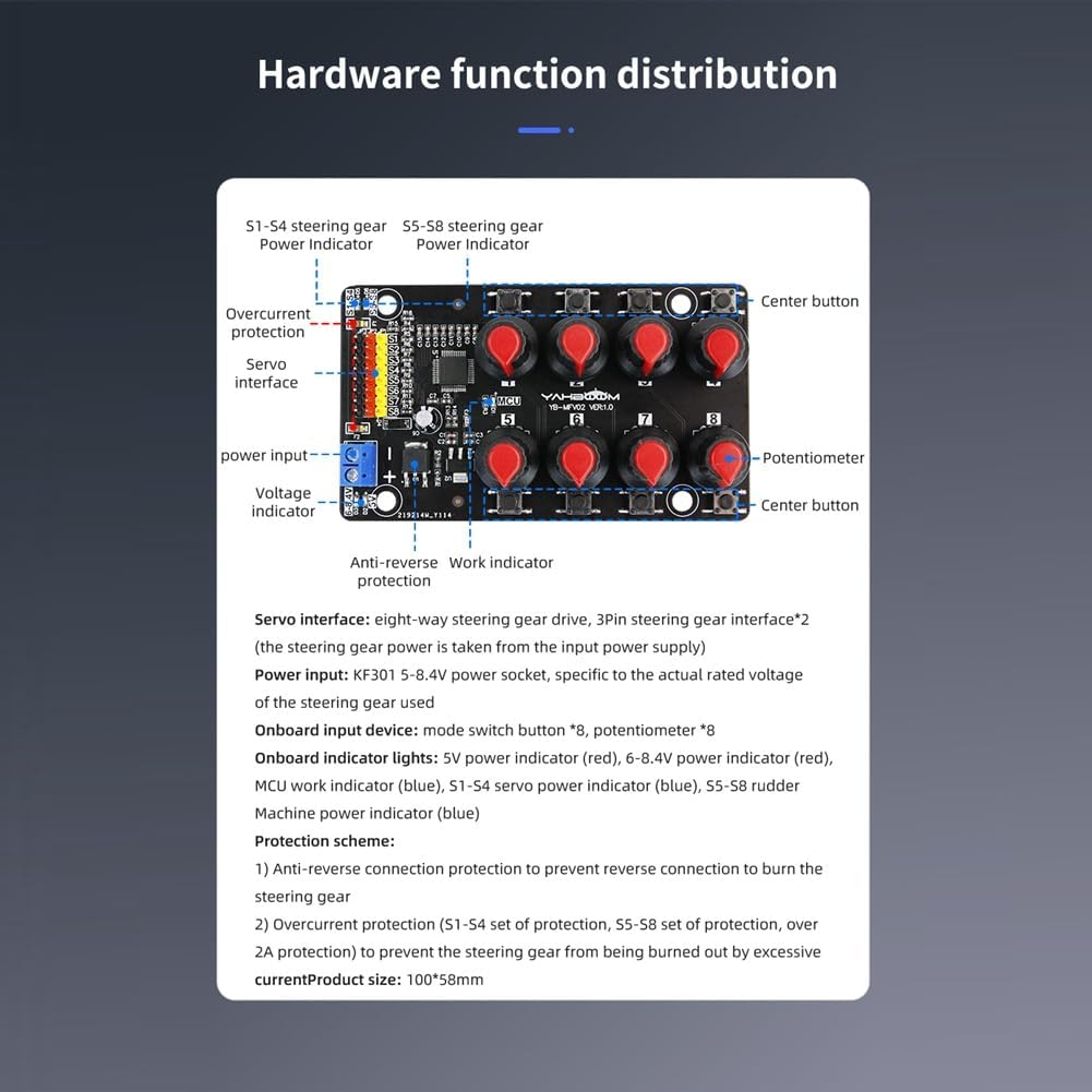3. Supporta il manuale e il ritorno al centro, che possono essere commutati tramite funzione 4. Precisione del controllo dello sterzo: 0,09 gradi (valore minimo di variazione di IE Pwm 1us) 2. L'MCU maturo integrato a 8 bit viene utilizzato per generare segnali PWM ad alta definizione e controllare pr?zise. Caratteristiche: 1. Utilizzate potenziometri ad alto pr?zise, programmazione necessaria, potenziometri a 8 canali e servo controllati in corrispondenza a ; controller servo a 8 canali, adatto per il debug e il test di servo da 5 V a 8,4 V, supporta la regolazione manuale/centratura rapida/protezione passing stream 5. di controllo supportato: 20 ms, larghezza impulso: 0,5 ms-2,5 ms; morsettiera (5 V-8,4 V) connettore di alimentazione con funzione di protezione da corrente .