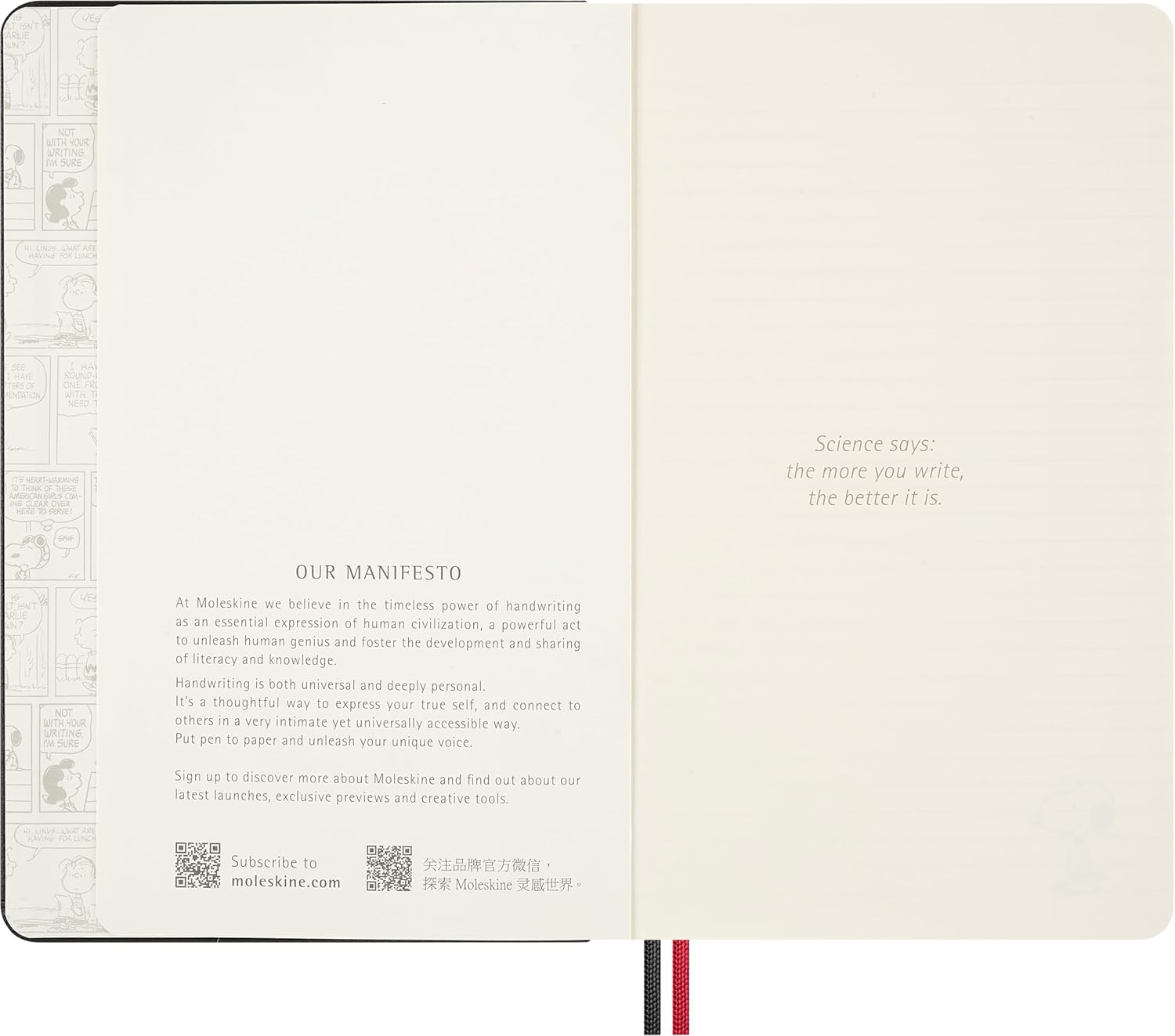 DESIGN: Scopri questo taccuino con copertina rigida, illustrazioni dei Peanuts e una citazione che celebra la gioia descrivono PRATICITÀ: Il taccuino è dotato di una tasca interna espandibile personalizzata sul retro, l'iconica etichetta "in case of loss", e all'interno presenta tutta la storia di Moleskine QUALITÀ PREMIUM: il taccuino è realizzato in carta avorio acid-free (100 g/m²), proveniente da foreste gestite in modo sostenibile SET REGALO: La confezione include un taccuino, segnalibro e adesivi a tema, idea regalo per gli appassionati dell'iconico Peanuts PEANUTS X MOLESKINE: questa collezione non solo incarna il fascino senza tempo dei Peanuts, ma evidenzia anche i comprovati benefici cognitivi della scrittura a mano